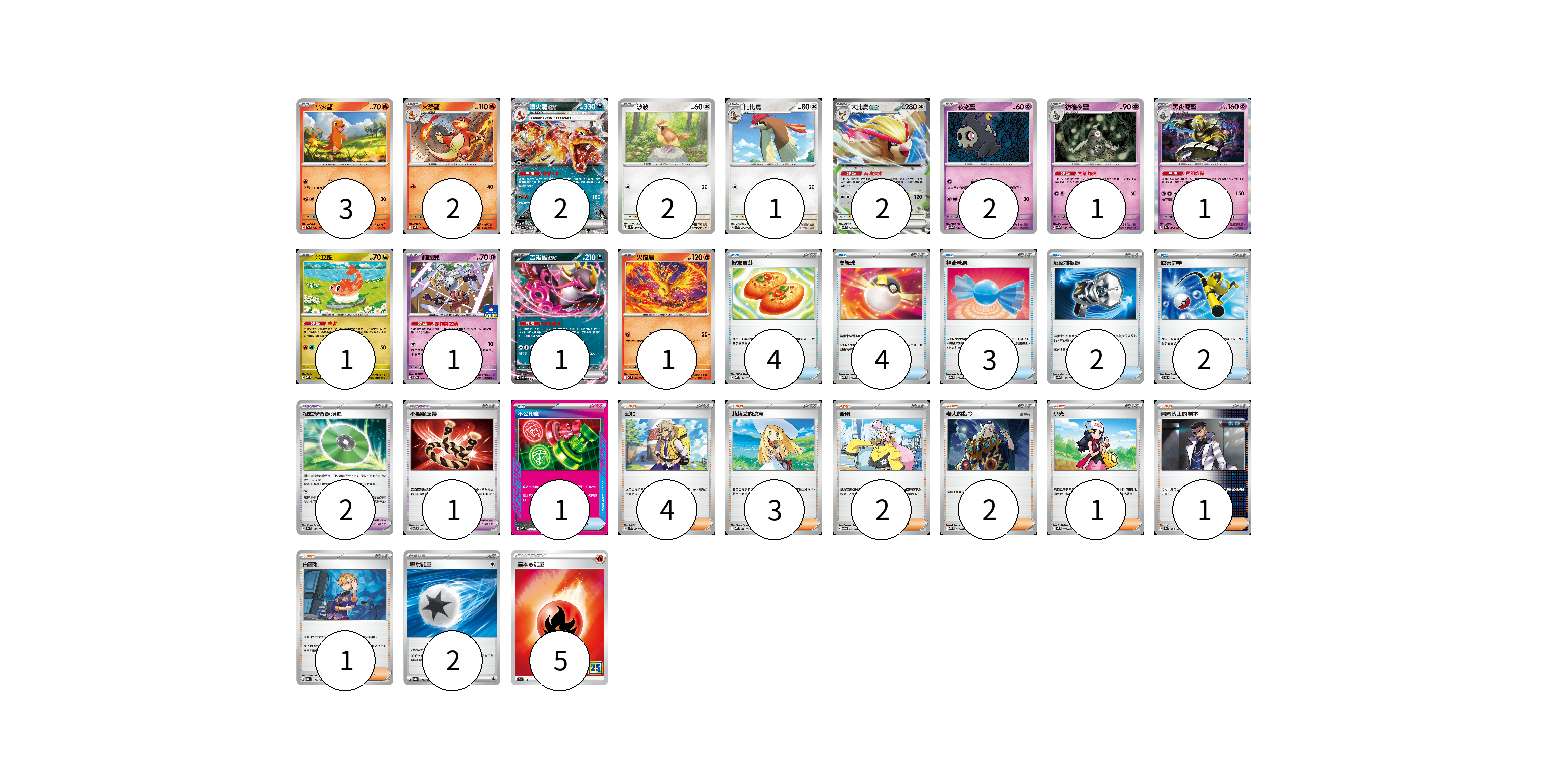 牌組構築方案 以此牌組為基礎新構築牌組 顯示卡面 顯示列表 寶可夢卡(20) 3 2 2 2 1 2 2 1 1 1 1 1 1 寶可夢道具(3) 2 1 物品卡(16) 4 4 3 2 2 1 支援者卡(14) 4 3 2 2 1 1 1 能量卡(7) 2 5 寶可夢卡(20) 卡牌名稱 張數 卡牌名稱 張數 小火龍 SV2a 004/165 03 火恐龍 M2 012/080 02 噴火龍ex SV4a 115/190 02 波波 SV3 087/108 02 比比鳥 SVK 004/042 01 大比鳥ex SVK 005/042 02 夜巡靈 SV8a 064/187 02 彷徨夜靈 SV8a 065/187 01 黑夜魔靈 SV8a 066/187 01 米立龍 MBD 010/022 01 鑰圈兒 SV-P 089/SV-P 01 吉雉雞ex SVOD 004/020 01 火焰鳥 M2 014/080 01 寶可夢道具(3) 卡牌名稱 張數 卡牌名稱 張數 招式學習器 演進 SV8a 160/187 02 不服輸頭帶 SVTL 016/021 01 物品卡(16) 卡牌名稱 張數 卡牌名稱 張數 好友寶芬 MBD 013/022 04 高級球 MBD 014/022 04 神奇糖果 MBG 013/022 03 反擊捕捉器 SV8a 139/187 02 厲害釣竿 SVOD 010/020 02 不公印章 MBD 011/022 01 支援者卡(14) 卡牌名稱 張數 卡牌名稱 張數 派帕 SVK 035/042 04 莉莉艾的決意 MBD 021/022 03 奇樹 SVOD 016/020 02 老大的指令 MBD 020/022 02 小光 M2 077/080 01 弗圖博士的劇本 SV8a 175/187 01 白蕾雅 SV8a 176/187 01 能量卡(7) 卡牌名稱 張數 卡牌名稱 張數 噴射能量 SV8a 185/187 02 基本火能量 S8a FIR 05 以此牌組為基礎新構築牌組 牌組編碼 VadAGt-zJUaob-zkekIr copy 列印牌組單 牌組編碼已複製 分享至SNS