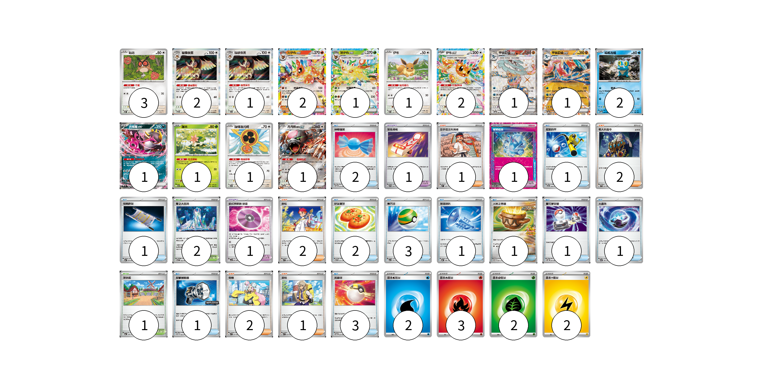 牌組構築方案 以此牌組為基礎新構築牌組 顯示卡面 顯示列表 寶可夢卡(20) 3 2 1 2 1 1 2 1 1 2 1 1 1 1 寶可夢道具(3) 1 1 1 物品卡(17) 2 1 1 2 3 1 1 1 1 1 3 支援者卡(8) 1 2 2 2 1 競技場卡(3) 2 1 能量卡(9) 2 3 2 2 寶可夢卡(20) 卡牌名稱 張數 卡牌名稱 張數 咕咕 SV8a 127/187 03 貓頭夜鷹 SV7 077/102 02 貓頭夜鷹 SV8a 128/187 01 火伊布ex SV8a 022/187 02 葉伊布ex SV8a 003/187 01 伊布 SV8a 125/187 01 伊布ex SV8a 126/187 02 甲賀忍蛙ex SV5a 083/066 01 甲賀忍蛙ex SV5a 045/066 01 呱呱泡蛙 SV5a 023/066 02 吉雉雞ex SV8a 104/187 01 謝米 SV9a 006/063 01 旋轉洛托姆 SV8a 131/187 01 月月熊 赫月 ex SV5a 052/066 01 寶可夢道具(3) 卡牌名稱 張數 卡牌名稱 張數 緊急滑板 SV5K 064/071 01 璀璨結晶 SV7 094/102 01 招式學習器 衰退 SV4K 063/066 01 物品卡(17) 卡牌名稱 張數 卡牌名稱 張數 神奇糖果 SVOD 013/020 02 厲害釣竿 SVTL 009/021 01 夜間擔架 SV6a 056/064 01 好友寶芬 SVTG 011/019 02 巢穴球 SV4a 159/190 03 玻璃喇叭 SV8a 140/187 01 大地之容器 SV-P 084/SV-P 01 寶可夢交替 SVOD 014/020 01 太晶珠 SV8a 145/187 01 反擊捕捉器 SV-P 136/SV-P 01 高級球 SVOD 012/020 03 支援者卡(8) 卡牌名稱 張數 卡牌名稱 張數 空手道王的演練 SVM 146/175 01 老大的指令 SVHM 022/022 02 赤松 SVK 027/042 02 奇樹 SVK 031/042 02 派帕 SVK 035/042 01 競技場卡(3) 卡牌名稱 張數 卡牌名稱 張數 零之大空洞 SV7 102/102 02 深缽鎮 SV4a 185/190 01 能量卡(9) 卡牌名稱 張數 卡牌名稱 張數 基本【水】能量 SVB WAT 02 基本【火】能量 SVF FIR 03 基本【草】能量 SVF GRA 02 基本【雷】能量 SVF LIG 02 以此牌組為基礎新構築牌組 牌組編碼 VgRJpC-dMWVzf-KlMfxg copy 列印牌組單 牌組編碼已複製 分享至SNS