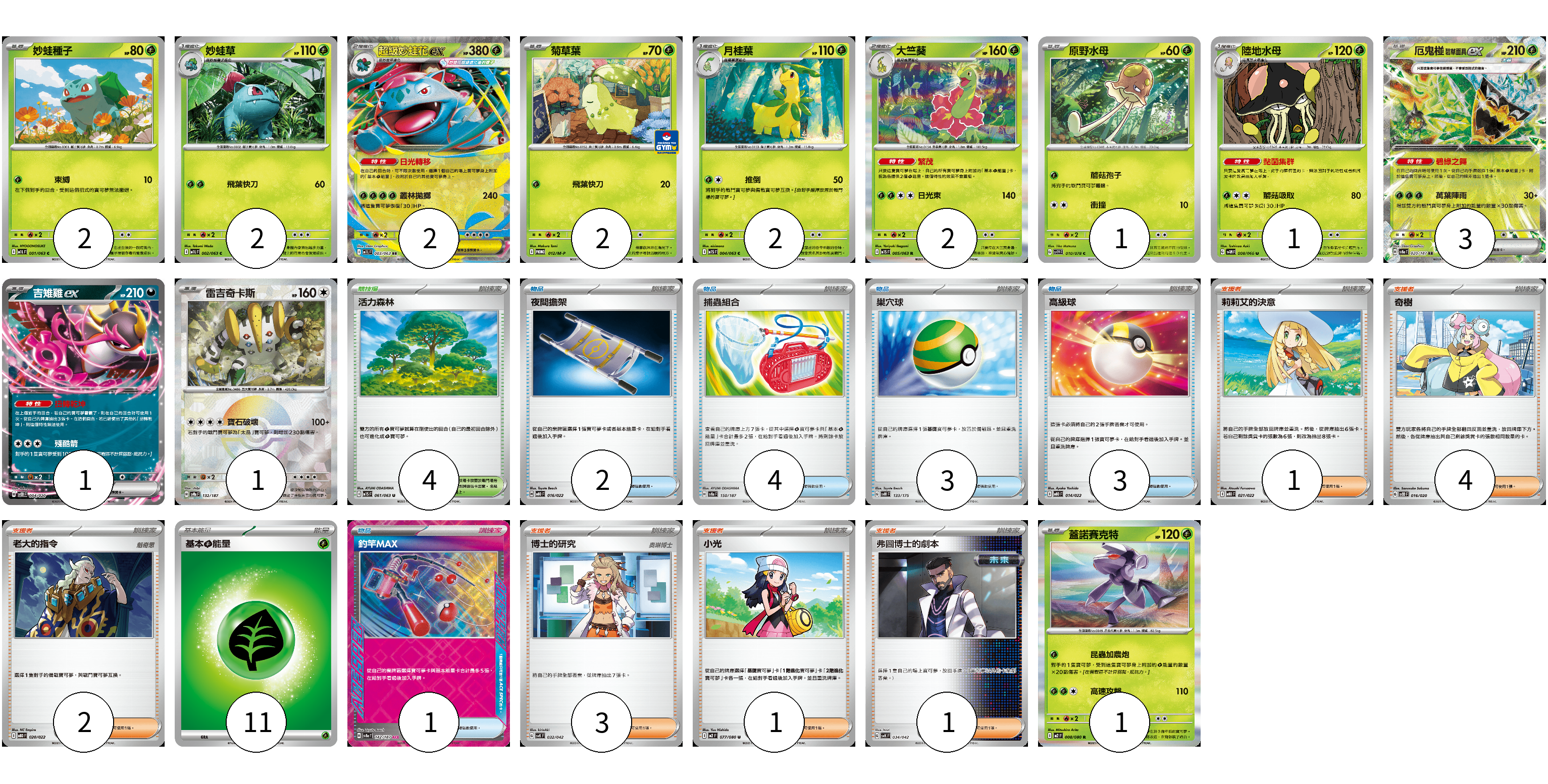 牌組構築方案 以此牌組為基礎新構築牌組 顯示卡面 顯示列表 寶可夢卡(20) 2 2 2 2 2 2 1 1 3 1 1 1 物品卡(13) 2 4 3 3 1 支援者卡(12) 1 4 2 3 1 1 競技場卡(4) 4 能量卡(11) 11 寶可夢卡(20) 卡牌名稱 張數 卡牌名稱 張數 妙蛙種子 M1L 001/063 02 妙蛙草 M1L 002/063 02 超級妙蛙花ex M1L 003/063 02 菊草葉 M-P 012/M-P 02 月桂葉 M1S 004/063 02 大竺葵 M1S 005/063 02 原野水母 SV1V 010/078 01 陸地水母 SV4M 008/066 01 厄鬼椪 碧草面具ex SV8a 020/187 03 吉雉雞ex SVOD 004/020 01 雷吉奇卡斯 SV8a 132/187 01 蓋諾賽克特 M2 008/080 01 物品卡(13) 卡牌名稱 張數 卡牌名稱 張數 夜間擔架 MBD 016/022 02 捕蟲組合 SV8a 150/187 04 巢穴球 SVM 133/175 03 高級球 MBD 014/022 03 釣竿MAX SV8a 142/187 01 支援者卡(12) 卡牌名稱 張數 卡牌名稱 張數 莉莉艾的決意 MBD 021/022 01 奇樹 SVOD 016/020 04 老大的指令 MBD 020/022 02 博士的研究 SVK 032/042 03 小光 M2 077/080 01 弗圖博士的劇本 SVK 034/042 01 競技場卡(4) 卡牌名稱 張數 卡牌名稱 張數 活力森林 M1S 061/063 04 能量卡(11) 卡牌名稱 張數 卡牌名稱 張數 基本【草】能量 M-P GRA 11 以此牌組為基礎新構築牌組 牌組編碼 VnSQtK-EZjfTH-XbpPIb copy 列印牌組單 牌組編碼已複製 分享至SNS