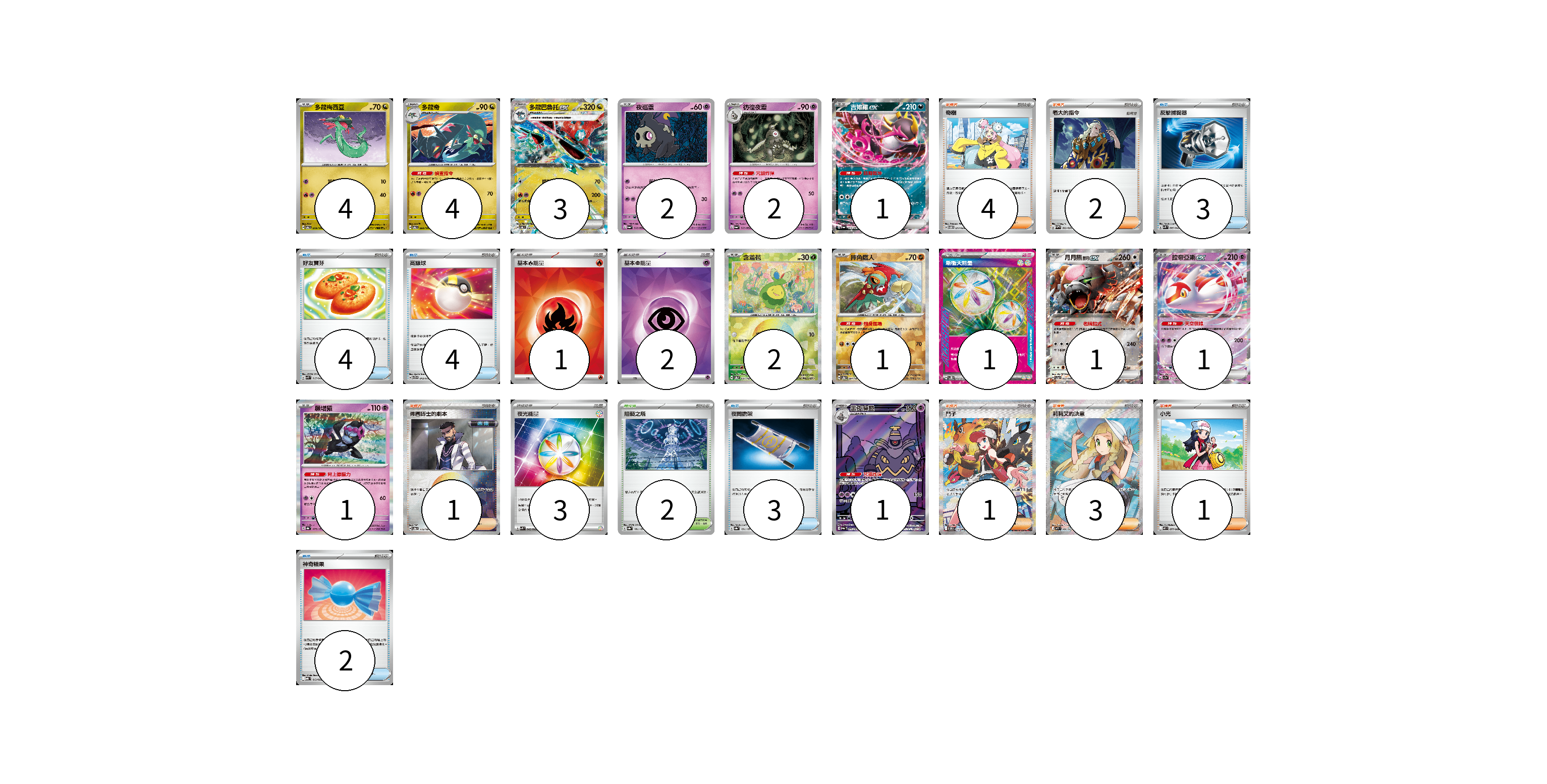 牌組構築方案 以此牌組為基礎新構築牌組 顯示卡面 顯示列表 寶可夢卡(23) 4 4 3 2 2 1 2 1 1 1 1 1 物品卡(16) 3 4 4 3 2 支援者卡(12) 4 2 1 1 3 1 競技場卡(2) 2 能量卡(7) 1 2 1 3 寶可夢卡(23) 卡牌名稱 張數 卡牌名稱 張數 多龍梅西亞 SV6 079/101 04 多龍奇 SV6 080/101 04 多龍巴魯托ex SV6 081/101 03 夜巡靈 SV6a 018/064 02 彷徨夜靈 SV6a 019/064 02 吉雉雞ex SV6a 038/064 01 含羞苞 SV8a 001/187 02 摔角鷹人 SV8a 084/187 01 月月熊 赫月 ex SV5a 052/066 01 拉帝亞斯ex SV7a 019/064 01 願增猿 SV8a 075/187 01 黑夜魔靈 SV6a 070/064 01 物品卡(16) 卡牌名稱 張數 卡牌名稱 張數 反擊捕捉器 SVK 009/042 03 好友寶芬 SVK 015/042 04 高級球 SVTG 013/019 04 夜間擔架 SV8a 151/187 03 神奇糖果 MBG 013/022 02 支援者卡(12) 卡牌名稱 張數 卡牌名稱 張數 奇樹 SVTM 017/022 04 老大的指令 SVHM 022/022 02 弗圖博士的劇本 SV8a 175/187 01 鬥子 SV11W 173/086 01 莉莉艾的決意 M1L 086/063 03 小光 M2 077/080 01 競技場卡(2) 卡牌名稱 張數 卡牌名稱 張數 阻礙之塔 SV8a 181/187 02 能量卡(7) 卡牌名稱 張數 卡牌名稱 張數 基本【火】能量 SVK FIR 01 基本【超】能量 SVK PSY 02 新衝天能量 SV5K 071/071 01 夜光能量 SVK 042/042 03 以此牌組為基礎新構築牌組 牌組編碼 VoDTUY-RaSNAF-EILZmG copy 列印牌組單 牌組編碼已複製 分享至SNS