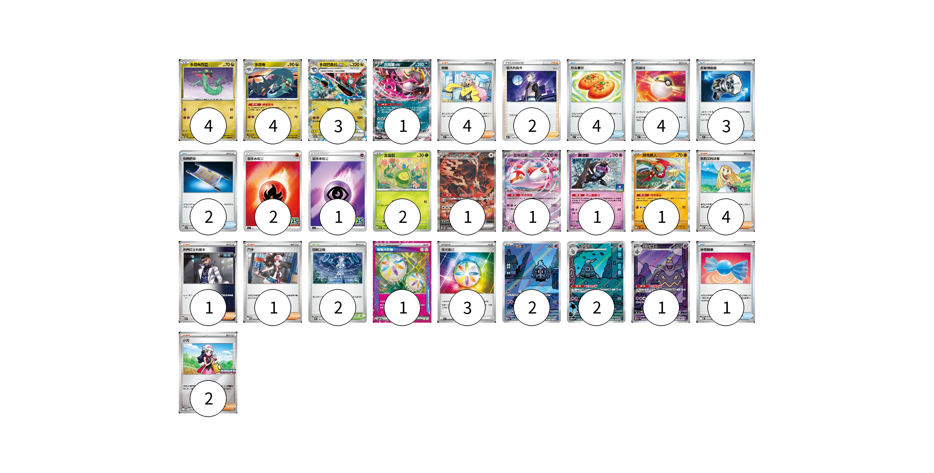 牌組構築方案 以此牌組為基礎新構築牌組 顯示卡面 顯示列表 寶可夢卡(23) 4 4 3 1 2 1 1 1 1 2 2 1 物品卡(14) 4 4 3 2 1 支援者卡(14) 4 2 4 1 1 2 競技場卡(2) 2 能量卡(7) 2 1 1 3 寶可夢卡(23) 卡牌名稱 張數 卡牌名稱 張數 多龍梅西亞 SV6 079/101 04 多龍奇 SV6 080/101 04 多龍巴魯托ex SV6 081/101 03 吉雉雞ex SV6a 038/064 01 含羞苞 SV8a 001/187 02 月月熊 赫月ex SV8a 225/187 01 拉帝亞斯ex SV7a 019/064 01 願增猿 M-P 014/M-P 01 摔角鷹人 SV8a 084/187 01 夜巡靈 SV6a 068/064 02 彷徨夜靈 SV6a 069/064 02 黑夜魔靈 SV6a 070/064 01 物品卡(14) 卡牌名稱 張數 卡牌名稱 張數 好友寶芬 SVK 015/042 04 高級球 SVK 018/042 04 反擊捕捉器 SVK 009/042 03 夜間擔架 SV6a 056/064 02 神奇糖果 MBG 013/022 01 支援者卡(14) 卡牌名稱 張數 卡牌名稱 張數 奇樹 SVK 031/042 04 老大的指令(赤日) SVB 024/028 02 莉莉艾的決意 MBD 021/022 04 弗圖博士的劇本 SV8a 175/187 01 鬥子 SV11W 085/086 01 小光 M-P 028/M-P 02 競技場卡(2) 卡牌名稱 張數 卡牌名稱 張數 阻礙之塔 SV8a 181/187 02 能量卡(7) 卡牌名稱 張數 卡牌名稱 張數 基本火能量 S8a FIR 02 基本超能量 S8a PSY 01 新衝天能量 SV5K 071/071 01 夜光能量 SVK 042/042 03 以此牌組為基礎新構築牌組 牌組編碼 VpZQgb-AfrkFT-snuEyk copy 列印牌組單 牌組編碼已複製 分享至SNS