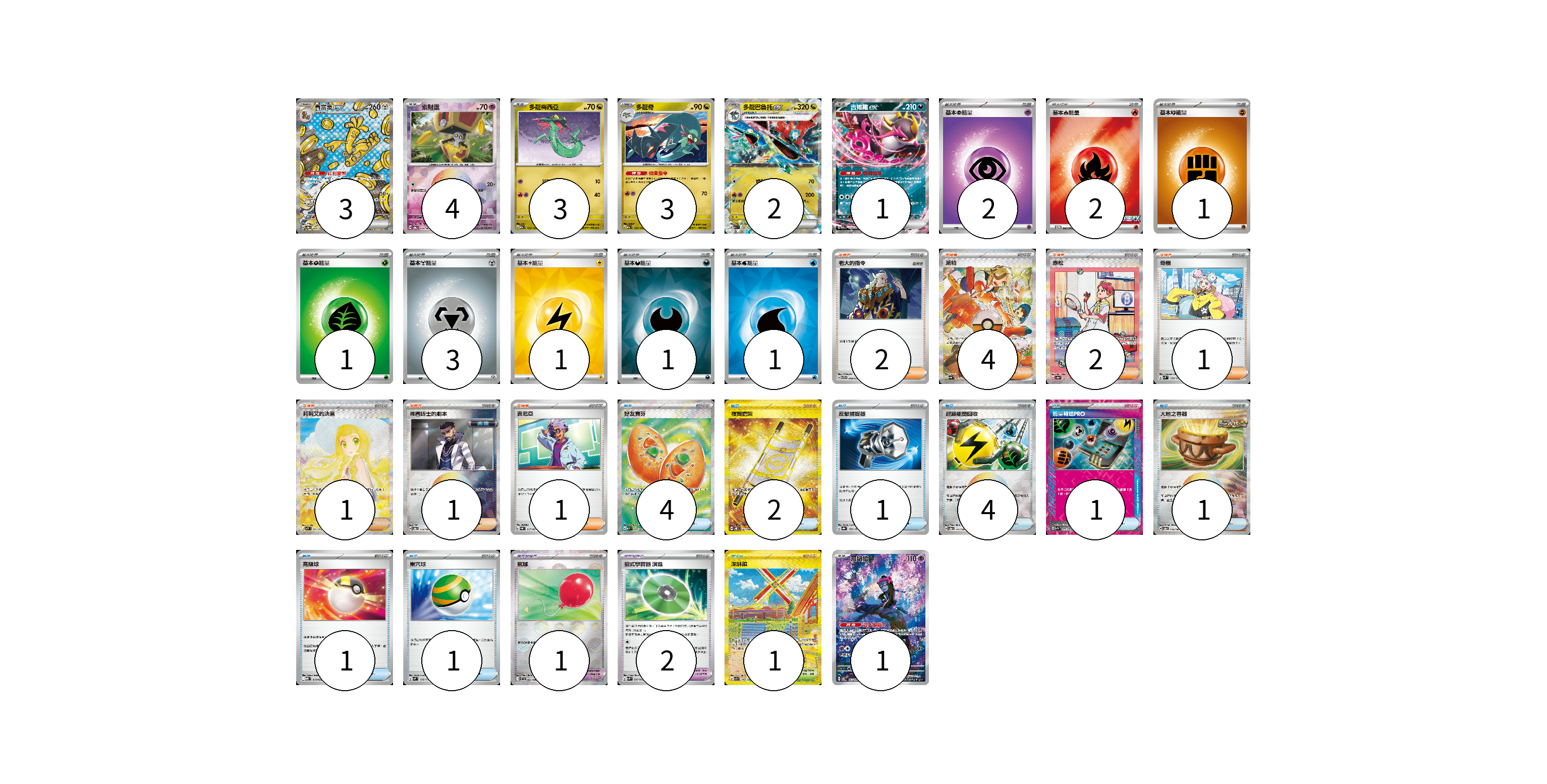 牌組構築方案 以此牌組為基礎新構築牌組 顯示卡面 顯示列表 寶可夢卡(17) 3 4 3 3 2 1 1 寶可夢道具(3) 1 2 物品卡(15) 4 2 1 4 1 1 1 1 支援者卡(12) 2 4 2 1 1 1 1 競技場卡(1) 1 能量卡(12) 2 2 1 1 3 1 1 1 寶可夢卡(17) 卡牌名稱 張數 卡牌名稱 張數 賽富豪ex SV8a 220/187 03 索財靈 SV8a 073/187 04 多龍梅西亞 M2a 132/193 03 多龍奇 M2a 133/193 03 多龍巴魯托ex M2a 134/193 02 吉雉雞ex M2a 114/193 01 願增猿 SV6 107/101 01 寶可夢道具(3) 卡牌名稱 張數 卡牌名稱 張數 氣球 SV11B 082/086 01 招式學習器 演進 SVK 025/042 02 物品卡(15) 卡牌名稱 張數 卡牌名稱 張數 好友寶芬 M1S 081/063 04 夜間擔架 SV8 137/106 02 反擊捕捉器 SV8a 139/187 01 超級能量回收 SV8a 141/187 04 能量輸送PRO SV7a 052/064 01 大地之容器 SV8a 143/187 01 高級球 MBD 014/022 01 巢穴球 SVM 133/175 01 支援者卡(12) 卡牌名稱 張數 卡牌名稱 張數 老大的指令 SVTG 019/019 02 派帕 SV4a 353/190 04 赤松 SV8a 227/187 02 奇樹 SVM 160/175 01 莉莉艾的決意 M1L 091/063 01 弗圖博士的劇本 SV8a 175/187 01 吉尼亞 SVAL 017/021 01 競技場卡(1) 卡牌名稱 張數 卡牌名稱 張數 深缽鎮 SV3 140/108 01 能量卡(12) 卡牌名稱 張數 卡牌名稱 張數 基本【超】能量 MBD PSY 02 基本【火】能量 M-P 032/M-P 02 基本【鬥】能量 M-P FIG 01 基本【草】能量 M-P GRA 01 基本【鋼】能量 M-P MET 03 基本【雷】能量 SVQP LIG 01 基本【惡】能量 SVM DAR 01 基本【水】能量 SVM WAT 01 以此牌組為基礎新構築牌組 牌組編碼 VqbROj-EPwjrH-myUVuo copy 列印牌組單 牌組編碼已複製 分享至SNS