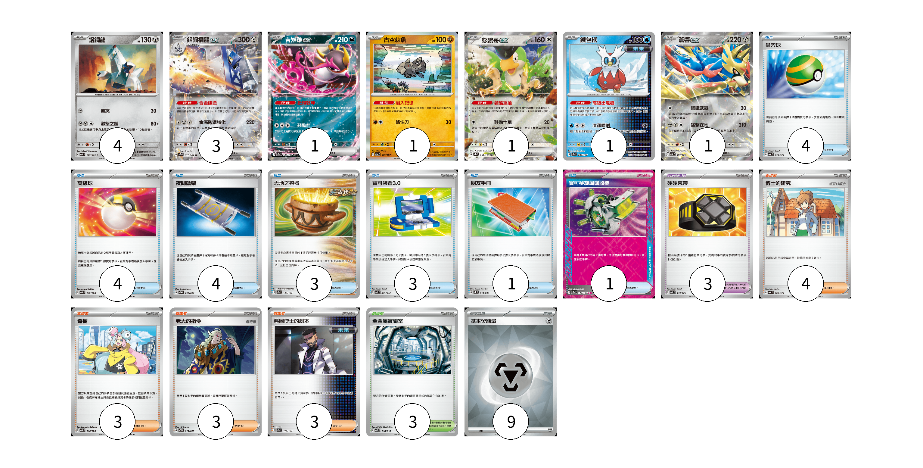 牌組構築方案 以此牌組為基礎新構築牌組 顯示卡面 顯示列表 寶可夢卡(12) 4 3 1 1 1 1 1 寶可夢道具(3) 3 物品卡(20) 4 4 4 3 3 1 1 支援者卡(13) 4 3 3 3 競技場卡(3) 3 能量卡(9) 9 寶可夢卡(12) 卡牌名稱 張數 卡牌名稱 張數 鋁鋼龍 SV7 072/102 04 鋁鋼橋龍ex SV7a 037/064 03 吉雉雞ex SV8a 104/187 01 古空棘魚 SV8a 079/187 01 怒鸚哥ex SV4a 154/190 01 鐵包袱 SV8a 047/187 01 蒼響ex SVM 089/175 01 寶可夢道具(3) 卡牌名稱 張數 卡牌名稱 張數 硬硬束帶 SVM 139/175 03 物品卡(20) 卡牌名稱 張數 卡牌名稱 張數 巢穴球 SVM 133/175 04 高級球 SVOD 012/020 04 夜間擔架 SVOM 016/021 04 大地之容器 SV8a 143/187 03 寶可裝置3.0 SVK 021/042 03 朋友手冊 SVK 014/042 01 寶可夢旋風回收機 SV8a 149/187 01 支援者卡(13) 卡牌名稱 張數 卡牌名稱 張數 博士的研究 SVM 166/175 04 奇樹 SVOD 016/020 03 老大的指令 SVOD 019/020 03 弗圖博士的劇本 SV8a 175/187 03 競技場卡(3) 卡牌名稱 張數 卡牌名稱 張數 全金屬實驗室 SVTH 018/018 03 能量卡(9) 卡牌名稱 張數 卡牌名稱 張數 基本【鋼】能量 SVOD MET 09 以此牌組為基礎新構築牌組 牌組編碼 VrASGG-ZoHAAz-CcOcMA copy 列印牌組單 牌組編碼已複製 分享至SNS