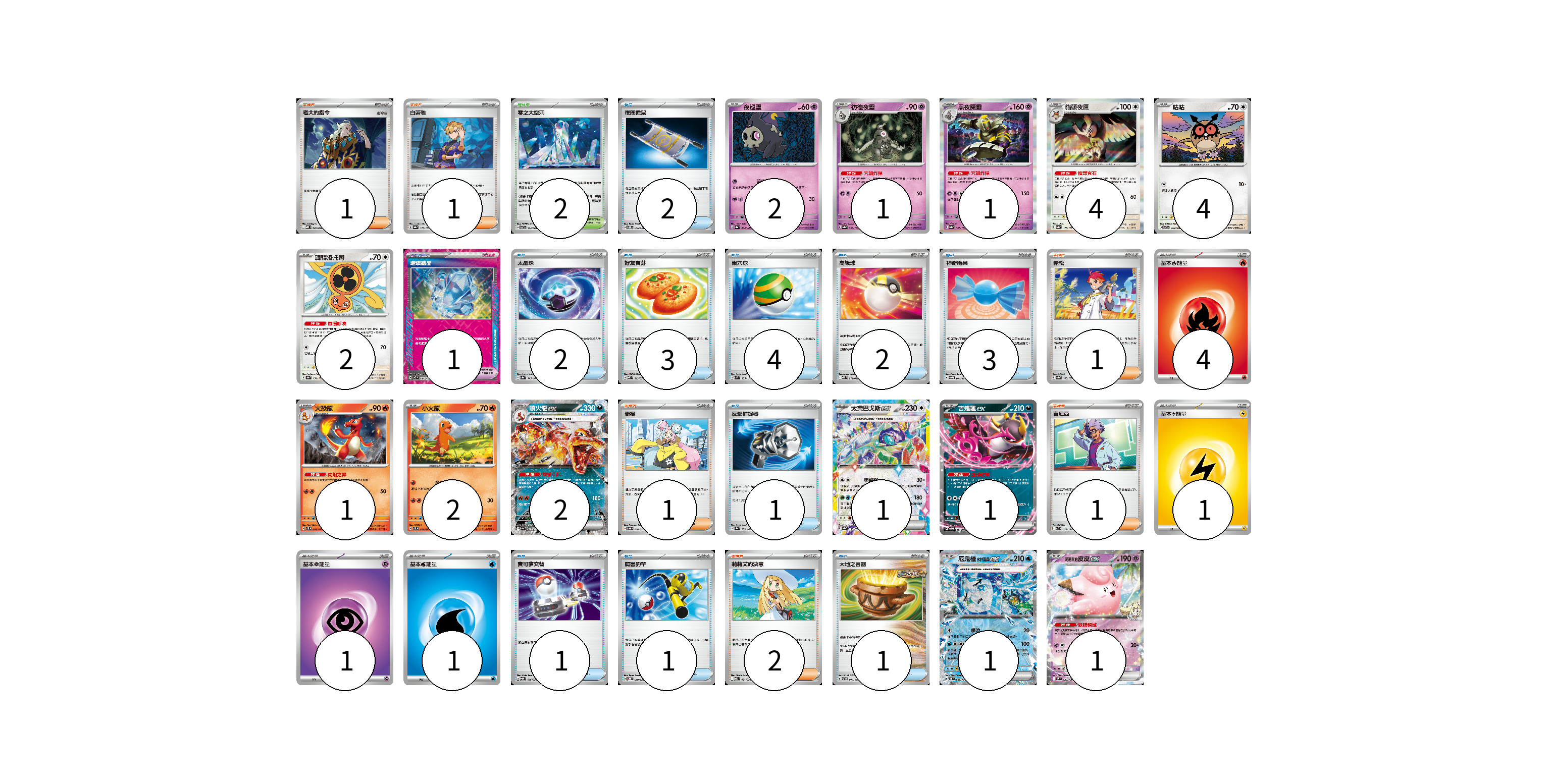 牌組構築方案 以此牌組為基礎新構築牌組 顯示卡面 顯示列表 寶可夢卡(23) 2 1 1 4 4 2 1 2 2 1 1 1 1 寶可夢道具(1) 1 物品卡(20) 2 2 3 4 2 3 1 1 1 1 支援者卡(7) 1 1 1 1 1 2 競技場卡(2) 2 能量卡(7) 4 1 1 1 寶可夢卡(23) 卡牌名稱 張數 卡牌名稱 張數 夜巡靈 SV8a 064/187 02 彷徨夜靈 SV8a 065/187 01 黑夜魔靈 SV8a 066/187 01 貓頭夜鷹 SV8a 128/187 04 咕咕 SV7 076/102 04 旋轉洛托姆 SV8a 131/187 02 火恐龍 SVTL 002/021 01 小火龍 SVTL 001/021 02 噴火龍ex SV4a 115/190 02 太樂巴戈斯ex SV8a 136/187 01 吉雉雞ex SVOD 004/020 01 厄鬼椪 水井面具ex SV6 038/101 01 莉莉艾的皮皮ex SV9 033/100 01 寶可夢道具(1) 卡牌名稱 張數 卡牌名稱 張數 璀璨結晶 SV7 094/102 01 物品卡(20) 卡牌名稱 張數 卡牌名稱 張數 夜間擔架 SVOM 016/021 02 太晶珠 SV8a 145/187 02 好友寶芬 MBD 013/022 03 巢穴球 SVM 133/175 04 高級球 MBD 014/022 02 神奇糖果 SVOM 014/021 03 反擊捕捉器 SV8a 139/187 01 寶可夢交替 SVQP 016/023 01 厲害釣竿 SVOD 010/020 01 大地之容器 SVTG 010/019 01 支援者卡(7) 卡牌名稱 張數 卡牌名稱 張數 老大的指令 MBD 020/022 01 白蕾雅 SV8a 176/187 01 赤松 SV8a 163/187 01 奇樹 SVOD 016/020 01 吉尼亞 SVD 129/139 01 莉莉艾的決意 MBD 021/022 02 競技場卡(2) 卡牌名稱 張數 卡牌名稱 張數 零之大空洞 SV7 102/102 02 能量卡(7) 卡牌名稱 張數 卡牌名稱 張數 基本火能量 sv-p FIR 04 基本雷能量 sv-p LIG 01 基本超能量 sv-p PSY 01 基本水能量 sv-p WAT 01 以此牌組為基礎新構築牌組 牌組編碼 VreMmE-KyFZFz-IbjMfw copy 列印牌組單 牌組編碼已複製 分享至SNS