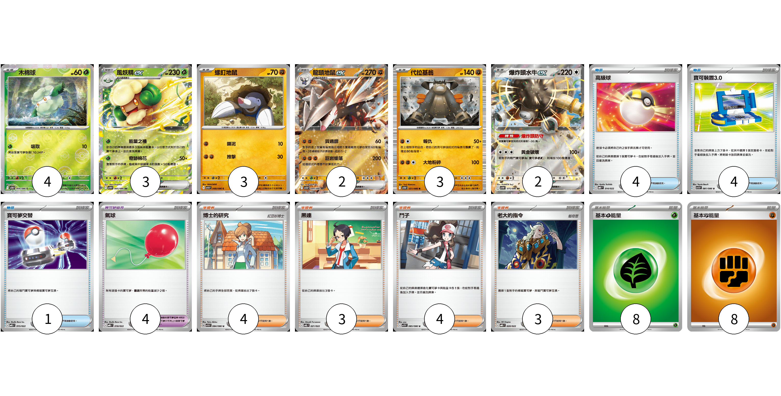 牌組構築方案 以此牌組為基礎新構築牌組 顯示卡面 顯示列表 寶可夢卡(17) 4 3 3 2 3 2 寶可夢道具(4) 4 物品卡(9) 4 4 1 支援者卡(14) 4 3 4 3 能量卡(16) 8 8 寶可夢卡(17) 卡牌名稱 張數 卡牌名稱 張數 木棉球 SV11W 004/086 04 風妖精ex SV11W 005/086 03 螺釘地鼠 SV11B 048/086 03 龍頭地鼠ex SV11B 049/086 02 代拉基翁 SV11W 051/086 03 爆炸頭水牛ex SV11W 075/086 02 寶可夢道具(4) 卡牌名稱 張數 卡牌名稱 張數 氣球 MBD 018/022 04 物品卡(9) 卡牌名稱 張數 卡牌名稱 張數 高級球 MBD 014/022 04 寶可裝置3.0 SV11B 081/086 04 寶可夢交替 MBG 015/022 01 支援者卡(14) 卡牌名稱 張數 卡牌名稱 張數 博士的研究 SV11B 084/086 04 黑連 SVQL 021/022 03 鬥子 SV11W 085/086 04 老大的指令 MBD 020/022 03 能量卡(16) 卡牌名稱 張數 卡牌名稱 張數 基本草能量 sv-p GRA 08 基本鬥能量 sv-p FIG 08 以此牌組為基礎新構築牌組 牌組編碼 VslXKH-mbptoH-WDoWAI copy 列印牌組單 牌組編碼已複製 分享至SNS