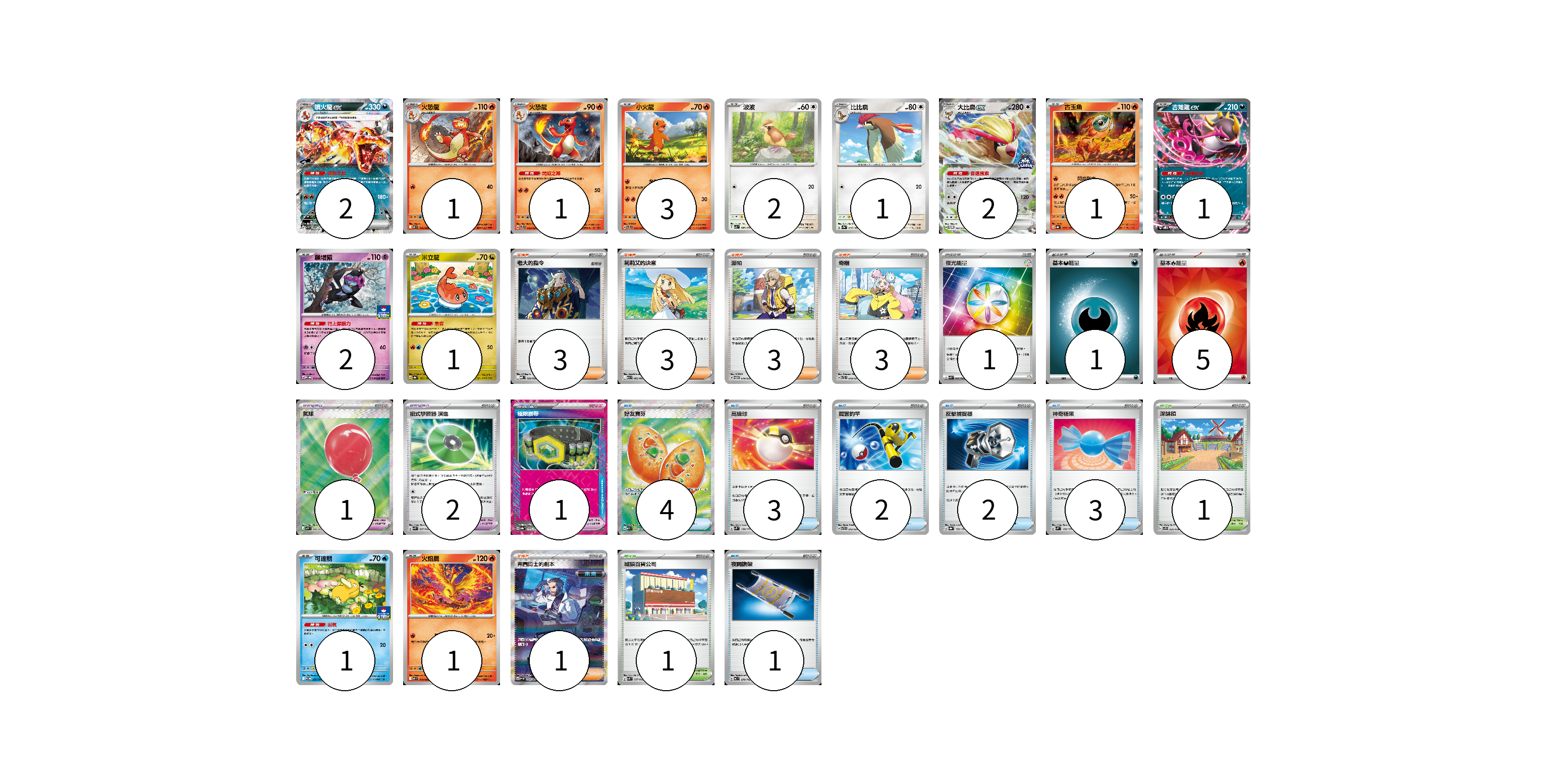 牌組構築方案 以此牌組為基礎新構築牌組 顯示卡面 顯示列表 寶可夢卡(19) 2 1 1 3 2 1 2 1 1 2 1 1 1 寶可夢道具(7) 3 1 2 1 物品卡(15) 4 3 2 2 3 1 支援者卡(10) 3 3 3 1 競技場卡(2) 1 1 能量卡(7) 1 1 5 寶可夢卡(19) 卡牌名稱 張數 卡牌名稱 張數 噴火龍ex SV3 066/108 02 火恐龍 M2 012/080 01 火恐龍 SVTL 002/021 01 小火龍 SVTL 001/021 03 波波 SV3 087/108 02 比比鳥 SV2a 017/165 01 大比鳥ex SV-P 183/SV-P 02 古玉魚 SV8a 025/187 01 吉雉雞ex SVOD 004/020 01 願增猿 M-P 014/M-P 02 米立龍 SV8a 121/187 01 可達鴨 SV-P 220/SV-P 01 火焰鳥 M2 014/080 01 寶可夢道具(7) 卡牌名稱 張數 卡牌名稱 張數 奇樹 SVTL 018/021 03 氣球 M1L 084/063 01 招式學習器 演進 SVK 025/042 02 極限腰帶 SV8a 159/187 01 物品卡(15) 卡牌名稱 張數 卡牌名稱 張數 好友寶芬 M1S 081/063 04 高級球 SVM 134/175 03 厲害釣竿 SVTR 012/021 02 反擊捕捉器 SV8a 139/187 02 神奇糖果 SVM 135/175 03 夜間擔架 MC 670/742 01 支援者卡(10) 卡牌名稱 張數 卡牌名稱 張數 老大的指令 MBD 020/022 03 莉莉艾的決意 M1L 062/063 03 派帕 SVTM 019/022 03 弗圖博士的劇本 SV4M 091/066 01 競技場卡(2) 卡牌名稱 張數 卡牌名稱 張數 深缽鎮 SVF 036/038 01 城鎮百貨公司 SVK 037/042 01 能量卡(7) 卡牌名稱 張數 卡牌名稱 張數 夜光能量 SVK 042/042 01 基本【惡】能量 M-P DAR 01 基本【火】能量 SVQL FIR 05 以此牌組為基礎新構築牌組 牌組編碼 Vulnvu-JLcCkK-XBNvNe copy 列印牌組單 牌組編碼已複製 分享至SNS