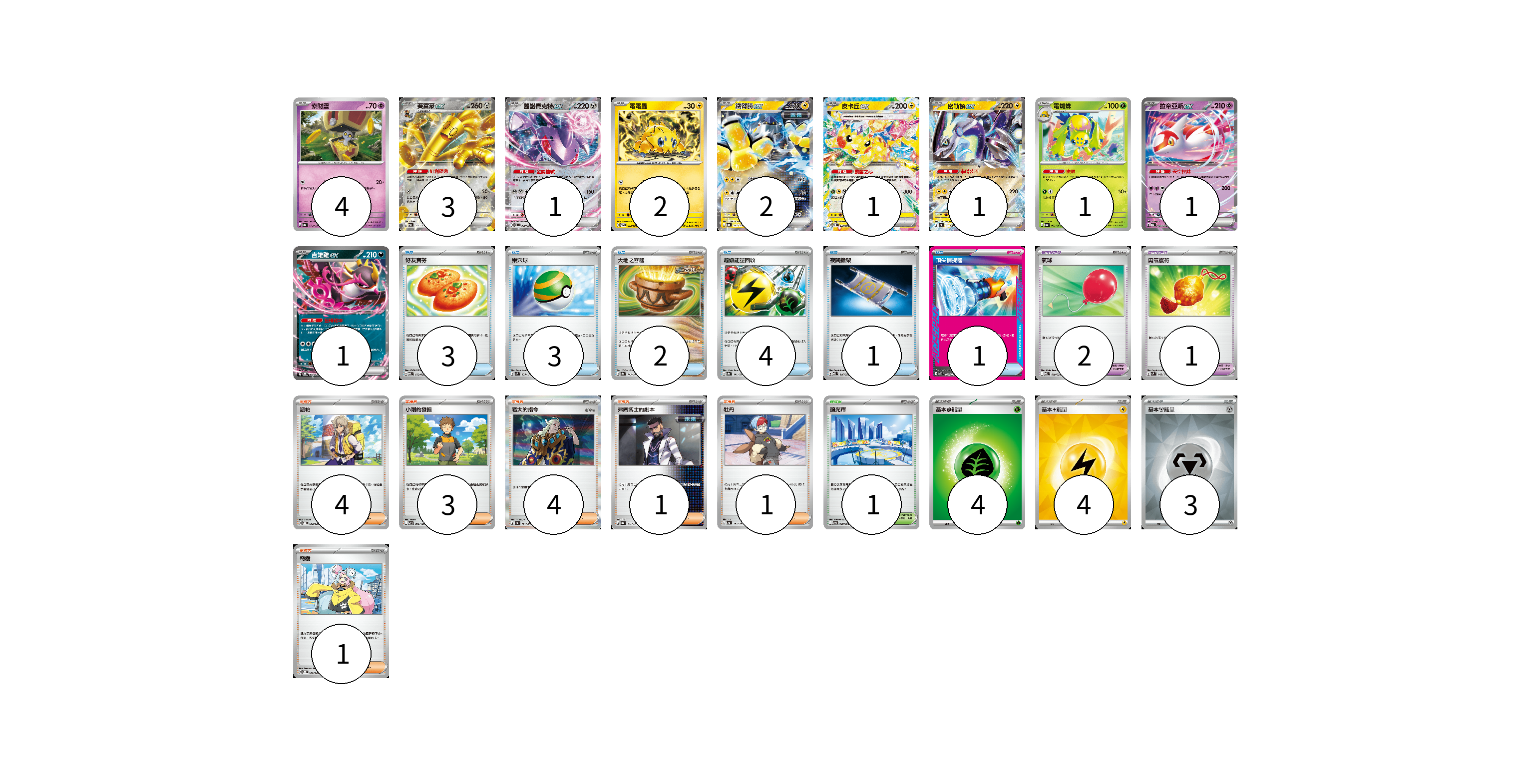 牌組構築方案 以此牌組為基礎新構築牌組 顯示卡面 顯示列表 寶可夢卡(17) 4 3 1 2 2 1 1 1 1 1 寶可夢道具(3) 2 1 物品卡(14) 3 3 2 4 1 1 支援者卡(14) 4 3 4 1 1 1 競技場卡(1) 1 能量卡(11) 4 4 3 寶可夢卡(17) 卡牌名稱 張數 卡牌名稱 張數 索財靈 SV8a 073/187 04 賽富豪ex SV8a 117/187 03 蓋諾賽克特ex SV11B 069/086 01 電電蟲 SV7 032/102 02 鐵臂膀ex SV8a 054/187 02 皮卡丘ex SV8 033/106 01 密勒頓ex SV4a 071/190 01 電蜘蛛 SV6a 002/064 01 拉帝亞斯ex MBD 003/022 01 吉雉雞ex SVOD 004/020 01 寶可夢道具(3) 卡牌名稱 張數 卡牌名稱 張數 氣球 MBD 018/022 02 勇氣護符 SVM 142/175 01 物品卡(14) 卡牌名稱 張數 卡牌名稱 張數 好友寶芬 MBD 013/022 03 巢穴球 SVM 133/175 03 大地之容器 SV8a 143/187 02 超級能量回收 SV8a 141/187 04 夜間擔架 MBD 016/022 01 頂尖捕捉器 MBG 014/022 01 支援者卡(14) 卡牌名稱 張數 卡牌名稱 張數 派帕 SVOD 018/020 04 小剛的發掘 SV9 096/100 03 老大的指令 SV4a 181/190 04 弗圖博士的劇本 SV8a 175/187 01 牡丹 SV4a 182/190 01 奇樹 SVOD 016/020 01 競技場卡(1) 卡牌名稱 張數 卡牌名稱 張數 釀光市 SV9 098/100 01 能量卡(11) 卡牌名稱 張數 卡牌名稱 張數 基本【草】能量 M-P GRA 04 基本【雷】能量 SVQP LIG 04 基本【鋼】能量 SVOD MET 03 以此牌組為基礎新構築牌組 牌組編碼 VupKuB-zGGLtP-mAlHTs copy 列印牌組單 牌組編碼已複製 分享至SNS