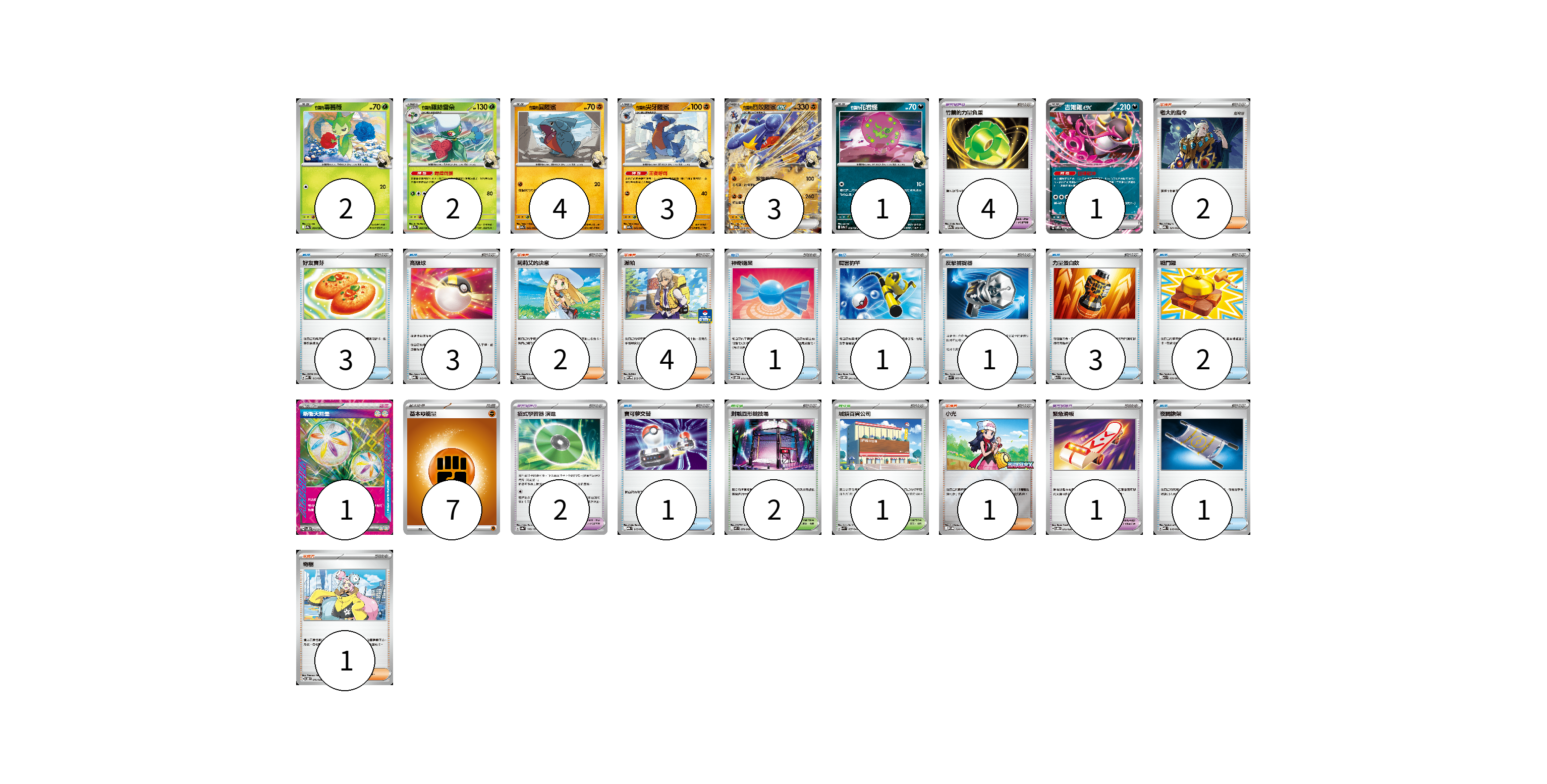 牌組構築方案 以此牌組為基礎新構築牌組 顯示卡面 顯示列表 寶可夢卡(16) 2 2 4 3 3 1 1 寶可夢道具(7) 4 2 1 物品卡(16) 3 3 1 1 1 3 2 1 1 支援者卡(10) 2 2 4 1 1 競技場卡(3) 2 1 能量卡(8) 1 7 寶可夢卡(16) 卡牌名稱 張數 卡牌名稱 張數 <竹蘭的>毒薔薇 SV9a 004/063 02 <竹蘭的>羅絲雷朵 SV9a 005/063 02 <竹蘭的>圓陸鯊 SV9a 042/063 04 <竹蘭的>尖牙陸鯊 SV9a 043/063 03 <竹蘭的>烈咬陸鯊ex SV9a 044/063 03 <竹蘭的>花岩怪 SV9a 050/063 01 吉雉雞ex SVOM 009/021 01 寶可夢道具(7) 卡牌名稱 張數 卡牌名稱 張數 竹蘭的力量負重 SV9a 060/063 04 招式學習器 演進 SV8a 160/187 02 緊急滑板 SVOD 015/020 01 物品卡(16) 卡牌名稱 張數 卡牌名稱 張數 好友寶芬 MBD 013/022 03 高級球 MBG 012/022 03 神奇糖果 SVOD 013/020 01 厲害釣竿 SVOM 011/021 01 反擊捕捉器 SVK 009/042 01 力量蛋白飲 M1L 058/063 03 戰鬥鑼 M1L 059/063 02 寶可夢交替 MBG 015/022 01 夜間擔架 MBD 016/022 01 支援者卡(10) 卡牌名稱 張數 卡牌名稱 張數 老大的指令 MBG 021/022 02 莉莉艾的決意 MBG 022/022 02 派帕 SV-P 213/SV-P 04 小光 M-P 028/M-P 01 奇樹 SVOD 016/020 01 競技場卡(3) 卡牌名稱 張數 卡牌名稱 張數 對戰圓形競技場 M2 079/080 02 城鎮百貨公司 SVK 037/042 01 能量卡(8) 卡牌名稱 張數 卡牌名稱 張數 新衝天能量 SV5K 071/071 01 基本【鬥】能量 M-P FIG 07 以此牌組為基礎新構築牌組 牌組編碼 VuxheR-ZEDZDp-DhWIYZ copy 列印牌組單 牌組編碼已複製 分享至SNS