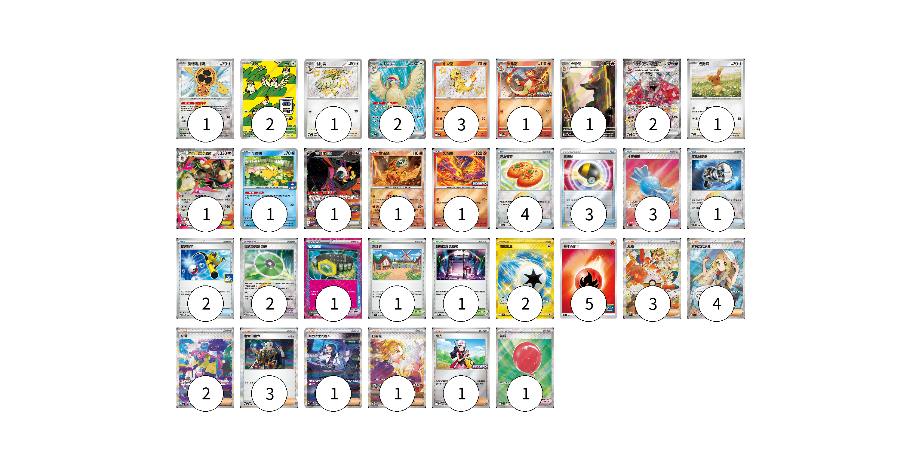 牌組構築方案 以此牌組為基礎新構築牌組 顯示卡面 顯示列表 寶可夢卡(19) 1 2 1 2 3 1 1 2 1 1 1 1 1 1 寶可夢道具(4) 2 1 1 物品卡(13) 4 3 3 1 2 支援者卡(15) 3 4 2 3 1 1 1 競技場卡(2) 1 1 能量卡(7) 2 5 寶可夢卡(19) 卡牌名稱 張數 卡牌名稱 張數 旋轉洛托姆 SV8a 131/187 01 波波 SV3 118/108 02 比比鳥 SV4a 305/190 01 大比鳥ex SV3 128/108 02 小火龍 SV4a 210/190 03 火恐龍 M-P 021/M-P 01 火恐龍 SV2a 169/165 01 噴火龍ex SV4a 331/190 02 捲捲耳 M2 071/080 01 超級長耳兔ex M2 072/080 01 可達鴨 SV-P 220/SV-P 01 吉雉雞ex SV6a 089/064 01 古玉魚 SV8a 025/187 01 火焰鳥 M-P 022/M-P 01 寶可夢道具(4) 卡牌名稱 張數 卡牌名稱 張數 招式學習器 演進 SV8a 160/187 02 極限腰帶 SV5K 066/071 01 氣球 M1L 084/063 01 物品卡(13) 卡牌名稱 張數 卡牌名稱 張數 好友寶芬 SV8a 147/187 04 高級球 SPZ 009/020 03 神奇糖果 M1S 082/063 03 反擊捕捉器 SV8a 139/187 01 厲害釣竿 SV-P 112/SV-P 02 支援者卡(15) 卡牌名稱 張數 卡牌名稱 張數 派帕 SV4a 353/190 03 莉莉艾的決意 M1L 086/063 04 奇樹 SV4a 350/190 02 老大的指令 SV4a 181/190 03 弗圖博士的劇本 SV4M 091/066 01 白蕾雅 SV7 132/102 01 小光 M-P 028/M-P 01 競技場卡(2) 卡牌名稱 張數 卡牌名稱 張數 深缽鎮 SVK 039/042 01 對戰圓形競技場 M2 079/080 01 能量卡(7) 卡牌名稱 張數 卡牌名稱 張數 噴射能量 SV7a 094/064 02 基本火能量 S8a FIR 05 以此牌組為基礎新構築牌組 牌組編碼 VyNBGs-ZQoLjs-wFcrLM copy 列印牌組單 牌組編碼已複製 分享至SNS