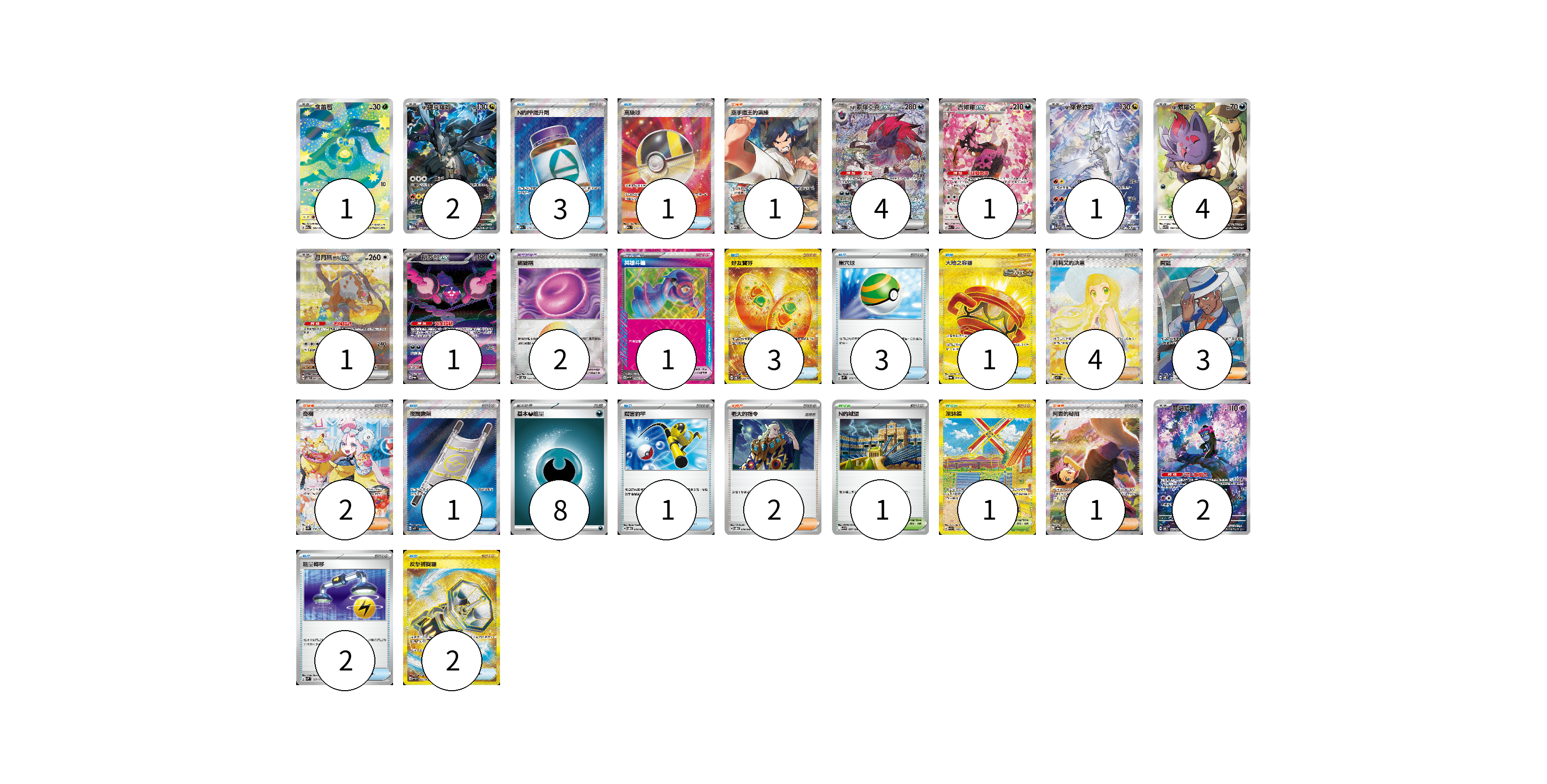 牌組構築方案 以此牌組為基礎新構築牌組 顯示卡面 顯示列表 寶可夢卡(17) 1 2 4 1 1 4 1 1 2 寶可夢道具(3) 2 1 物品卡(17) 3 1 3 3 1 1 1 2 2 支援者卡(13) 1 4 3 2 2 1 競技場卡(2) 1 1 能量卡(8) 8 寶可夢卡(17) 卡牌名稱 張數 卡牌名稱 張數 含羞苞 M2a 196/193 01 N的捷克羅姆 M2a 210/193 02 N的索羅亞克ex M2a 242/193 04 吉雉雞ex M2a 244/193 01 N的萊希拉姆 SV9 109/100 01 N的索羅亞 SV9 108/100 04 月月熊 赫月 ex SV5a 091/066 01 桃歹郎ex SV6a 090/064 01 願增猿 SV6 107/101 02 寶可夢道具(3) 卡牌名稱 張數 卡牌名稱 張數 鎖鏈糬 SV8a 154/187 02 英雄斗篷 SV5M 064/071 01 物品卡(17) 卡牌名稱 張數 卡牌名稱 張數 N的PP提升劑 M2a 214/193 03 高級球 M2a 216/193 01 好友寶芬 SV6 133/101 03 巢穴球 SVM 133/175 03 大地之容器 SV6a 093/064 01 夜間擔架 M1L 083/063 01 厲害釣竿 SVOD 010/020 01 能量轉移 SVM 127/175 02 反擊捕捉器 SV4M 094/066 02 支援者卡(13) 卡牌名稱 張數 卡牌名稱 張數 空手道王的演練 M2a 220/193 01 莉莉艾的決意 M1L 091/063 04 席藍 SV8 127/106 03 奇樹 SV2D 096/071 02 老大的指令 SVOD 019/020 02 阿杏的秘招 SV8a 228/187 01 競技場卡(2) 卡牌名稱 張數 卡牌名稱 張數 N的城堡 SV9 097/100 01 深缽鎮 SV3 140/108 01 能量卡(8) 卡牌名稱 張數 卡牌名稱 張數 基本【惡】能量 M-P DAR 08 以此牌組為基礎新構築牌組 牌組編碼 VzFcCB-tShStv-jkeODn copy 列印牌組單 牌組編碼已複製 分享至SNS