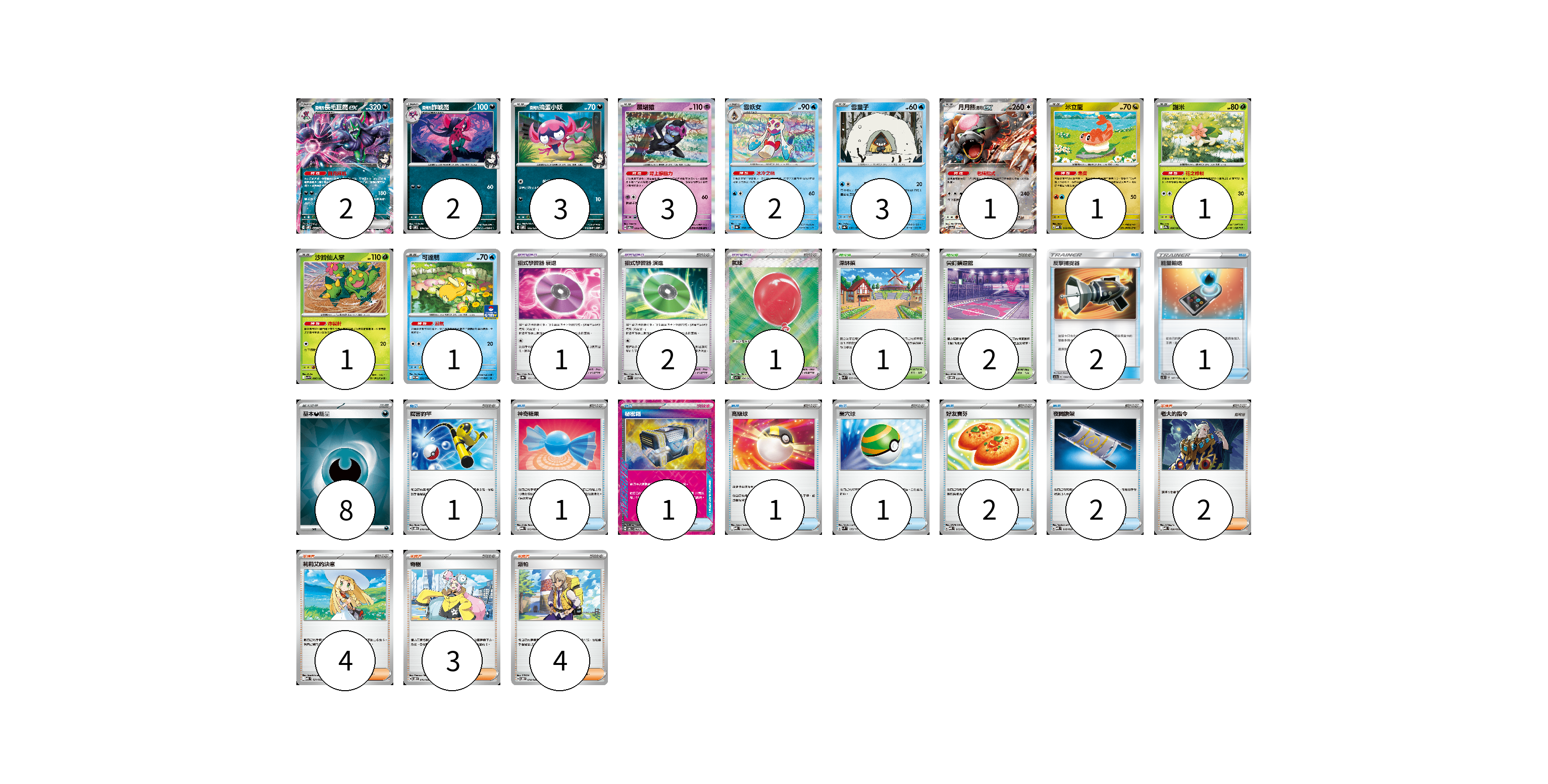 牌組構築方案 以此牌組為基礎新構築牌組 顯示卡面 顯示列表 寶可夢卡(20) 2 2 3 3 2 3 1 1 1 1 1 寶可夢道具(4) 1 2 1 物品卡(12) 2 1 1 1 1 1 1 2 2 支援者卡(13) 2 4 3 4 競技場卡(3) 1 2 能量卡(8) 8 寶可夢卡(20) 卡牌名稱 張數 卡牌名稱 張數 <瑪俐的>長毛巨魔ex SVOM 007/021 02 <瑪俐的>詐唬魔 SVOM 006/021 02 <瑪俐的>搗蛋小妖 SVOM 005/021 03 願增猿 SV6 055/101 03 雪妖女 SV8a 038/187 02 雪童子 SV8a 037/187 03 月月熊 赫月 ex SV5a 052/066 01 米立龍 MBD 010/022 01 謝米 SV9a 006/063 01 沙鈴仙人掌 SV9 006/100 01 可達鴨 SV-P 220/SV-P 01 寶可夢道具(4) 卡牌名稱 張數 卡牌名稱 張數 招式學習器 衰退 SV8a 161/187 01 招式學習器 演進 SVK 025/042 02 氣球 M1L 084/063 01 物品卡(12) 卡牌名稱 張數 卡牌名稱 張數 反擊捕捉器 AC1a 130/158 02 能量輸送 SC1D 147/164 01 厲害釣竿 SVOD 010/020 01 神奇糖果 MBG 013/022 01 秘密箱 SV6 092/101 01 高級球 MBD 014/022 01 巢穴球 SVM 133/175 01 好友寶芬 MBD 013/022 02 夜間擔架 MBD 016/022 02 支援者卡(13) 卡牌名稱 張數 卡牌名稱 張數 老大的指令 MBD 020/022 02 莉莉艾的決意 MBD 021/022 04 奇樹 SVOD 016/020 03 派帕 SVOD 018/020 04 競技場卡(3) 卡牌名稱 張數 卡牌名稱 張數 深缽鎮 SVK 039/042 01 尖釘鎮道館 SVOM 021/021 02 能量卡(8) 卡牌名稱 張數 卡牌名稱 張數 基本【惡】能量 SVOM DAR 08 以此牌組為基礎新構築牌組 牌組編碼 VzOilt-YqIzOd-AfTKaW copy 列印牌組單 牌組編碼已複製 分享至SNS