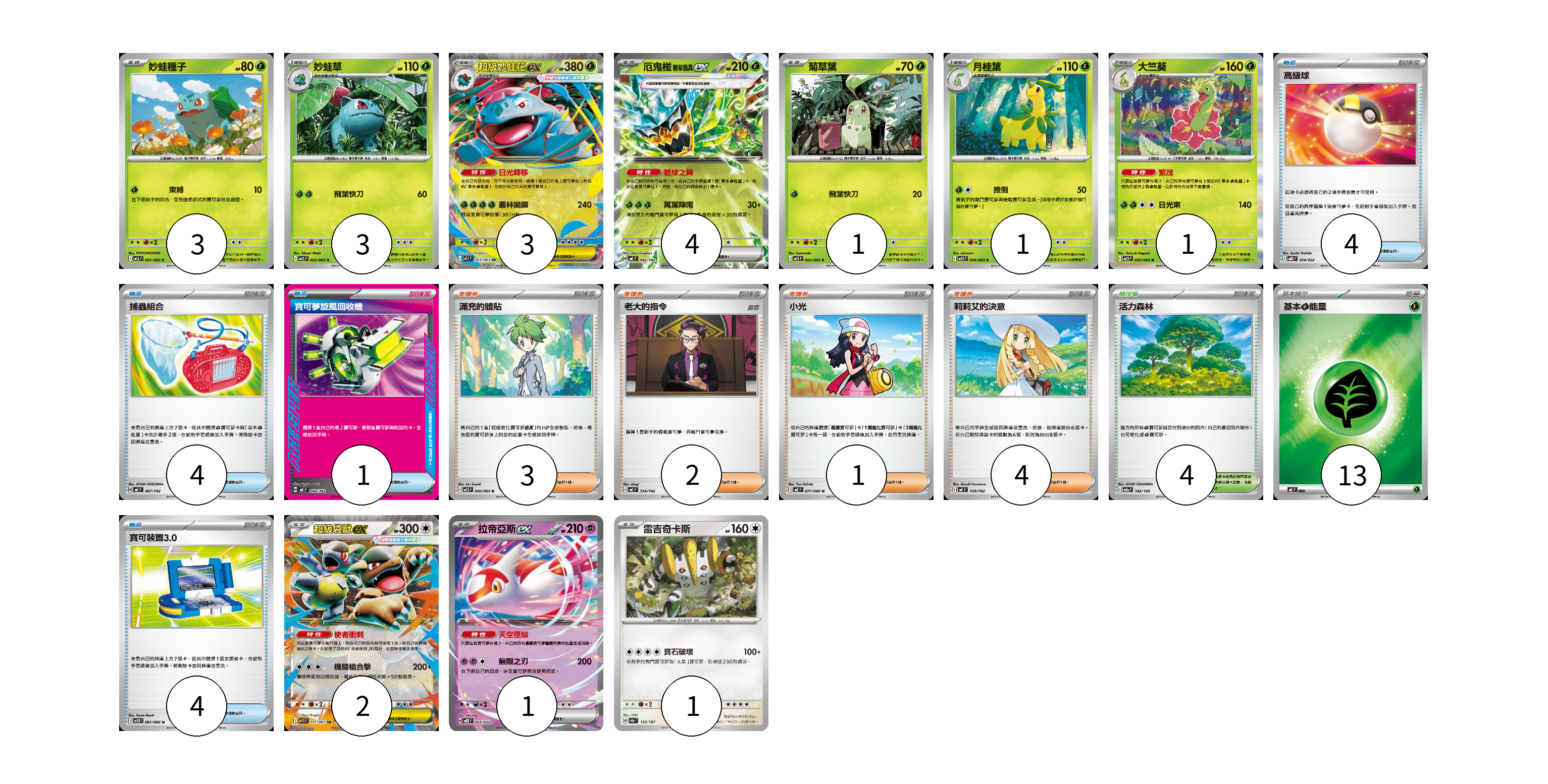 牌組構築方案 以此牌組為基礎新構築牌組 顯示卡面 顯示列表 寶可夢卡(20) 3 3 3 4 1 1 1 2 1 1 物品卡(13) 4 4 1 4 支援者卡(10) 3 2 1 4 競技場卡(4) 4 能量卡(13) 13 寶可夢卡(20) 卡牌名稱 張數 卡牌名稱 張數 妙蛙種子 M1L 001/063 03 妙蛙草 M1L 002/063 03 超級妙蛙花ex M1L 003/063 03 厄鬼椪 碧草面具ex MC 082/742 04 菊草葉 M1S 003/063 01 月桂葉 M1S 004/063 01 大竺葵 M1S 005/063 01 超級袋獸ex M1S 051/063 02 拉帝亞斯ex MBD 003/022 01 雷吉奇卡斯 SV8a 132/187 01 物品卡(13) 卡牌名稱 張數 卡牌名稱 張數 高級球 MBD 014/022 04 捕蟲組合 MC 667/742 04 寶可夢旋風回收機 MC 664/742 01 寶可裝置3.0 SV11B 081/086 04 支援者卡(10) 卡牌名稱 張數 卡牌名稱 張數 滿充的體貼 M1S 060/063 03 老大的指令 MC 724/742 02 小光 M2 077/080 01 莉莉艾的決意 MC 729/742 04 競技場卡(4) 卡牌名稱 張數 卡牌名稱 張數 活力森林 M2a 182/193 04 能量卡(13) 卡牌名稱 張數 卡牌名稱 張數 基本【草】能量 MC GRA 13 以此牌組為基礎新構築牌組 牌組編碼 WDSnKv-PXZOKt-VhxZEL copy 列印牌組單 牌組編碼已複製 分享至SNS