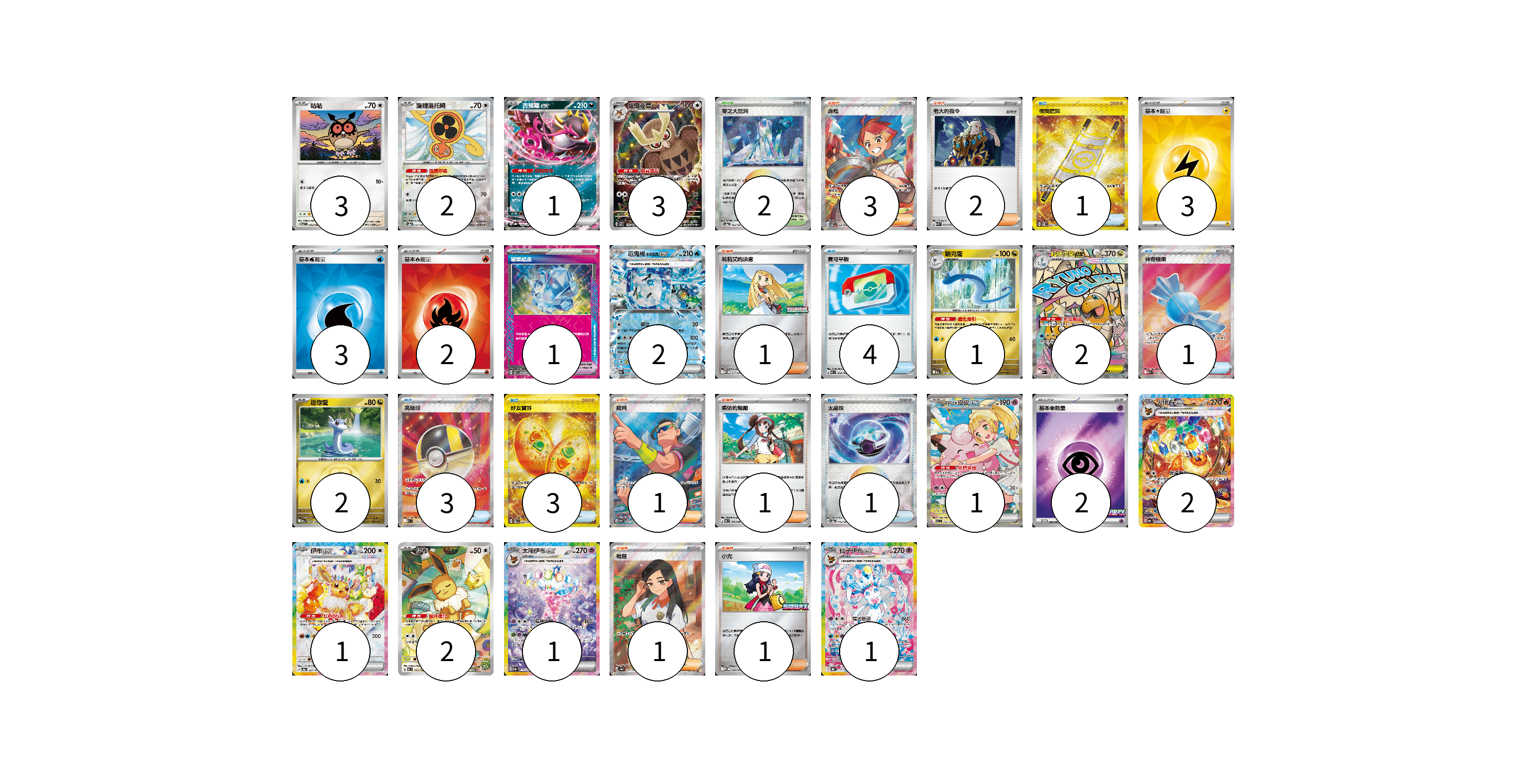 牌組構築方案 以此牌組為基礎新構築牌組 顯示卡面 顯示列表 寶可夢卡(24) 3 2 1 3 2 1 2 2 1 2 1 2 1 1 寶可夢道具(1) 1 物品卡(13) 1 4 1 3 3 1 支援者卡(10) 3 2 1 1 1 1 1 競技場卡(2) 2 能量卡(10) 3 3 2 2 寶可夢卡(24) 卡牌名稱 張數 卡牌名稱 張數 咕咕 SV7 076/102 03 旋轉洛托姆 SV8a 131/187 02 吉雉雞ex SV8a 104/187 01 貓頭夜鷹 SV7 114/102 03 厄鬼椪 水井面具ex SV8a 050/187 02 哈克龍 M2a 125/193 01 超級快龍ex M2a 232/193 02 迷你龍 M2a 124/193 02 莉莉艾的皮皮ex MC 765/742 01 火伊布ex SV8a 202/187 02 伊布ex SV8a 224/187 01 伊布 MC 755/742 02 太陽伊布ex SV8a 211/187 01 仙子伊布ex SV8a 212/187 01 寶可夢道具(1) 卡牌名稱 張數 卡牌名稱 張數 璀璨結晶 SV7 094/102 01 物品卡(13) 卡牌名稱 張數 卡牌名稱 張數 夜間擔架 SV8 137/106 01 寶可平板 MC 662/742 04 神奇糖果 M1S 082/063 01 高級球 M2a 216/193 03 好友寶芬 SV6 133/101 03 太晶珠 SV8a 145/187 01 支援者卡(10) 卡牌名稱 張數 卡牌名稱 張數 赤松 SV7 123/102 03 老大的指令 SVK 036/042 02 莉莉艾的決意 M-P 011/M-P 01 裁判 SV9a 083/063 01 鳴依的勉勵 M3 075/080 01 枇琶 SV8a 197/187 01 小光 M-P 028/M-P 01 競技場卡(2) 卡牌名稱 張數 卡牌名稱 張數 零之大空洞 SV8a 182/187 02 能量卡(10) 卡牌名稱 張數 卡牌名稱 張數 基本【雷】能量 SVK LIG 03 基本【水】能量 SVK WAT 03 基本【火】能量 SVK FIR 02 基本【超】能量 M-P 033/M-P 02 以此牌組為基礎新構築牌組 牌組編碼 WEbIxs-PdRDSw-fWiIHW copy 列印牌組單 牌組編碼已複製 分享至SNS