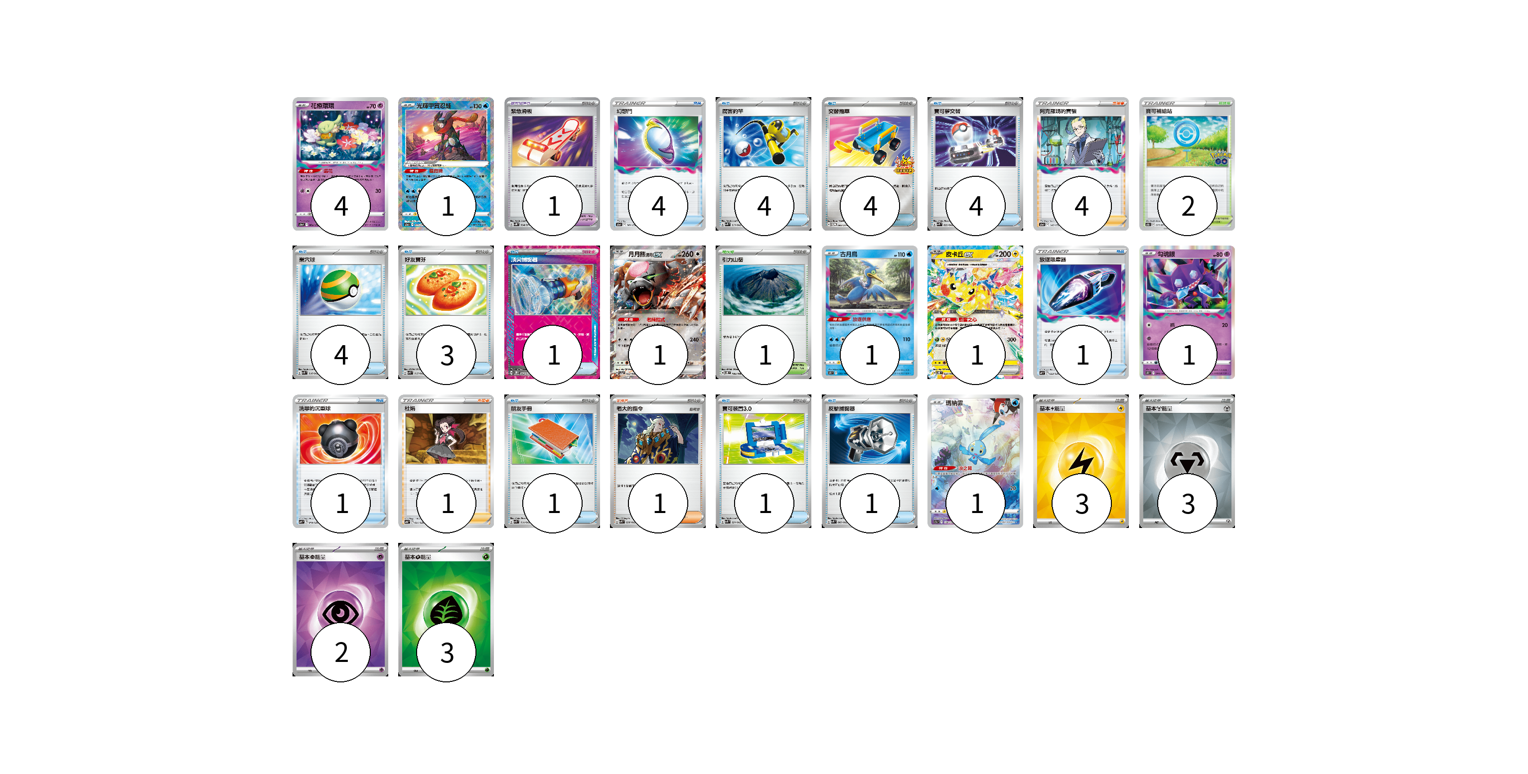 牌組構築方案 以此牌組為基礎新構築牌組 顯示卡面 顯示列表 寶可夢卡(10) 4 1 1 1 1 1 1 寶可夢道具(1) 1 物品卡(29) 4 4 4 4 4 3 1 1 1 1 1 1 支援者卡(6) 4 1 1 競技場卡(3) 2 1 能量卡(11) 3 3 2 3 寶可夢卡(10) 卡牌名稱 張數 卡牌名稱 張數 花療環環 S12a 064/172 04 光輝甲賀忍蛙 S12a 033/172 01 月月熊 赫月 ex SV5a 052/066 01 古月鳥 S11 033/100 01 皮卡丘ex SV8 033/106 01 勾魂眼 S11 044/100 01 瑪納霏 S12a 178/172 01 寶可夢道具(1) 卡牌名稱 張數 卡牌名稱 張數 緊急滑板 SV5K 064/071 01 物品卡(29) 卡牌名稱 張數 卡牌名稱 張數 幻想門 S12a 141/172 04 厲害釣竿 SVK 011/042 04 交替推車 SV-P 082/SV-P 04 寶可夢交替 SVK 022/042 04 巢穴球 SVK 016/042 04 好友寶芬 SVK 015/042 03 頂尖捕捉器 SV5M 062/071 01 放逐吸塵器 SVF 023/038 01 洗翠的沉重球 SVF 019/038 01 朋友手冊 SVK 014/042 01 寶可裝置3.0 SVK 021/042 01 反擊捕捉器 SVK 009/042 01 支援者卡(6) 卡牌名稱 張數 卡牌名稱 張數 阿克羅瑪的實驗 S12a 148/172 04 杜娟 SVB 021/028 01 老大的指令 SVK 036/042 01 競技場卡(3) 卡牌名稱 張數 卡牌名稱 張數 寶可補給站 S10b 071/071 02 引力山岳 SV8 106/106 01 能量卡(11) 卡牌名稱 張數 卡牌名稱 張數 基本【雷】能量 SVK LIG 03 基本【鋼】能量 SVK MET 03 基本【超】能量 SVK PSY 02 基本【草】能量 SVK GRA 03 以此牌組為基礎新構築牌組 牌組編碼 WGYyVF-bhnZQm-LMOegc copy 列印牌組單 牌組編碼已複製 分享至SNS