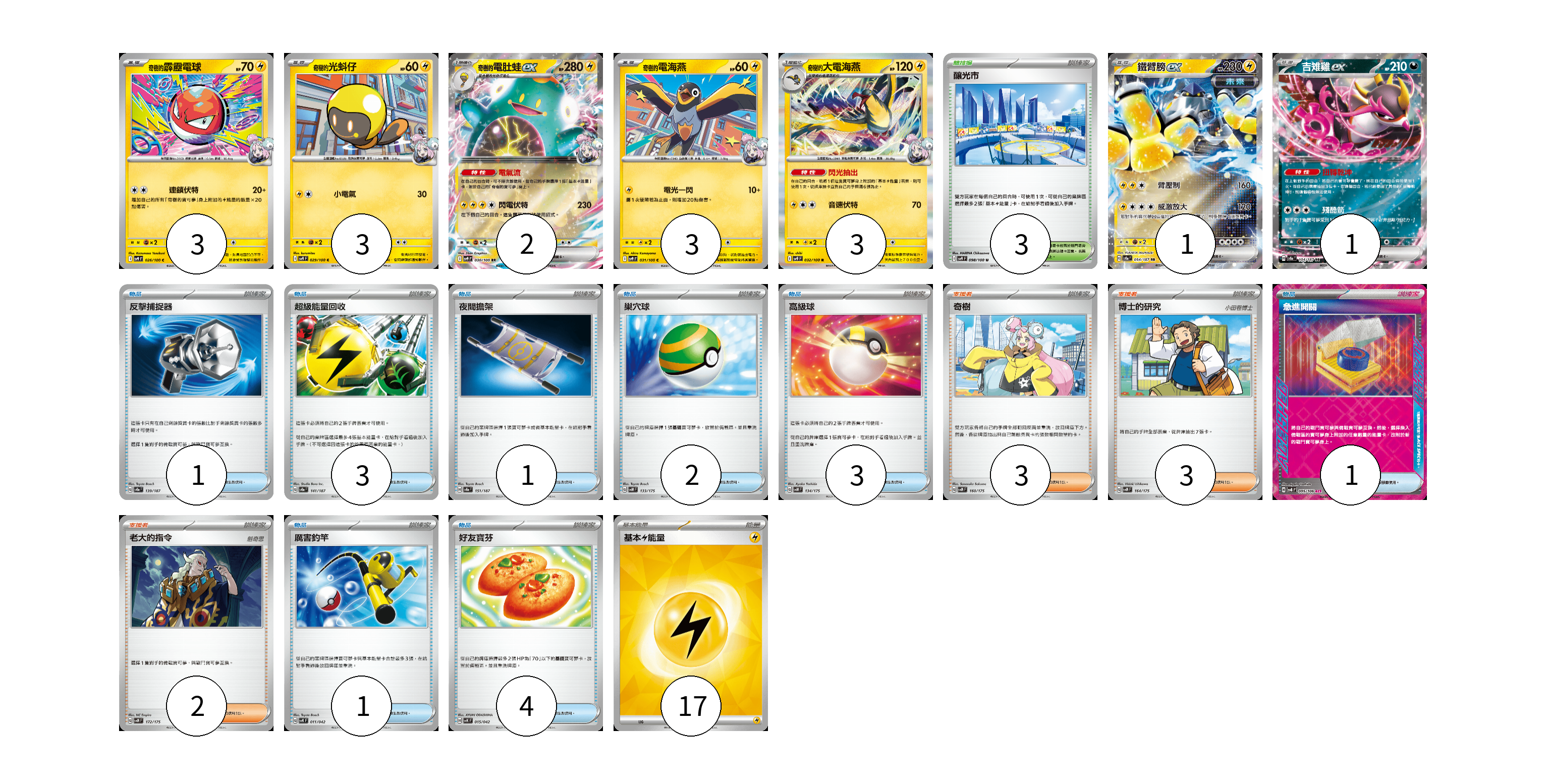 牌組構築方案 以此牌組為基礎新構築牌組 顯示卡面 顯示列表 寶可夢卡(16) 3 3 2 3 3 1 1 物品卡(16) 1 3 1 2 3 1 1 4 支援者卡(8) 3 3 2 競技場卡(3) 3 能量卡(17) 17 寶可夢卡(16) 卡牌名稱 張數 卡牌名稱 張數 奇樹的霹靂電球 SV9 026/100 03 奇樹的光蚪仔 SV9 029/100 03 奇樹的電肚蛙ex SV9 030/100 02 奇樹的電海燕 SV9 031/100 03 奇樹的大電海燕 SV9 032/100 03 鐵臂膀ex SV8a 054/187 01 吉雉雞ex SV8a 104/187 01 物品卡(16) 卡牌名稱 張數 卡牌名稱 張數 反擊捕捉器 SV8a 139/187 01 超級能量回收 SV8a 141/187 03 夜間擔架 SV8a 151/187 01 巢穴球 SVM 133/175 02 高級球 SVM 134/175 03 急進開關 SV8 095/106 01 厲害釣竿 SVK 011/042 01 好友寶芬 SVK 015/042 04 支援者卡(8) 卡牌名稱 張數 卡牌名稱 張數 奇樹 SVM 160/175 03 博士的研究 SVM 164/175 03 老大的指令 SVM 172/175 02 競技場卡(3) 卡牌名稱 張數 卡牌名稱 張數 釀光市 SV9 098/100 03 能量卡(17) 卡牌名稱 張數 卡牌名稱 張數 基本【雷】能量 SVM LIG 17 以此牌組為基礎新構築牌組 牌組編碼 WHnfGo-LFCHZU-zdiana copy 列印牌組單 牌組編碼已複製 分享至SNS