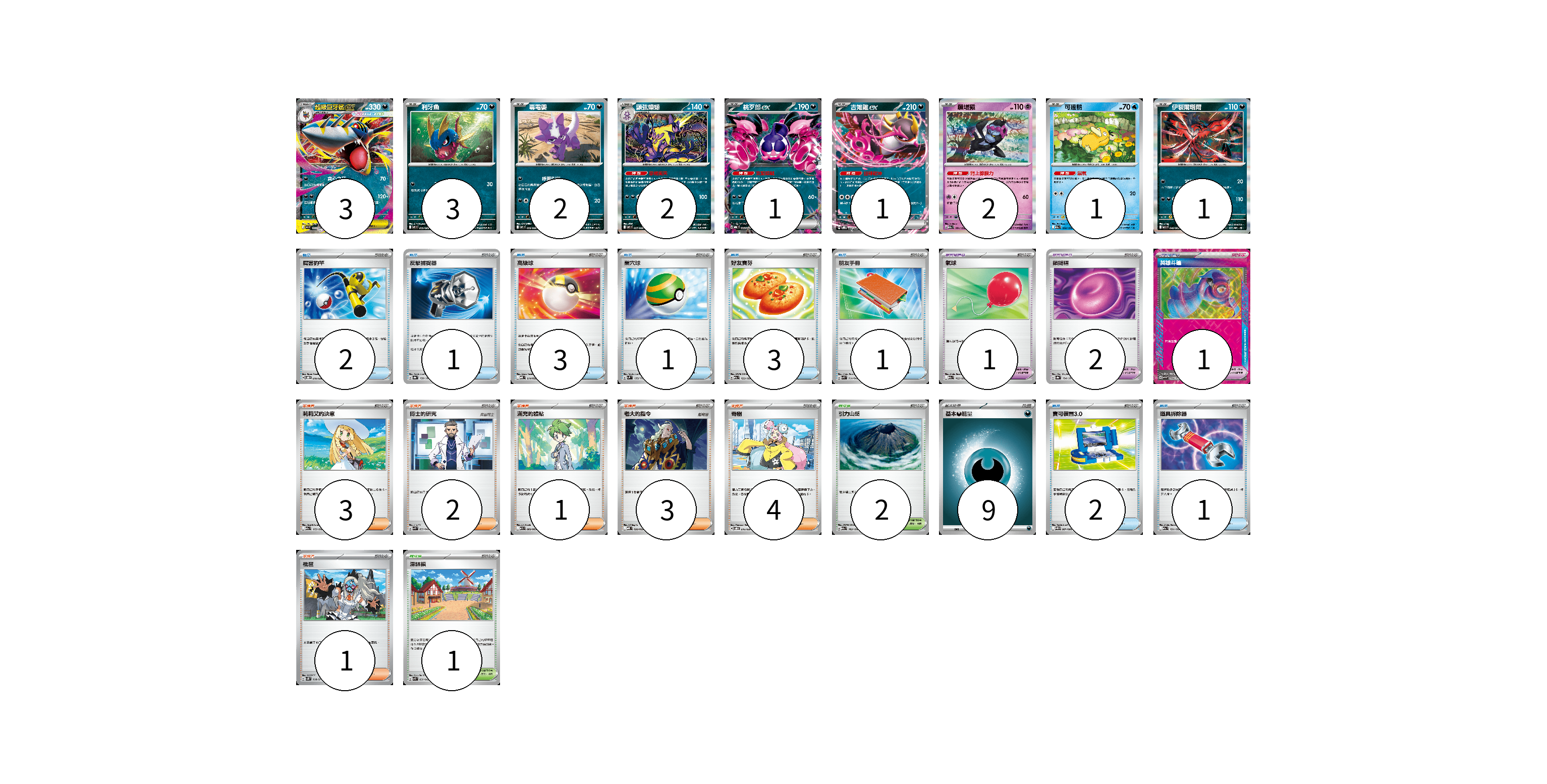 牌組構築方案 以此牌組為基礎新構築牌組 顯示卡面 顯示列表 寶可夢卡(16) 3 3 2 2 1 1 2 1 1 寶可夢道具(4) 1 2 1 物品卡(14) 2 1 3 1 3 1 2 1 支援者卡(14) 3 2 1 3 4 1 競技場卡(3) 2 1 能量卡(9) 9 寶可夢卡(16) 卡牌名稱 張數 卡牌名稱 張數 超級巨牙鯊ex M2 051/080 03 利牙魚 M2 050/080 03 毒電嬰 M2 056/080 02 顫弦蠑螈 M2 057/080 02 桃歹郎ex MBG 009/022 01 吉雉雞ex SVOD 004/020 01 願增猿 M2a 081/193 02 可達鴨 M2a 032/193 01 伊裴爾塔爾 M1L 040/063 01 寶可夢道具(4) 卡牌名稱 張數 卡牌名稱 張數 氣球 M2a 165/193 01 鎖鏈糬 SV8a 154/187 02 英雄斗篷 SV5M 064/071 01 物品卡(14) 卡牌名稱 張數 卡牌名稱 張數 厲害釣竿 SVOD 010/020 02 反擊捕捉器 SV8a 139/187 01 高級球 MBD 014/022 03 巢穴球 SVM 133/175 01 好友寶芬 M2a 153/193 03 朋友手冊 SVK 014/042 01 寶可裝置3.0 SV11B 081/086 02 道具拆除器 M2a 151/193 01 支援者卡(14) 卡牌名稱 張數 卡牌名稱 張數 莉莉艾的決意 M2a 175/193 03 博士的研究 SVK 033/042 02 滿充的體貼 M1S 060/063 01 老大的指令 MBD 020/022 03 奇樹 SVOD 016/020 04 枇琶 SV5K 068/071 01 競技場卡(3) 卡牌名稱 張數 卡牌名稱 張數 引力山岳 M2a 183/193 02 深缽鎮 SVK 039/042 01 能量卡(9) 卡牌名稱 張數 卡牌名稱 張數 基本【惡】能量 MBG DAR 09 以此牌組為基礎新構築牌組 牌組編碼 WJryNW-NVYoVp-SYAhwY copy 列印牌組單 牌組編碼已複製 分享至SNS
