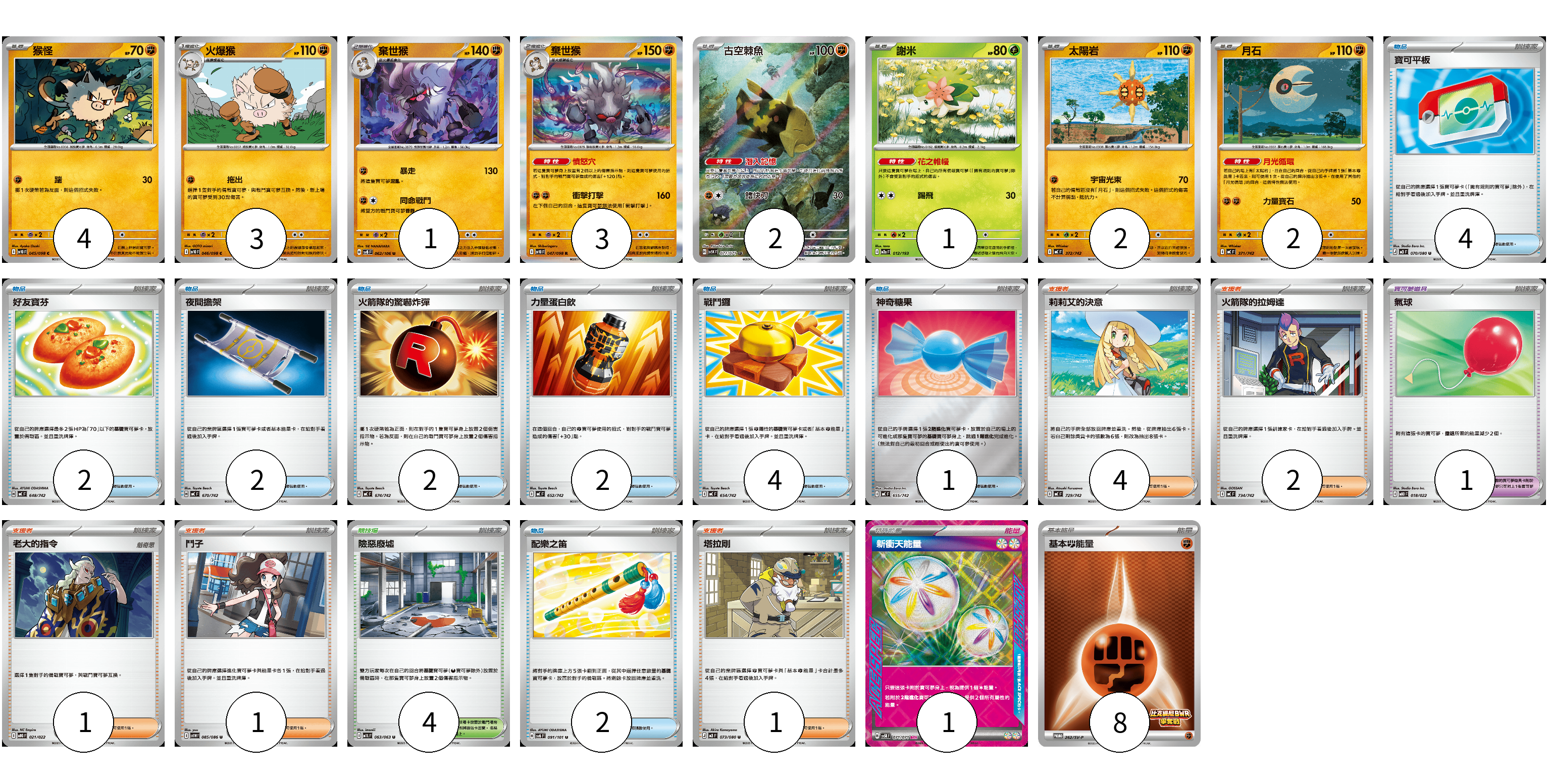牌組構築方案 以此牌組為基礎新構築牌組 顯示卡面 顯示列表 寶可夢卡(18) 4 3 1 3 2 1 2 2 寶可夢道具(1) 1 物品卡(19) 4 2 2 2 2 4 1 2 支援者卡(9) 4 2 1 1 1 競技場卡(4) 4 能量卡(9) 1 8 寶可夢卡(18) 卡牌名稱 張數 卡牌名稱 張數 猴怪 SV10 045/098 04 火爆猴 SV10 046/098 03 棄世猴 SV8 062/106 01 棄世猴 SV10 047/098 03 古空棘魚 SV5K 077/071 02 謝米 M2a 012/193 01 太陽岩 MC 372/742 02 月石 MC 371/742 02 寶可夢道具(1) 卡牌名稱 張數 卡牌名稱 張數 氣球 MBD 018/022 01 物品卡(19) 卡牌名稱 張數 卡牌名稱 張數 寶可平板 M3 070/080 04 好友寶芬 MC 648/742 02 夜間擔架 MC 670/742 02 火箭隊的驚嚇炸彈 MC 674/742 02 力量蛋白飲 MC 652/742 02 戰鬥鑼 MC 654/742 04 神奇糖果 MC 655/742 01 配樂之笛 SV6 091/101 02 支援者卡(9) 卡牌名稱 張數 卡牌名稱 張數 莉莉艾的決意 MC 729/742 04 火箭隊的拉姆達 MC 734/742 02 老大的指令 MBG 021/022 01 鬥子 SV11W 085/086 01 塔拉剛 M3 073/080 01 競技場卡(4) 卡牌名稱 張數 卡牌名稱 張數 險惡廢墟 M1L 063/063 04 能量卡(9) 卡牌名稱 張數 卡牌名稱 張數 新衝天能量 SV5K 071/071 01 基本【鬥】能量 SV-P 262/SV-P 08 以此牌組為基礎新構築牌組 牌組編碼 WJvids-URLHYO-Poaeiv copy 列印牌組單 牌組編碼已複製 分享至SNS