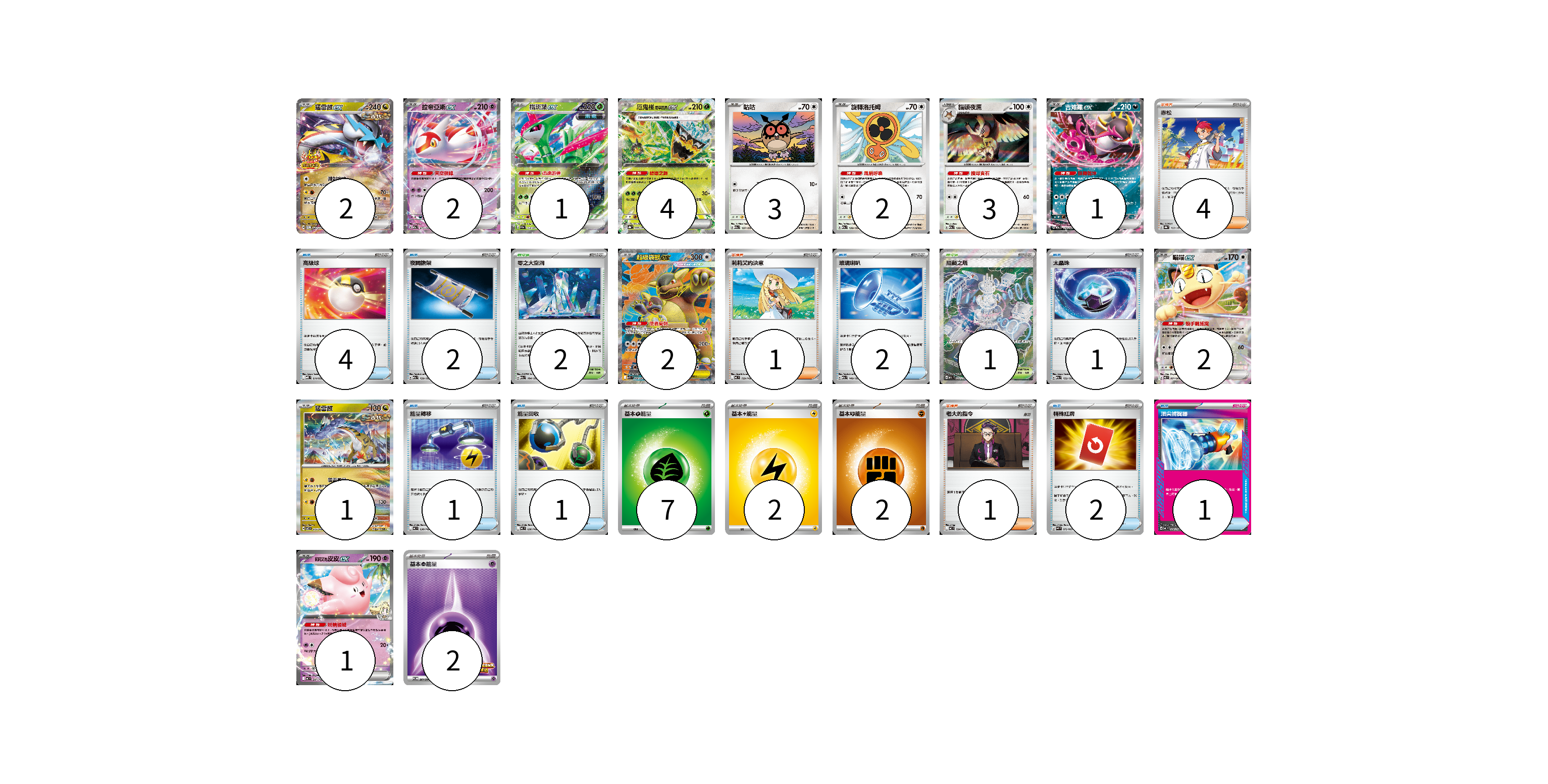 牌組構築方案 以此牌組為基礎新構築牌組 顯示卡面 顯示列表 寶可夢卡(24) 2 2 1 4 3 2 3 1 2 2 1 1 物品卡(14) 4 2 2 1 1 1 2 1 支援者卡(6) 4 1 1 競技場卡(3) 2 1 能量卡(13) 7 2 2 2 寶可夢卡(24) 卡牌名稱 張數 卡牌名稱 張數 猛雷鼓ex SV-P 081/SV-P 02 拉帝亞斯ex M2a 075/193 02 鐵斑葉ex SV5M 016/071 01 厄鬼椪 碧草面具ex SV8a 020/187 04 咕咕 M2a 137/193 03 旋轉洛托姆 M2a 139/193 02 貓頭夜鷹 M2a 138/193 03 吉雉雞ex M2a 114/193 01 超級袋獸ex M1S 080/063 02 喵喵ex M3 061/080 02 猛雷鼓 SV7 075/102 01 <莉莉艾的>皮皮ex MC 287/742 01 物品卡(14) 卡牌名稱 張數 卡牌名稱 張數 高級球 MBD 014/022 04 夜間擔架 M2a 159/193 02 玻璃喇叭 M2a 149/193 02 太晶珠 M2a 152/193 01 能量轉移 MC 638/742 01 能量回收 MC 636/742 01 特殊紅牌 M4 072/083 02 頂尖捕捉器 MC 656/742 01 支援者卡(6) 卡牌名稱 張數 卡牌名稱 張數 赤松 SV8a 163/187 04 莉莉艾的決意 MC 729/742 01 老大的指令 MC 724/742 01 競技場卡(3) 卡牌名稱 張數 卡牌名稱 張數 零之大空洞 M2a 184/193 02 阻礙之塔 M2a 222/193 01 能量卡(13) 卡牌名稱 張數 卡牌名稱 張數 基本【草】能量 MJ GRA 07 基本【雷】能量 MJ LIG 02 基本【鬥】能量 MC FIG 02 基本【超】能量 SV-P 261/SV-P 02 以此牌組為基礎新構築牌組 牌組編碼 WLARgB-EqFosn-YvSLUm copy 列印牌組單 牌組編碼已複製 分享至SNS