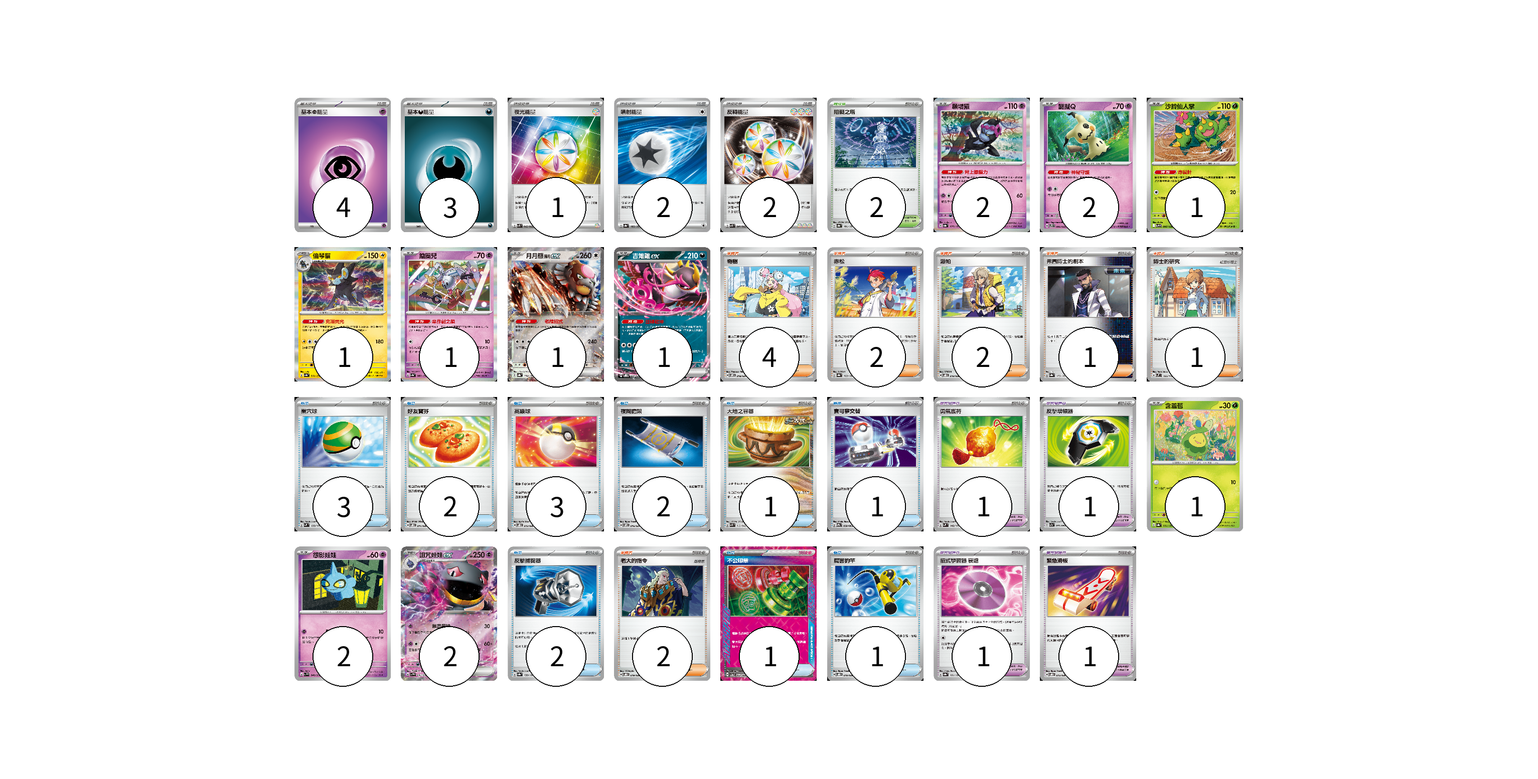 牌組構築方案 以此牌組為基礎新構築牌組 顯示卡面 顯示列表 寶可夢卡(14) 2 2 1 1 1 1 1 1 2 2 寶可夢道具(4) 1 1 1 1 物品卡(16) 3 2 3 2 1 1 2 1 1 支援者卡(12) 4 2 2 1 1 2 競技場卡(2) 2 能量卡(12) 4 3 1 2 2 寶可夢卡(14) 卡牌名稱 張數 卡牌名稱 張數 願增猿 SV8a 075/187 02 謎擬Q SVTS 006/022 02 沙鈴仙人掌 SV9 006/100 01 倫琴貓 SV4a 061/190 01 鑰圈兒 SV4a 087/190 01 月月熊 赫月ex SV8a 134/187 01 吉雉雞ex SVOD 004/020 01 含羞苞 SV8a 001/187 01 怨影娃娃 SV1V 040/078 02 詛咒娃娃ex SV1V 041/078 02 寶可夢道具(4) 卡牌名稱 張數 卡牌名稱 張數 勇氣護符 SVM 142/175 01 反擊增幅器 SV7a 059/064 01 招式學習器 衰退 SV8a 161/187 01 緊急滑板 SVOD 015/020 01 物品卡(16) 卡牌名稱 張數 卡牌名稱 張數 巢穴球 SVM 133/175 03 好友寶芬 SVOD 011/020 02 高級球 SVOD 012/020 03 夜間擔架 SVOM 016/021 02 大地之容器 SVK 012/042 01 寶可夢交替 SV9a 058/063 01 反擊捕捉器 SV8a 139/187 02 不公印章 SV5a 053/066 01 厲害釣竿 SVOD 010/020 01 支援者卡(12) 卡牌名稱 張數 卡牌名稱 張數 奇樹 SVOM 018/021 04 赤松 SV8a 163/187 02 派帕 SVOD 018/020 02 弗圖博士的劇本 SV8a 175/187 01 博士的研究 SVM 166/175 01 老大的指令 SVOD 019/020 02 競技場卡(2) 卡牌名稱 張數 卡牌名稱 張數 阻礙之塔 SV8a 181/187 02 能量卡(12) 卡牌名稱 張數 卡牌名稱 張數 基本超能量 sv-p PSY 04 基本惡能量 sv-p DAR 03 夜光能量 SVK 042/042 01 噴射能量 SV8a 185/187 02 反轉能量 SVK 041/042 02 以此牌組為基礎新構築牌組 牌組編碼 WLgOWm-gVwYjt-fMzuoj copy 列印牌組單 牌組編碼已複製 分享至SNS