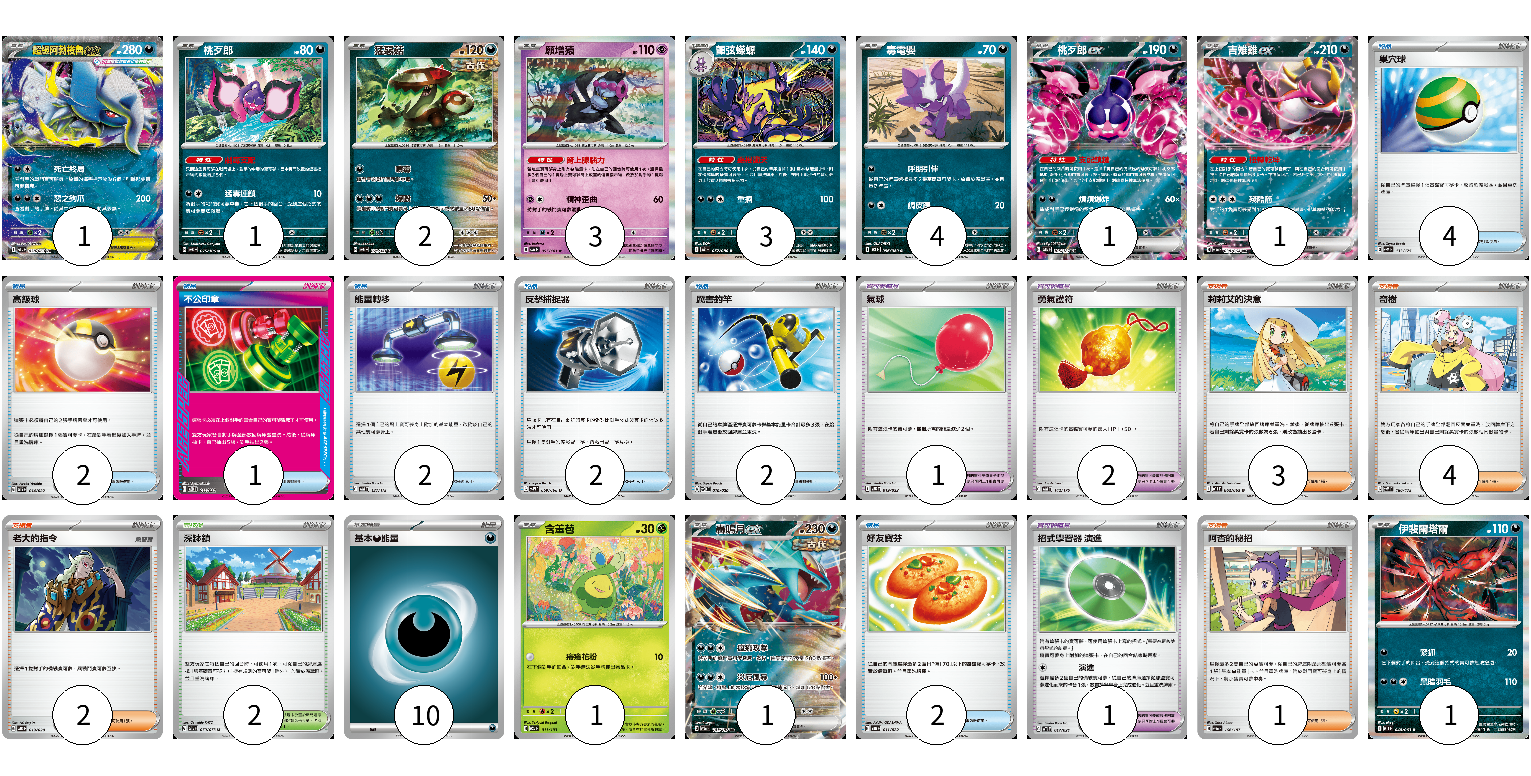 牌組構築方案 以此牌組為基礎新構築牌組 顯示卡面 顯示列表 寶可夢卡(19) 1 1 2 3 3 4 1 1 1 1 1 寶可夢道具(4) 1 2 1 物品卡(15) 4 2 1 2 2 2 2 支援者卡(10) 3 4 2 1 競技場卡(2) 2 能量卡(10) 10 寶可夢卡(19) 卡牌名稱 張數 卡牌名稱 張數 超級阿勃梭魯ex M1L 038/063 01 桃歹郎 SV8 075/106 01 猛惡菇 SV6 071/101 02 願增猿 SV6 055/101 03 顫弦蠑螈 M2 057/080 03 毒電嬰 M2 056/080 04 桃歹郎ex SV8a 105/187 01 吉雉雞ex SV6a 038/064 01 含羞苞 M2a 011/193 01 轟鳴月ex SV8a 101/187 01 伊裴爾塔爾 M1L 040/063 01 寶可夢道具(4) 卡牌名稱 張數 卡牌名稱 張數 氣球 MBG 019/022 01 勇氣護符 SVM 142/175 02 招式學習器 演進 SVTL 017/021 01 物品卡(15) 卡牌名稱 張數 卡牌名稱 張數 巢穴球 SVM 133/175 04 高級球 SVTS 014/022 02 不公印章 MBD 011/022 01 能量轉移 SVM 127/175 02 反擊捕捉器 SV4M 059/066 02 厲害釣竿 SVOD 010/020 02 好友寶芬 MBG 011/022 02 支援者卡(10) 卡牌名稱 張數 卡牌名稱 張數 莉莉艾的決意 M1L 062/063 03 奇樹 SVM 160/175 04 老大的指令 SVOD 019/020 02 阿杏的秘招 SV8a 166/187 01 競技場卡(2) 卡牌名稱 張數 卡牌名稱 張數 深缽鎮 SV1a 070/073 02 能量卡(10) 卡牌名稱 張數 卡牌名稱 張數 基本惡能量 sv-p DAR 10 以此牌組為基礎新構築牌組 牌組編碼 WNGyde-evFeCm-mzkhSG copy 列印牌組單 牌組編碼已複製 分享至SNS
