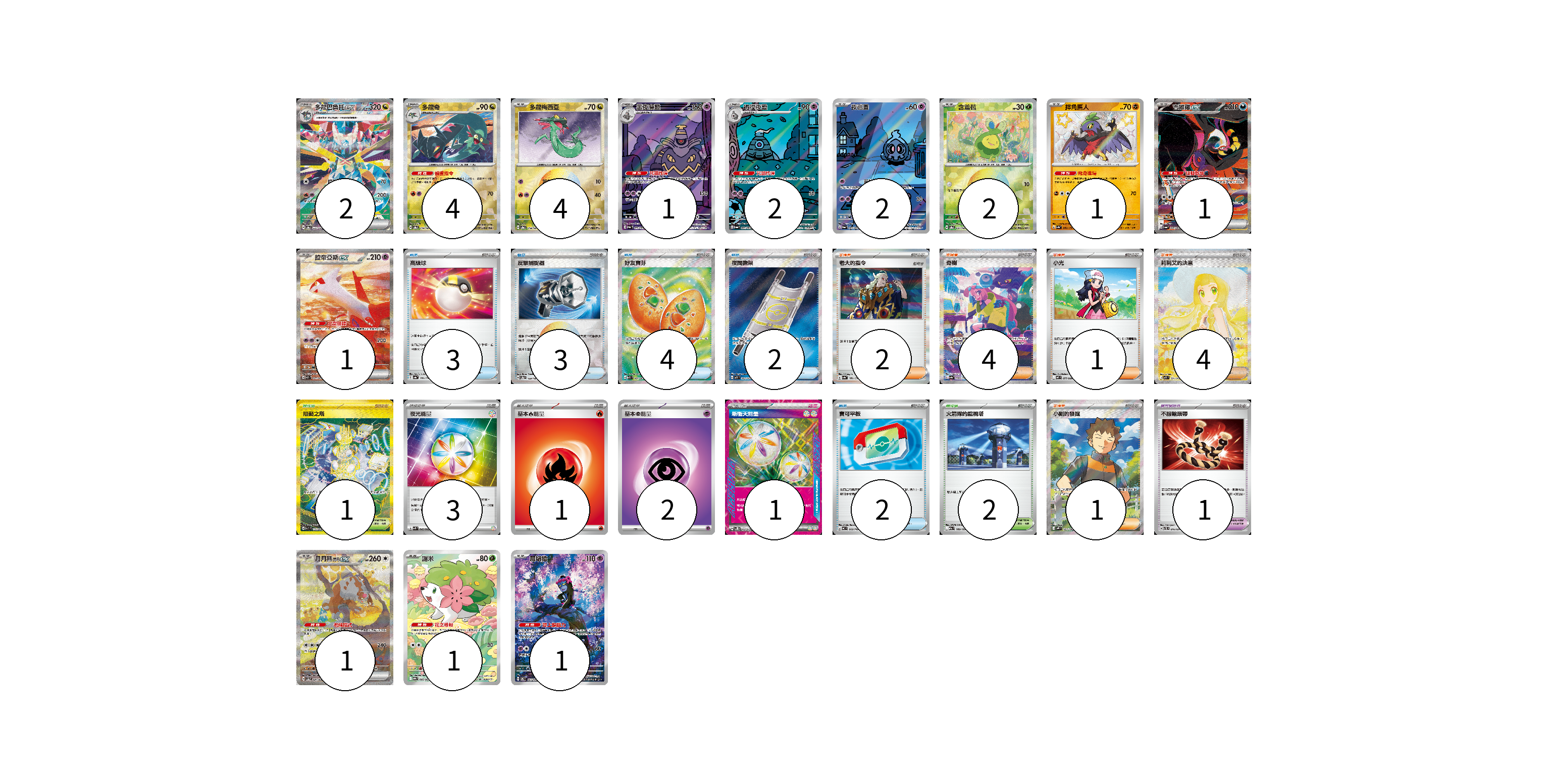 牌組構築方案 以此牌組為基礎新構築牌組 顯示卡面 顯示列表 寶可夢卡(23) 2 4 4 1 2 2 2 1 1 1 1 1 1 寶可夢道具(1) 1 物品卡(14) 3 3 4 2 2 支援者卡(12) 2 4 1 4 1 競技場卡(3) 1 2 能量卡(7) 3 1 2 1 寶可夢卡(23) 卡牌名稱 張數 卡牌名稱 張數 多龍巴魯托ex SV8a 221/187 02 多龍奇 SV8a 119/187 04 多龍梅西亞 SV8a 118/187 04 黑夜魔靈 SV6a 070/064 01 彷徨夜靈 SV6a 069/064 02 夜巡靈 SV6a 068/064 02 含羞苞 SV8a 001/187 02 摔角鷹人 SV4a 282/190 01 吉雉雞ex SV6a 089/064 01 拉帝亞斯ex SV7a 087/064 01 月月熊 赫月 ex SV5a 091/066 01 謝米 SV9a 066/063 01 願增猿 SV6 107/101 01 寶可夢道具(1) 卡牌名稱 張數 卡牌名稱 張數 不服輸頭帶 SVTL 016/021 01 物品卡(14) 卡牌名稱 張數 卡牌名稱 張數 高級球 SV4a 161/190 03 反擊捕捉器 SV8a 139/187 03 好友寶芬 M1S 081/063 04 夜間擔架 M1L 083/063 02 寶可平板 MC 662/742 02 支援者卡(12) 卡牌名稱 張數 卡牌名稱 張數 老大的指令 SV4a 181/190 02 奇樹 SV4a 350/190 04 小光 M2 077/080 01 莉莉艾的決意 M1L 091/063 04 小剛的發掘 SV9 123/100 01 競技場卡(3) 卡牌名稱 張數 卡牌名稱 張數 阻礙之塔 SV10 132/098 01 火箭隊的監視塔 M2a 189/193 02 能量卡(7) 卡牌名稱 張數 卡牌名稱 張數 夜光能量 SVK 042/042 03 基本火能量 sv-p FIR 01 基本超能量 sv-p PSY 02 新衝天能量 SV5K 071/071 01 以此牌組為基礎新構築牌組 牌組編碼 WNKsWD-seoDgo-qGjPDo copy 列印牌組單 牌組編碼已複製 分享至SNS