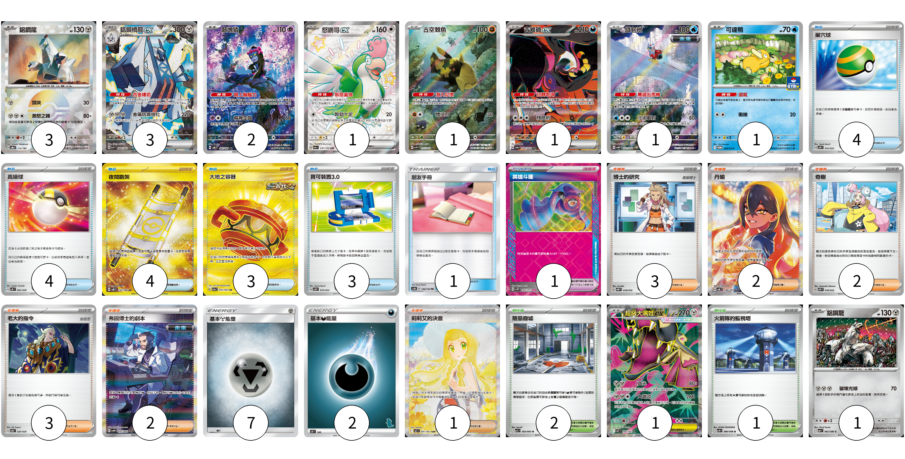 牌組構築方案 以此牌組為基礎新構築牌組 顯示卡面 顯示列表 寶可夢卡(15) 3 3 2 1 1 1 1 1 1 1 寶可夢道具(1) 1 物品卡(19) 4 4 4 3 3 1 支援者卡(13) 3 2 2 3 2 1 競技場卡(3) 2 1 能量卡(9) 7 2 寶可夢卡(15) 卡牌名稱 張數 卡牌名稱 張數 鋁鋼龍 SV8a 112/187 03 鋁鋼橋龍ex SV7a 088/064 03 願增猿 SV6 107/101 02 怒鸚哥ex SV4a 337/190 01 古空棘魚 SV5K 077/071 01 吉雉雞ex SV6a 089/064 01 鐵包袱 SV4M 071/066 01 可達鴨 SV-P 220/SV-P 01 超級大嘴娃ex M1L 080/063 01 鋁鋼龍 M2 062/080 01 寶可夢道具(1) 卡牌名稱 張數 卡牌名稱 張數 英雄斗篷 SV5M 064/071 01 物品卡(19) 卡牌名稱 張數 卡牌名稱 張數 巢穴球 SVAW 014/023 04 高級球 SVB 002/028 04 夜間擔架 SV8 137/106 04 大地之容器 SV6a 093/064 03 寶可裝置3.0 SVAW 016/023 03 朋友手冊 AS6b 188/194 01 支援者卡(13) 卡牌名稱 張數 卡牌名稱 張數 博士的研究 SVTG 018/019 03 丹瑜 SV6 130/101 02 奇樹 SVTS 018/022 02 老大的指令 SVEM 020/020 03 弗圖博士的劇本 SV4M 091/066 02 莉莉艾的決意 M1L 091/063 01 競技場卡(3) 卡牌名稱 張數 卡牌名稱 張數 險惡廢墟 M1L 063/063 02 火箭隊的監視塔 SV10 096/098 01 能量卡(9) 卡牌名稱 張數 卡牌名稱 張數 基本鋼能量 AS6D MET 07 基本惡能量 SH DAR 02 以此牌組為基礎新構築牌組 牌組編碼 WNamzT-elnfvm-pUoInF copy 列印牌組單 牌組編碼已複製 分享至SNS