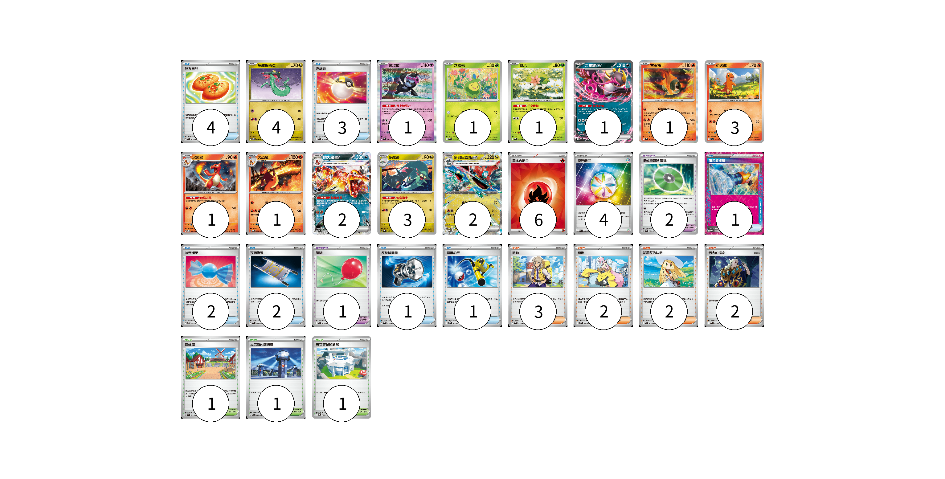 牌組構築方案 以此牌組為基礎新構築牌組 顯示卡面 顯示列表 寶可夢卡(21) 4 1 1 1 1 1 3 1 1 2 3 2 寶可夢道具(3) 2 1 物品卡(14) 4 3 1 2 2 1 1 支援者卡(9) 3 2 2 2 競技場卡(3) 1 1 1 能量卡(10) 6 4 寶可夢卡(21) 卡牌名稱 張數 卡牌名稱 張數 多龍梅西亞 SV6 079/101 04 願增猿 SV8a 075/187 01 含羞苞 SV8a 001/187 01 謝米 SV9a 006/063 01 吉雉雞ex SVOD 004/020 01 古玉魚 SV4K 016/066 01 小火龍 SVTL 001/021 03 火恐龍 SVTL 002/021 01 火恐龍 SVQL 002/022 01 噴火龍ex SV3 066/108 02 多龍奇 SV8a 119/187 03 多龍巴魯托ex SV8a 120/187 02 寶可夢道具(3) 卡牌名稱 張數 卡牌名稱 張數 招式學習器 演進 SV8a 160/187 02 氣球 MBG 019/022 01 物品卡(14) 卡牌名稱 張數 卡牌名稱 張數 好友寶芬 MBD 013/022 04 高級球 MBD 014/022 03 頂尖捕捉器 SV8a 148/187 01 神奇糖果 SVOD 013/020 02 夜間擔架 MBG 017/022 02 反擊捕捉器 SVK 009/042 01 厲害釣竿 SVOM 011/021 01 支援者卡(9) 卡牌名稱 張數 卡牌名稱 張數 派帕 SVK 035/042 03 奇樹 SVOM 018/021 02 莉莉艾的決意 MBG 022/022 02 老大的指令 MBG 021/022 02 競技場卡(3) 卡牌名稱 張數 卡牌名稱 張數 深缽鎮 SVK 039/042 01 火箭隊的監視塔 SV10 096/098 01 寶可夢聯盟總部 SV4a 186/190 01 能量卡(10) 卡牌名稱 張數 卡牌名稱 張數 基本【火】能量 SVQL FIR 06 夜光能量 SVK 042/042 04 以此牌組為基礎新構築牌組 牌組編碼 WRxgIB-AgEniZ-osJHZH copy 列印牌組單 牌組編碼已複製 分享至SNS