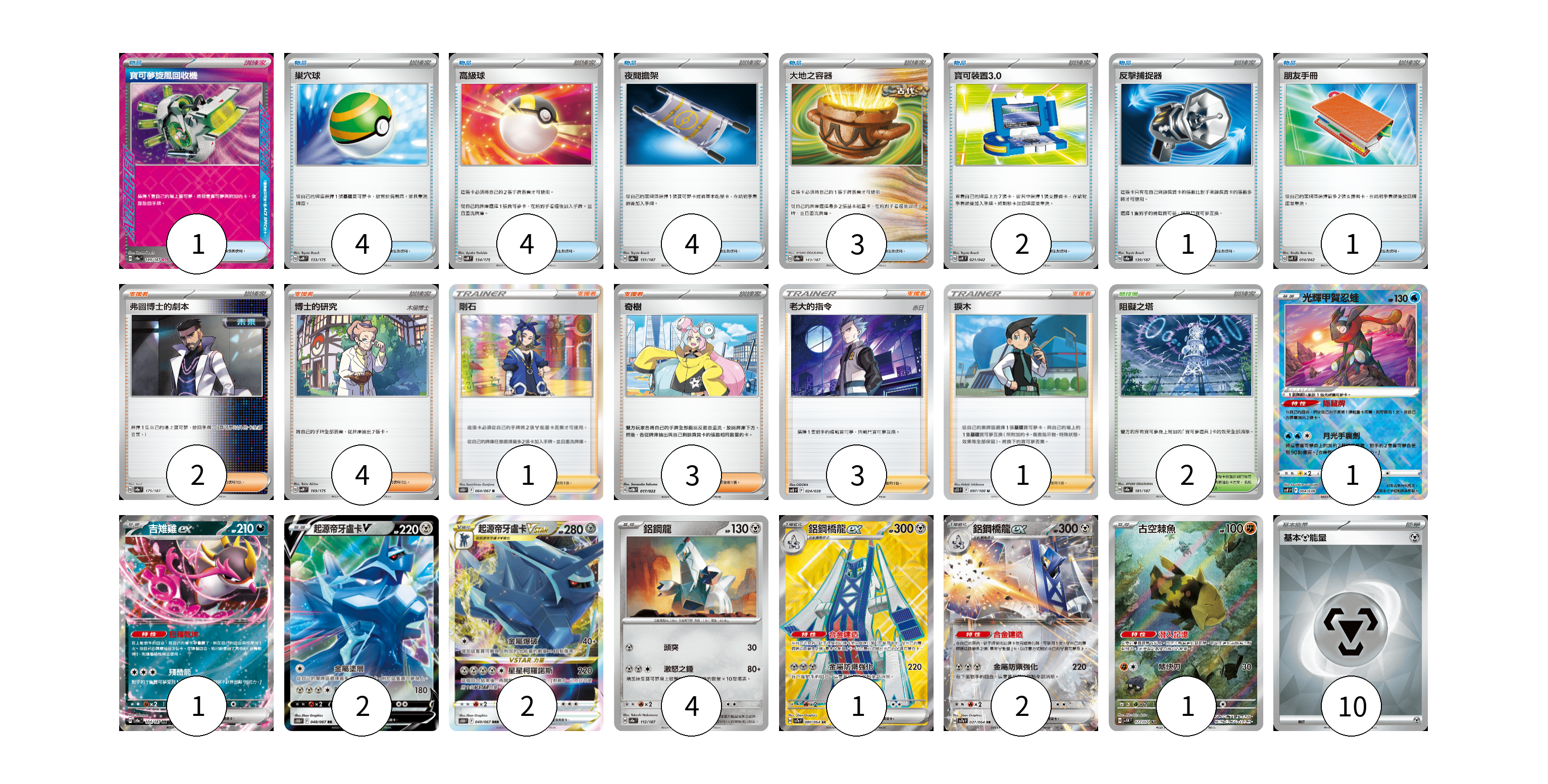 牌組構築方案 以此牌組為基礎新構築牌組 顯示卡面 顯示列表 寶可夢卡(14) 1 1 2 2 4 1 2 1 物品卡(20) 1 4 4 4 3 2 1 1 支援者卡(14) 2 4 1 3 3 1 競技場卡(2) 2 能量卡(10) 10 寶可夢卡(14) 卡牌名稱 張數 卡牌名稱 張數 光輝甲賀忍蛙 SVF 004/038 01 吉雉雞ex SV8a 104/187 01 起源帝牙盧卡V S10D 048/067 02 起源帝牙盧卡VSTAR S10D 049/067 02 鋁鋼龍 SV8a 112/187 04 鋁鋼橋龍ex SV7a 080/064 01 鋁鋼橋龍ex SV7a 037/064 02 古空棘魚 SV5K 077/071 01 物品卡(20) 卡牌名稱 張數 卡牌名稱 張數 寶可夢旋風回收機 SV8a 149/187 01 巢穴球 SVM 133/175 04 高級球 SVM 134/175 04 夜間擔架 SV8a 151/187 04 大地之容器 SV8a 143/187 03 寶可裝置3.0 SVK 021/042 02 反擊捕捉器 SV8a 139/187 01 朋友手冊 SVK 014/042 01 支援者卡(14) 卡牌名稱 張數 卡牌名稱 張數 弗圖博士的劇本 SV8a 175/187 02 博士的研究 SVM 169/175 04 剛石 S10D 064/067 01 奇樹 SVTM 017/022 03 老大的指令(赤日) SVB 024/028 03 捩木 S11 097/100 01 競技場卡(2) 卡牌名稱 張數 卡牌名稱 張數 阻礙之塔 SV8a 181/187 02 能量卡(10) 卡牌名稱 張數 卡牌名稱 張數 基本【鋼】能量 SVM MET 10 以此牌組為基礎新構築牌組 牌組編碼 WSDrhS-PclrNQ-oLjaVC copy 列印牌組單 牌組編碼已複製 分享至SNS