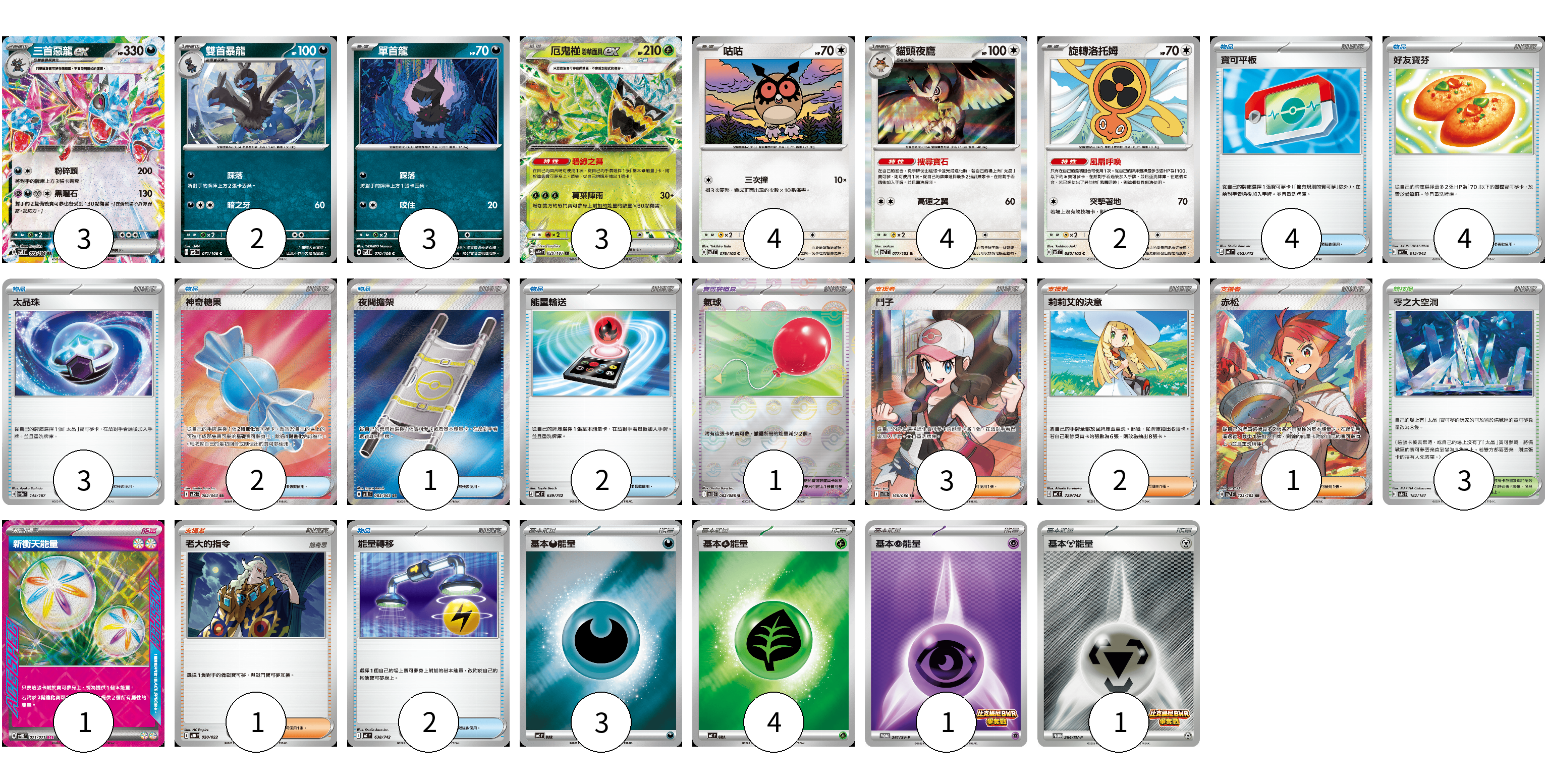 牌組構築方案 以此牌組為基礎新構築牌組 顯示卡面 顯示列表 寶可夢卡(21) 3 2 3 3 4 4 2 寶可夢道具(1) 1 物品卡(18) 4 4 3 2 1 2 2 支援者卡(7) 3 2 1 1 競技場卡(3) 3 能量卡(10) 1 3 4 1 1 寶可夢卡(21) 卡牌名稱 張數 卡牌名稱 張數 三首惡龍ex SV8 072/106 03 雙首暴龍 SV8 071/106 02 單首龍 SV8 070/106 03 厄鬼椪 碧草面具ex SV8a 020/187 03 咕咕 SV7 076/102 04 貓頭夜鷹 SV7 077/102 04 旋轉洛托姆 SV7 080/102 02 寶可夢道具(1) 卡牌名稱 張數 卡牌名稱 張數 氣球 SV11B 082/086 01 物品卡(18) 卡牌名稱 張數 卡牌名稱 張數 寶可平板 MC 662/742 04 好友寶芬 SVK 015/042 04 太晶珠 SV8a 145/187 03 神奇糖果 M1S 082/063 02 夜間擔架 M1L 083/063 01 能量輸送 MC 639/742 02 能量轉移 MC 638/742 02 支援者卡(7) 卡牌名稱 張數 卡牌名稱 張數 鬥子 SV11W 166/086 03 莉莉艾的決意 MC 729/742 02 赤松 SV7 123/102 01 老大的指令 MBD 020/022 01 競技場卡(3) 卡牌名稱 張數 卡牌名稱 張數 零之大空洞 SV8a 182/187 03 能量卡(10) 卡牌名稱 張數 卡牌名稱 張數 新衝天能量 SV5K 071/071 01 基本【惡】能量 MC DAR 03 基本【草】能量 MC GRA 04 基本【超】能量 SV-P 261/SV-P 01 基本【鋼】能量 SV-P 264/SV-P 01 以此牌組為基礎新構築牌組 牌組編碼 WSdSPn-yYaQnG-aysNOy copy 列印牌組單 牌組編碼已複製 分享至SNS