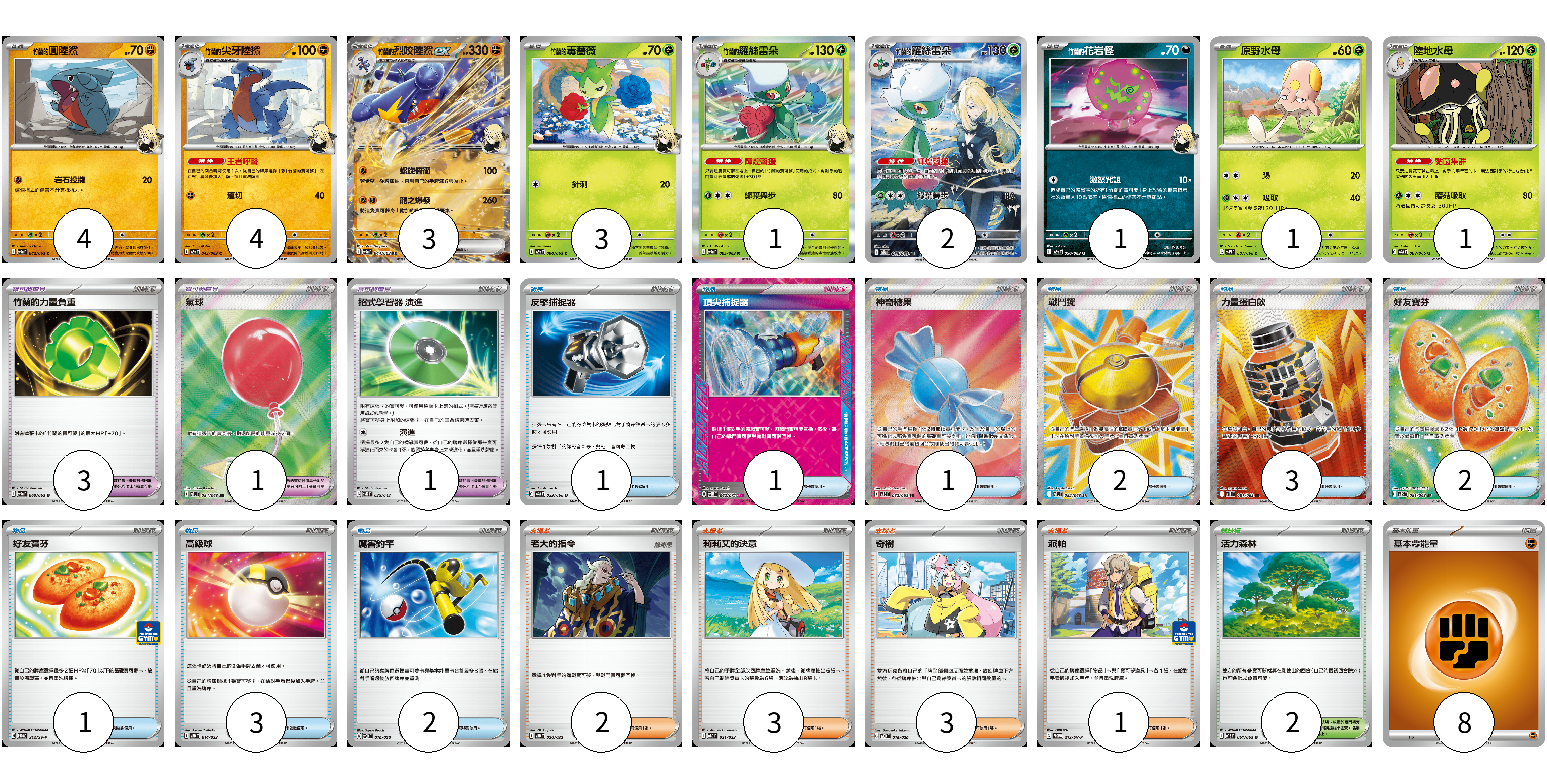 牌組構築方案 以此牌組為基礎新構築牌組 顯示卡面 顯示列表 寶可夢卡(20) 4 4 3 3 1 2 1 1 1 寶可夢道具(5) 3 1 1 物品卡(16) 1 1 1 2 3 2 1 3 2 支援者卡(9) 2 3 3 1 競技場卡(2) 2 能量卡(8) 8 寶可夢卡(20) 卡牌名稱 張數 卡牌名稱 張數 <竹蘭的>圓陸鯊 SV9a 042/063 04 <竹蘭的>尖牙陸鯊 SV9a 043/063 04 <竹蘭的>烈咬陸鯊ex SV9a 044/063 03 <竹蘭的>毒薔薇 SV9a 004/063 03 <竹蘭的>羅絲雷朵 SV9a 005/063 01 <竹蘭的>羅絲雷朵 SV9a 065/063 02 <竹蘭的>花岩怪 SV9a 050/063 01 原野水母 SV4M 007/066 01 陸地水母 SV4M 008/066 01 寶可夢道具(5) 卡牌名稱 張數 卡牌名稱 張數 竹蘭的力量負重 SV9a 060/063 03 氣球 M1L 084/063 01 招式學習器 演進 SVK 025/042 01 物品卡(16) 卡牌名稱 張數 卡牌名稱 張數 反擊捕捉器 SV4M 059/066 01 頂尖捕捉器 SV5M 062/071 01 神奇糖果 M1S 082/063 01 戰鬥鑼 M1L 082/063 02 力量蛋白飲 M1L 081/063 03 好友寶芬 M1S 081/063 02 好友寶芬 SV-P 212/SV-P 01 高級球 MBD 014/022 03 厲害釣竿 SVOD 010/020 02 支援者卡(9) 卡牌名稱 張數 卡牌名稱 張數 老大的指令 MBD 020/022 02 莉莉艾的決意 MBD 021/022 03 奇樹 SVOD 016/020 03 派帕 SV-P 213/SV-P 01 競技場卡(2) 卡牌名稱 張數 卡牌名稱 張數 活力森林 M1S 061/063 02 能量卡(8) 卡牌名稱 張數 卡牌名稱 張數 基本鬥能量 sv-p FIG 08 以此牌組為基礎新構築牌組 牌組編碼 WStiHE-ytlWLv-tKakYP copy 列印牌組單 牌組編碼已複製 分享至SNS
