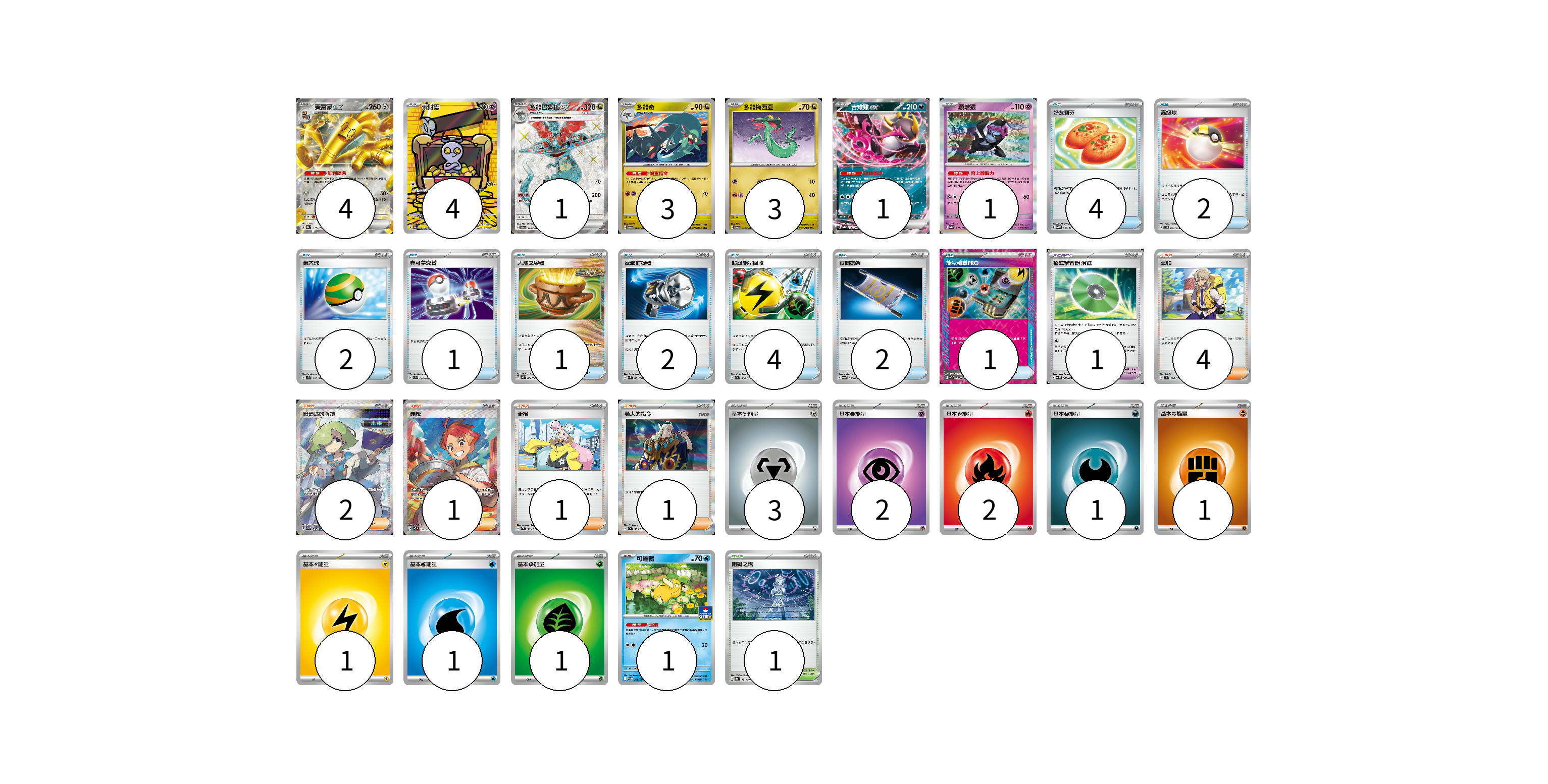 牌組構築方案 以此牌組為基礎新構築牌組 顯示卡面 顯示列表 寶可夢卡(18) 4 4 1 3 3 1 1 1 寶可夢道具(1) 1 物品卡(19) 4 2 2 1 1 2 4 2 1 支援者卡(9) 4 2 1 1 1 競技場卡(1) 1 能量卡(12) 3 2 2 1 1 1 1 1 寶可夢卡(18) 卡牌名稱 張數 卡牌名稱 張數 賽富豪ex SV8a 117/187 04 索財靈 SV3a 068/062 04 多龍巴魯托ex SV6 120/101 01 多龍奇 SV6 080/101 03 多龍梅西亞 SV6 079/101 03 吉雉雞ex SV8a 104/187 01 願增猿 SV8a 075/187 01 可達鴨 SV-P 220/SV-P 01 寶可夢道具(1) 卡牌名稱 張數 卡牌名稱 張數 招式學習器 演進 SV4M 063/066 01 物品卡(19) 卡牌名稱 張數 卡牌名稱 張數 好友寶芬 SV5K 063/071 04 高級球 SVB 002/028 02 巢穴球 SV1S 070/078 02 寶可夢交替 SVB 005/028 01 大地之容器 SV4K 060/066 01 反擊捕捉器 SV4M 059/066 02 超級能量回收 SV1a 064/073 04 夜間擔架 SV6a 056/064 02 能量輸送PRO SV7a 052/064 01 支援者卡(9) 卡牌名稱 張數 卡牌名稱 張數 派帕 SV1V 076/078 04 暗碼迷的解讀 SV5M 090/071 02 赤松 SV7 123/102 01 奇樹 SV2D 069/071 01 老大的指令 SV1a 069/073 01 競技場卡(1) 卡牌名稱 張數 卡牌名稱 張數 阻礙之塔 SV8a 181/187 01 能量卡(12) 卡牌名稱 張數 卡牌名稱 張數 基本鋼能量 sv-p MET 03 基本超能量 sv-p PSY 02 基本火能量 sv-p FIR 02 基本惡能量 sv-p DAR 01 基本【鬥】能量 SVAM FIG 01 基本雷能量 sv-p LIG 01 基本水能量 sv-p WAT 01 基本草能量 sv-p GRA 01 以此牌組為基礎新構築牌組 牌組編碼 WTLCyO-HsZIRY-LnZfCt copy 列印牌組單 牌組編碼已複製 分享至SNS