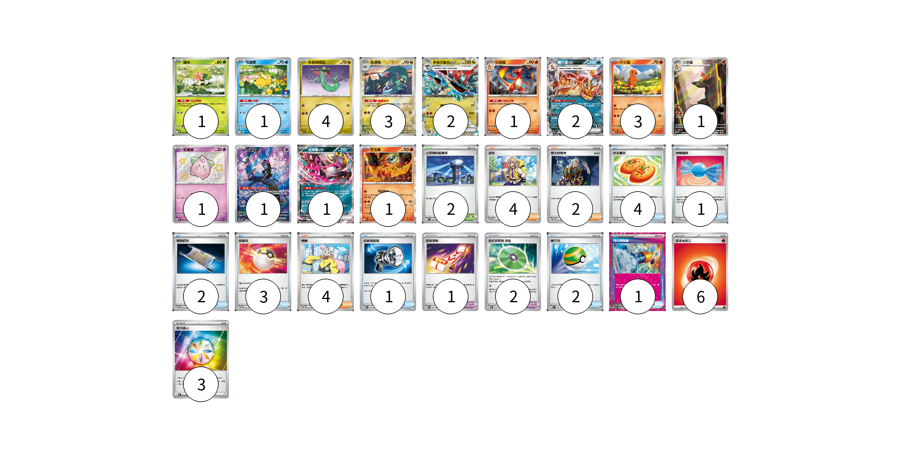 牌組構築方案 以此牌組為基礎新構築牌組 顯示卡面 顯示列表 寶可夢卡(22) 1 1 4 3 2 1 2 3 1 1 1 1 1 寶可夢道具(3) 1 2 物品卡(14) 4 1 2 3 1 2 1 支援者卡(10) 4 2 4 競技場卡(2) 2 能量卡(9) 6 3 寶可夢卡(22) 卡牌名稱 張數 卡牌名稱 張數 謝米 SV9a 006/063 01 可達鴨 SV-P 220/SV-P 01 多龍梅西亞 SV8a 118/187 04 多龍奇 SV8a 119/187 03 多龍巴魯托ex SV8a 120/187 02 火恐龍 SVTL 002/021 01 噴火龍ex SVTL 006/021 02 小火龍 SV4a 025/190 03 火恐龍 SV2a 169/165 01 皮寶寶 SV4a 255/190 01 願增猿 SV6 107/101 01 吉雉雞ex SV6a 038/064 01 古玉魚 SV8a 025/187 01 寶可夢道具(3) 卡牌名稱 張數 卡牌名稱 張數 緊急滑板 SV8a 153/187 01 招式學習器 演進 SV8a 160/187 02 物品卡(14) 卡牌名稱 張數 卡牌名稱 張數 好友寶芬 SVOM 012/021 04 神奇糖果 SVOM 014/021 01 夜間擔架 SVOM 016/021 02 高級球 SVOM 013/021 03 反擊捕捉器 SV8a 139/187 01 巢穴球 SVM 133/175 02 頂尖捕捉器 SV8a 148/187 01 支援者卡(10) 卡牌名稱 張數 卡牌名稱 張數 派帕 SVOD 018/020 04 老大的指令 SVOD 019/020 02 奇樹 SVOM 018/021 04 競技場卡(2) 卡牌名稱 張數 卡牌名稱 張數 火箭隊的監視塔 SV10 096/098 02 能量卡(9) 卡牌名稱 張數 卡牌名稱 張數 基本【火】能量 SVHK FIR 06 夜光能量 SV4a 190/190 03 以此牌組為基礎新構築牌組 牌組編碼 WTwMqO-eisHbG-RkOFCb copy 列印牌組單 牌組編碼已複製 分享至SNS