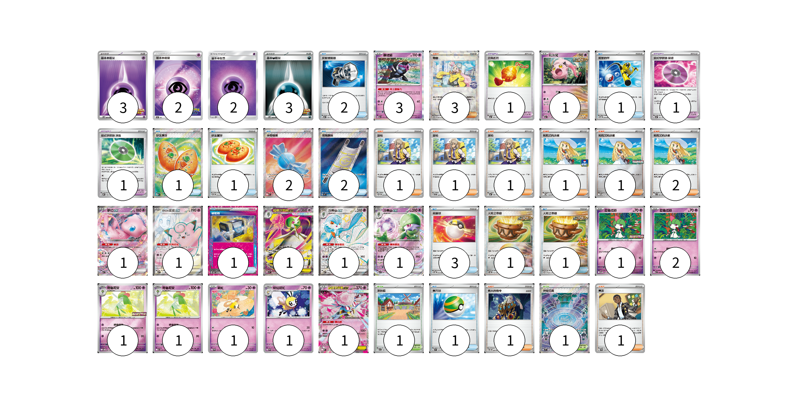 牌組構築方案 以此牌組為基礎新構築牌組 顯示卡面 顯示列表 寶可夢卡(17) 3 1 1 1 1 1 1 1 2 1 1 1 1 1 寶可夢道具(3) 1 1 1 物品卡(16) 2 1 1 1 2 2 1 3 1 1 1 支援者卡(12) 3 1 1 1 1 1 2 1 1 競技場卡(2) 1 1 能量卡(10) 3 2 2 3 寶可夢卡(17) 卡牌名稱 張數 卡牌名稱 張數 願增猿 SV8a 075/187 03 吼叫尾 SV4K 032/066 01 夢幻ex SV4a 076/190 01 莉莉艾的皮皮ex SV9 115/100 01 超級沙奈朵ex M1S 078/063 01 沙奈朵ex SV4a 328/190 01 沙奈朵ex SV4a 082/190 01 拉魯拉絲 M-P 005/M-P 01 拉魯拉絲 M1S 040/063 02 奇魯莉安 M-P 006/M-P 01 奇魯莉安 M1S 041/063 01 萌虻 SV5M 033/071 01 蝶結萌虻 SV5M 034/071 01 超級蒂安希ex MBD 006/022 01 寶可夢道具(3) 卡牌名稱 張數 卡牌名稱 張數 勇氣護符 SV4a 169/190 01 招式學習器 衰退 SV8a 161/187 01 招式學習器 演進 SV8a 160/187 01 物品卡(16) 卡牌名稱 張數 卡牌名稱 張數 反擊捕捉器 SV8a 139/187 02 厲害釣竿 SVOD 010/020 01 好友寶芬 M1S 081/063 01 好友寶芬 SVOM 012/021 01 神奇糖果 M1S 082/063 02 夜間擔架 M1L 083/063 02 秘密箱 SV6 092/101 01 高級球 SVOD 012/020 03 大地之容器 SV8a 143/187 01 大地之容器 SV-P 084/SV-P 01 巢穴球 SVK 016/042 01 支援者卡(12) 卡牌名稱 張數 卡牌名稱 張數 奇樹 SV-P 247/SV-P 03 派帕 SVOD 018/020 01 派帕 SVTL 020/021 01 派帕 SV4a 180/190 01 莉莉艾的決意 M-P 018/M-P 01 莉莉艾的決意 M-P 011/M-P 01 莉莉艾的決意 M1L 062/063 02 老大的指令 SVOM 020/021 01 賽吉 SV5M 068/071 01 競技場卡(2) 卡牌名稱 張數 卡牌名稱 張數 深缽鎮 SV4a 185/190 01 神秘花園 M1S 086/063 01 能量卡(10) 卡牌名稱 張數 卡牌名稱 張數 基本【超】能量 SV-P 261/SV-P 03 基本超能量 S10b PSY 02 基本超能量 AS6D PSY 02 基本【惡】能量 SV-P 263/SV-P 03 以此牌組為基礎新構築牌組 牌組編碼 WUKOta-jKINPt-BiDZpu copy 列印牌組單 牌組編碼已複製 分享至SNS