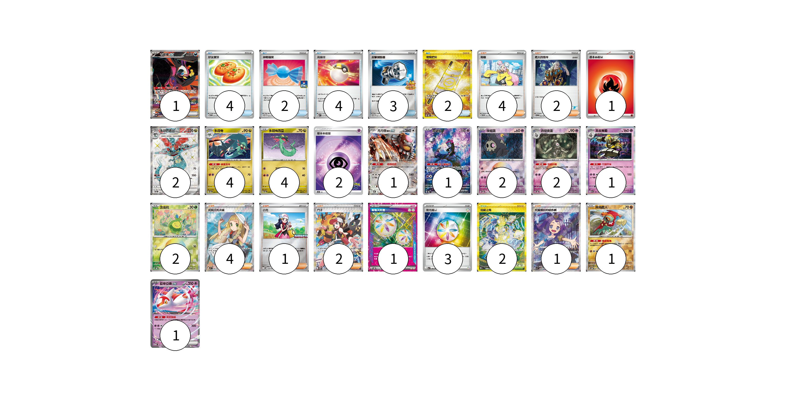 牌組構築方案 以此牌組為基礎新構築牌組 顯示卡面 顯示列表 寶可夢卡(22) 1 2 4 4 1 1 2 2 1 2 1 1 物品卡(15) 4 2 4 3 2 支援者卡(14) 4 2 4 1 2 1 競技場卡(2) 2 能量卡(7) 1 2 1 3 寶可夢卡(22) 卡牌名稱 張數 卡牌名稱 張數 吉雉雞ex SV6a 089/064 01 多龍巴魯托ex SV6 120/101 02 多龍奇 SV6 080/101 04 多龍梅西亞 SV6 079/101 04 月月熊 赫月ex SV8a 134/187 01 願增猿 SV6 107/101 01 夜巡靈 SV8a 064/187 02 彷徨夜靈 SV8a 065/187 02 黑夜魔靈 SV8a 066/187 01 含羞苞 SV8a 001/187 02 摔角鷹人 SV8a 084/187 01 拉帝亞斯ex MBD 003/022 01 物品卡(15) 卡牌名稱 張數 卡牌名稱 張數 好友寶芬 SVTL 010/021 04 神奇糖果 SV-P 104/SV-P 02 高級球 SVK 018/042 04 反擊捕捉器 SV-P 083/SV-P 03 夜間擔架 SV8 137/106 02 支援者卡(14) 卡牌名稱 張數 卡牌名稱 張數 奇樹 SVTH 015/018 04 老大的指令 SVI 066/066 02 莉莉艾的決意 M1L 086/063 04 小光 M-P 028/M-P 01 鬥子 SV11W 173/086 02 阿塞蘿拉的惡作劇 M1S 084/063 01 競技場卡(2) 卡牌名稱 張數 卡牌名稱 張數 阻礙之塔 SV10 132/098 02 能量卡(7) 卡牌名稱 張數 卡牌名稱 張數 基本【火】能量 SVF FIR 01 基本超能量 S10b PSY 02 新衝天能量 SV5K 071/071 01 夜光能量 SV4a 190/190 03 以此牌組為基礎新構築牌組 牌組編碼 WWATWf-ppLkGj-vpwtGd copy 列印牌組單 牌組編碼已複製 分享至SNS