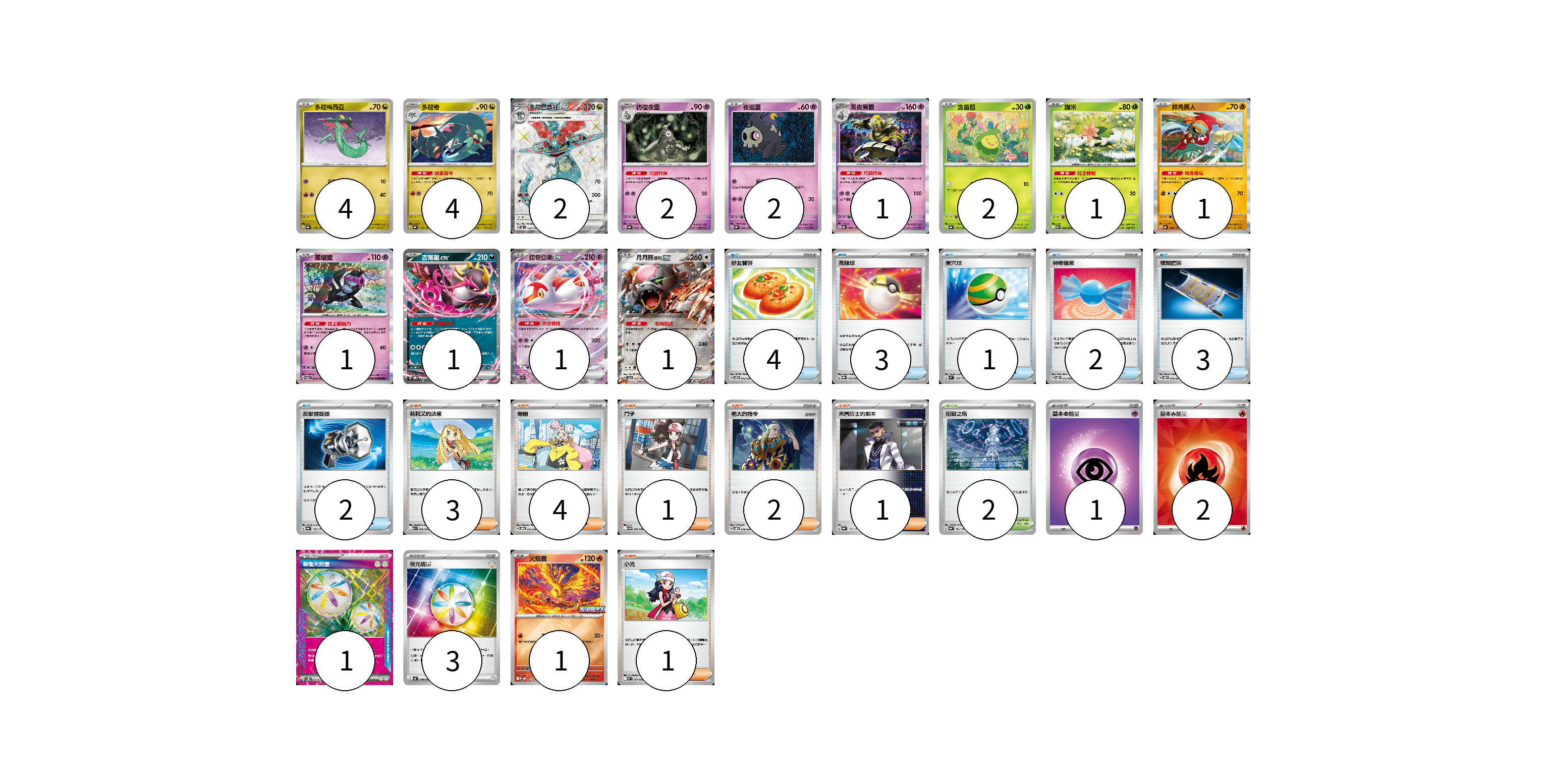 牌組構築方案 以此牌組為基礎新構築牌組 顯示卡面 顯示列表 寶可夢卡(24) 4 4 2 2 2 1 2 1 1 1 1 1 1 1 物品卡(15) 4 3 1 2 3 2 支援者卡(12) 3 4 1 2 1 1 競技場卡(2) 2 能量卡(7) 1 2 1 3 寶可夢卡(24) 卡牌名稱 張數 卡牌名稱 張數 多龍梅西亞 SV8a 118/187 04 多龍奇 SV8a 119/187 04 多龍巴魯托ex SV6 120/101 02 彷徨夜靈 SV8a 065/187 02 夜巡靈 SV8a 064/187 02 黑夜魔靈 SV8a 066/187 01 含羞苞 SV8a 001/187 02 謝米 SV9a 006/063 01 摔角鷹人 SV8a 084/187 01 願增猿 SV6 055/101 01 吉雉雞ex SVOD 004/020 01 拉帝亞斯ex SV7a 019/064 01 月月熊 赫月 ex SV5a 052/066 01 火焰鳥 M-P 022/M-P 01 物品卡(15) 卡牌名稱 張數 卡牌名稱 張數 好友寶芬 SVOM 012/021 04 高級球 SVQL 015/022 03 巢穴球 SVM 133/175 01 神奇糖果 SVOD 013/020 02 夜間擔架 SVOM 016/021 03 反擊捕捉器 SV8a 139/187 02 支援者卡(12) 卡牌名稱 張數 卡牌名稱 張數 莉莉艾的決意 M1L 062/063 03 奇樹 SVOD 016/020 04 鬥子 SV11W 085/086 01 老大的指令 SVOD 019/020 02 弗圖博士的劇本 SV8a 175/187 01 小光 M2 077/080 01 競技場卡(2) 卡牌名稱 張數 卡牌名稱 張數 阻礙之塔 SV8a 181/187 02 能量卡(7) 卡牌名稱 張數 卡牌名稱 張數 基本【超】能量 M-P PSY 01 基本【火】能量 SVQL FIR 02 新衝天能量 SV5K 071/071 01 夜光能量 SV4a 190/190 03 以此牌組為基礎新構築牌組 牌組編碼 WWleRI-KwxVOU-RTyCGD copy 列印牌組單 牌組編碼已複製 分享至SNS