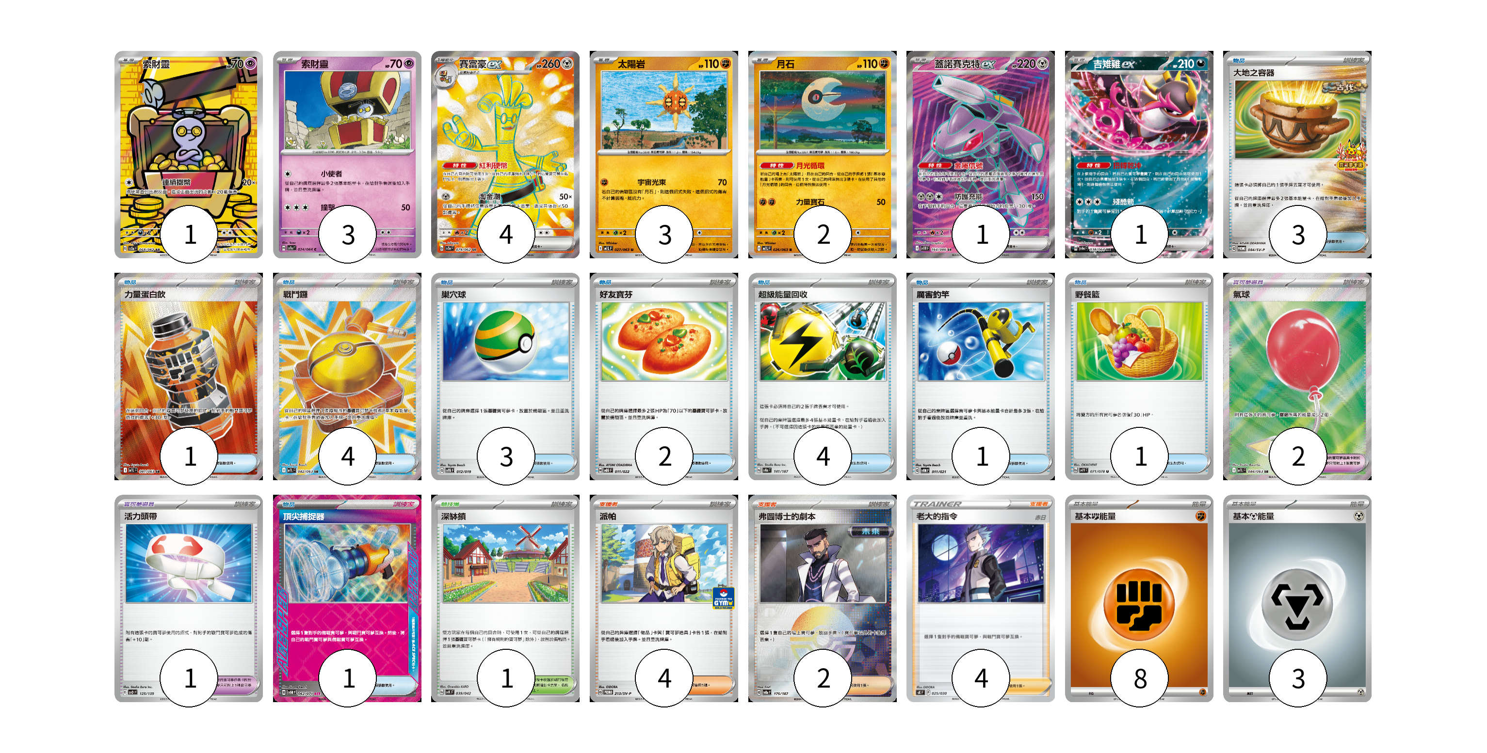 牌組構築方案 以此牌組為基礎新構築牌組 顯示卡面 顯示列表 寶可夢卡(15) 1 3 4 3 2 1 1 寶可夢道具(3) 2 1 物品卡(20) 3 1 4 3 2 4 1 1 1 支援者卡(10) 4 2 4 競技場卡(1) 1 能量卡(11) 8 3 寶可夢卡(15) 卡牌名稱 張數 卡牌名稱 張數 索財靈 SV3a 068/062 01 索財靈 SV7a 024/064 03 賽富豪ex SV3a 079/062 04 太陽岩 M1L 027/063 03 月石 M1L 026/063 02 蓋諾賽克特ex SV11B 164/086 01 吉雉雞ex SV6a 038/064 01 寶可夢道具(3) 卡牌名稱 張數 卡牌名稱 張數 氣球 M1L 084/063 02 活力頭帶 SVD 125/139 01 物品卡(20) 卡牌名稱 張數 卡牌名稱 張數 大地之容器 SV-P 084/SV-P 03 力量蛋白飲 M1L 081/063 01 戰鬥鑼 M1L 082/063 04 巢穴球 SVTG 012/019 03 好友寶芬 MBG 011/022 02 超級能量回收 SV8a 141/187 04 厲害釣竿 SVOM 011/021 01 野餐籃 SV1V 071/078 01 頂尖捕捉器 SV5M 062/071 01 支援者卡(10) 卡牌名稱 張數 卡牌名稱 張數 派帕 SV-P 213/SV-P 04 弗圖博士的劇本 SV8a 175/187 02 老大的指令(赤日) SK 025/030 04 競技場卡(1) 卡牌名稱 張數 卡牌名稱 張數 深缽鎮 SVK 039/042 01 能量卡(11) 卡牌名稱 張數 卡牌名稱 張數 基本【鬥】能量 SVD FIG 08 基本【鋼】能量 SVB MET 03 以此牌組為基礎新構築牌組 牌組編碼 WaPqFK-IKIcRT-YRVzNi copy 列印牌組單 牌組編碼已複製 分享至SNS