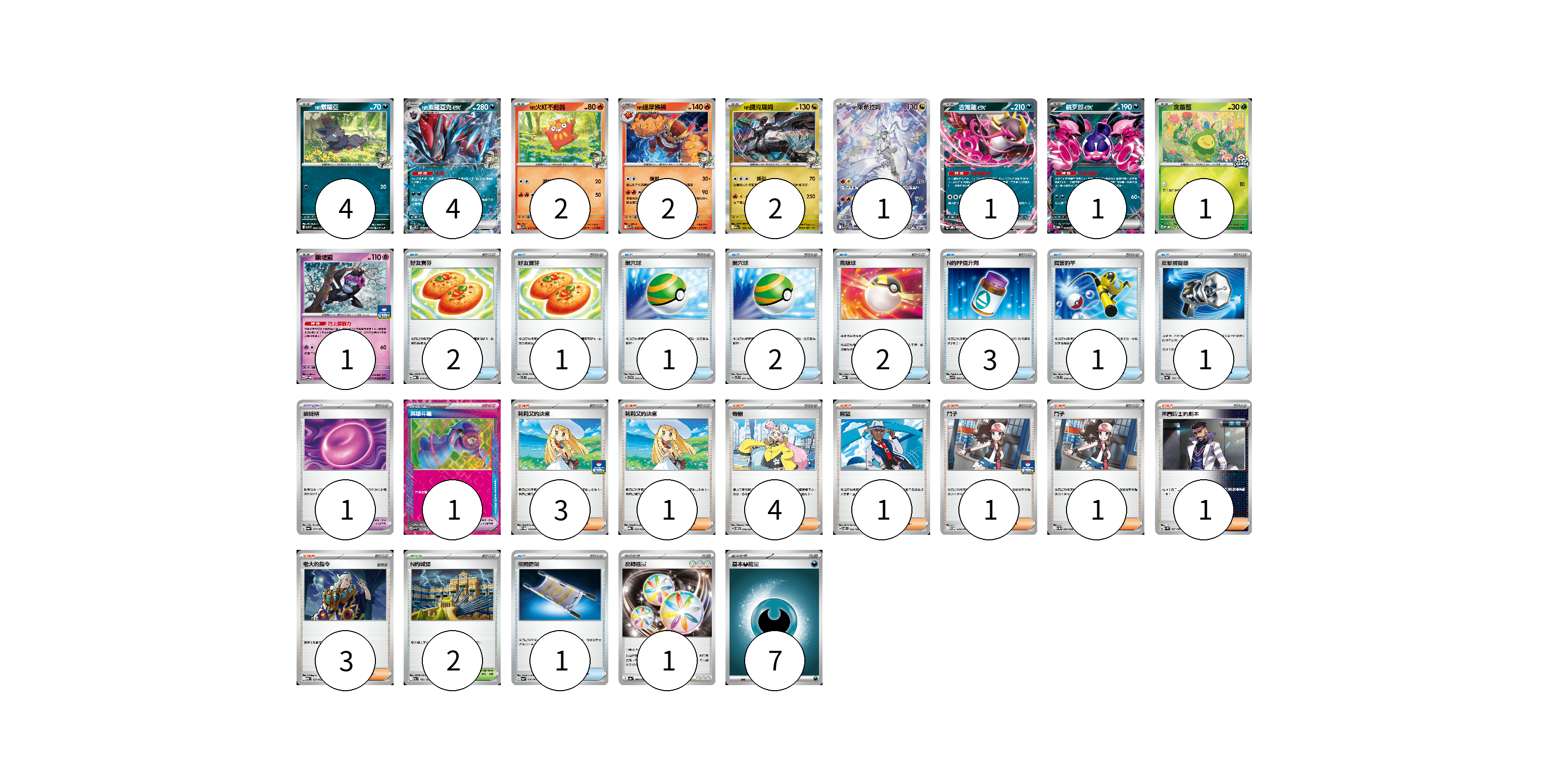 牌組構築方案 以此牌組為基礎新構築牌組 顯示卡面 顯示列表 寶可夢卡(19) 4 4 2 2 2 1 1 1 1 1 寶可夢道具(2) 1 1 物品卡(14) 2 1 1 2 2 3 1 1 1 支援者卡(15) 3 1 4 1 1 1 1 3 競技場卡(2) 2 能量卡(8) 1 7 寶可夢卡(19) 卡牌名稱 張數 卡牌名稱 張數 N的索羅亞 SV9 060/100 04 N的索羅亞克ex SV9 061/100 04 N的火紅不倒翁 SV9 015/100 02 N的達摩狒狒 SV9 016/100 02 N的捷克羅姆 M2a 129/193 02 N的萊希拉姆 SV9 109/100 01 吉雉雞ex SVOD 004/020 01 桃歹郎ex MBG 009/022 01 含羞苞 M-P 037/M-P 01 願增猿 M-P 014/M-P 01 寶可夢道具(2) 卡牌名稱 張數 卡牌名稱 張數 鎖鏈糬 SV6a 057/064 01 英雄斗篷 SV5M 064/071 01 物品卡(14) 卡牌名稱 張數 卡牌名稱 張數 好友寶芬 MBG 011/022 02 好友寶芬 SVTL 010/021 01 巢穴球 SVTH 010/018 01 巢穴球 SVTL 011/021 02 高級球 MBG 012/022 02 N的PP提升劑 SV9 089/100 03 厲害釣竿 SVTL 009/021 01 反擊捕捉器 SV8a 139/187 01 夜間擔架 SV6a 056/064 01 支援者卡(15) 卡牌名稱 張數 卡牌名稱 張數 莉莉艾的決意 M-P 018/M-P 03 莉莉艾的決意 MBG 022/022 01 奇樹 SVOM 018/021 04 席藍 SV8 102/106 01 鬥子 M-P 048/M-P 01 鬥子 SV11W 085/086 01 弗圖博士的劇本 SV4M 065/066 01 老大的指令 MBG 021/022 03 競技場卡(2) 卡牌名稱 張數 卡牌名稱 張數 N的城堡 M2a 181/193 02 能量卡(8) 卡牌名稱 張數 卡牌名稱 張數 反轉能量 SV4a 189/190 01 基本【惡】能量 MBG DAR 07 以此牌組為基礎新構築牌組 牌組編碼 WbBSCo-LINKWP-YItmvy copy 列印牌組單 牌組編碼已複製 分享至SNS