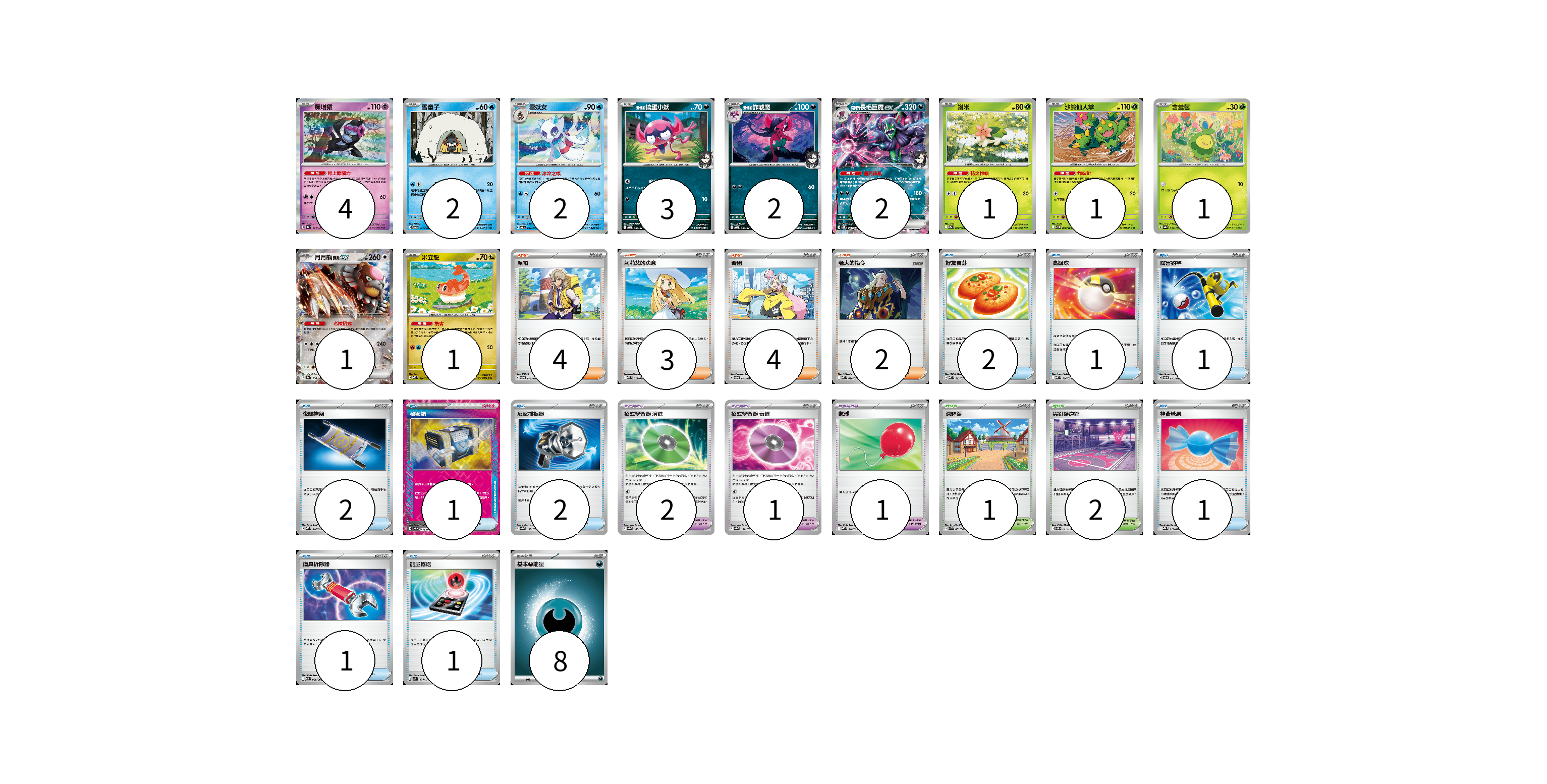 牌組構築方案 以此牌組為基礎新構築牌組 顯示卡面 顯示列表 寶可夢卡(20) 4 2 2 3 2 2 1 1 1 1 1 寶可夢道具(4) 2 1 1 物品卡(12) 2 1 1 2 1 2 1 1 1 支援者卡(13) 4 3 4 2 競技場卡(3) 1 2 能量卡(8) 8 寶可夢卡(20) 卡牌名稱 張數 卡牌名稱 張數 願增猿 SV8a 075/187 04 雪童子 SV6 031/101 02 雪妖女 SV6 033/101 02 <瑪俐的>搗蛋小妖 SVOM 005/021 03 <瑪俐的>詐唬魔 SVOM 006/021 02 <瑪俐的>長毛巨魔ex SVOM 007/021 02 謝米 SV9a 006/063 01 沙鈴仙人掌 SV9 006/100 01 含羞苞 SV8a 001/187 01 月月熊 赫月ex SV8a 134/187 01 米立龍 MBD 010/022 01 寶可夢道具(4) 卡牌名稱 張數 卡牌名稱 張數 招式學習器 演進 SV8a 160/187 02 招式學習器 衰退 SV8a 161/187 01 氣球 MBD 018/022 01 物品卡(12) 卡牌名稱 張數 卡牌名稱 張數 好友寶芬 MBD 013/022 02 高級球 MBD 014/022 01 厲害釣竿 SVOD 010/020 01 夜間擔架 MBD 016/022 02 秘密箱 SV6 092/101 01 反擊捕捉器 SV8a 139/187 02 神奇糖果 MBG 013/022 01 道具拆除器 SV11W 080/086 01 能量輸送 SVM 128/175 01 支援者卡(13) 卡牌名稱 張數 卡牌名稱 張數 派帕 SVOD 018/020 04 莉莉艾的決意 MBD 021/022 03 奇樹 SVOD 016/020 04 老大的指令 MBD 020/022 02 競技場卡(3) 卡牌名稱 張數 卡牌名稱 張數 深缽鎮 SVK 039/042 01 尖釘鎮道館 SVOM 021/021 02 能量卡(8) 卡牌名稱 張數 卡牌名稱 張數 基本【惡】能量 MBG DAR 08 以此牌組為基礎新構築牌組 牌組編碼 WbByOT-yaXFkT-SzQXwG copy 列印牌組單 牌組編碼已複製 分享至SNS