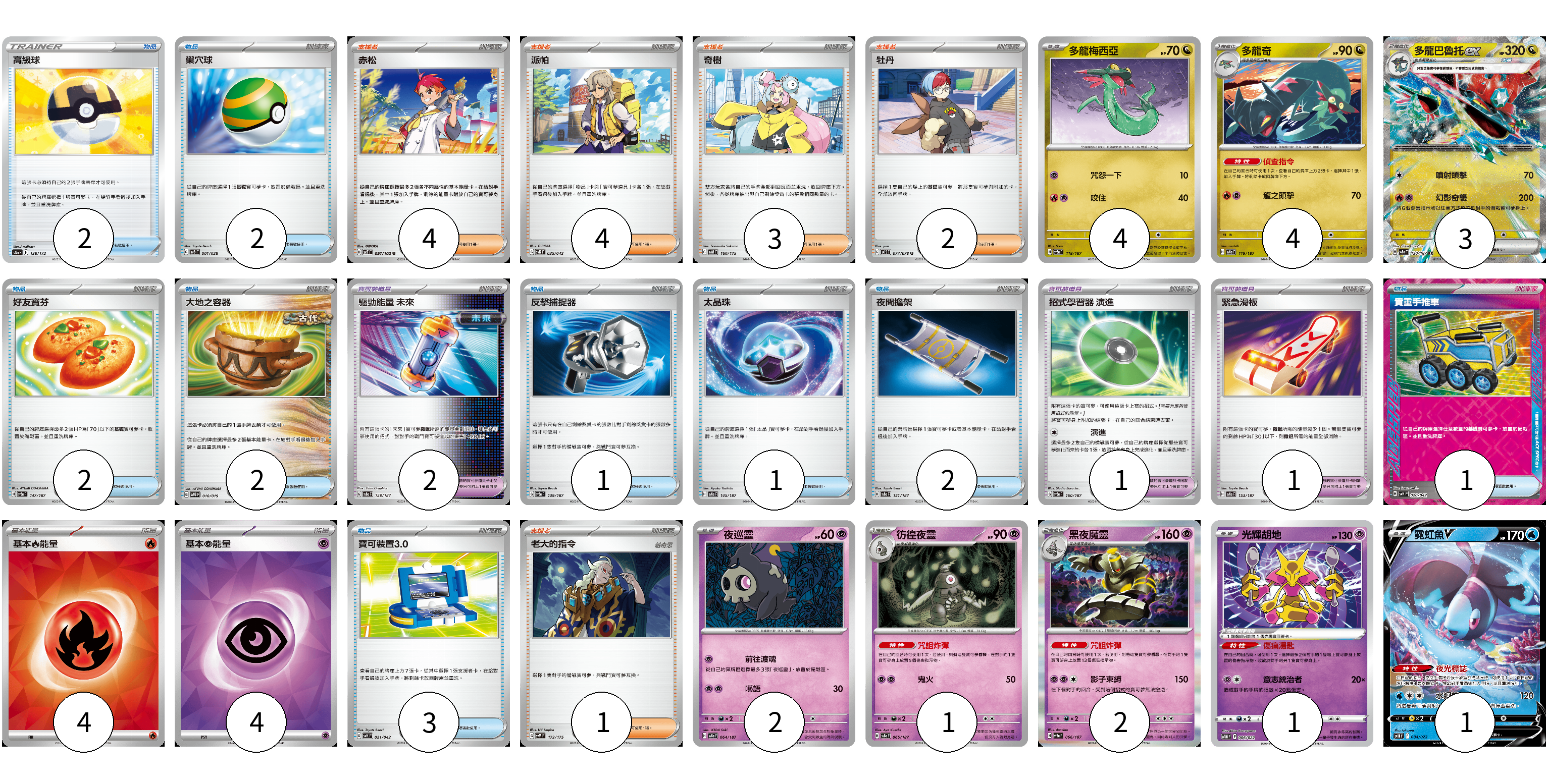 牌組構築方案 以此牌組為基礎新構築牌組 顯示卡面 顯示列表 寶可夢卡(18) 4 4 3 2 1 2 1 1 寶可夢道具(4) 2 1 1 物品卡(16) 2 2 2 2 1 1 2 1 3 支援者卡(14) 4 4 3 2 1 能量卡(8) 4 4 寶可夢卡(18) 卡牌名稱 張數 卡牌名稱 張數 多龍梅西亞 SV8a 118/187 04 多龍奇 SV8a 119/187 04 多龍巴魯托ex SV8a 120/187 03 夜巡靈 SV8a 064/187 02 彷徨夜靈 SV8a 065/187 01 黑夜魔靈 SV8a 066/187 02 光輝胡地 SVTM 006/022 01 霓虹魚V SVHK 004/022 01 寶可夢道具(4) 卡牌名稱 張數 卡牌名稱 張數 驅勁能量 未來 SV8a 158/187 02 招式學習器 演進 SV8a 160/187 01 緊急滑板 SV8a 153/187 01 物品卡(16) 卡牌名稱 張數 卡牌名稱 張數 高級球 S12a 138/172 02 巢穴球 SVB 001/028 02 好友寶芬 SV8a 147/187 02 大地之容器 SVTG 010/019 02 反擊捕捉器 SV8a 139/187 01 太晶珠 SV8a 145/187 01 夜間擔架 SV8a 151/187 02 貴重手推車 SVK 020/042 01 寶可裝置3.0 SVK 021/042 03 支援者卡(14) 卡牌名稱 張數 卡牌名稱 張數 赤松 SV7 097/102 04 派帕 SVK 035/042 04 奇樹 SVM 160/175 03 牡丹 SV1S 077/078 02 老大的指令 SVM 172/175 01 能量卡(8) 卡牌名稱 張數 卡牌名稱 張數 基本【火】能量 SVM FIR 04 基本【超】能量 SVM PSY 04 以此牌組為基礎新構築牌組 牌組編碼 WeQDnm-nveQVb-YdscXm copy 列印牌組單 牌組編碼已複製 分享至SNS