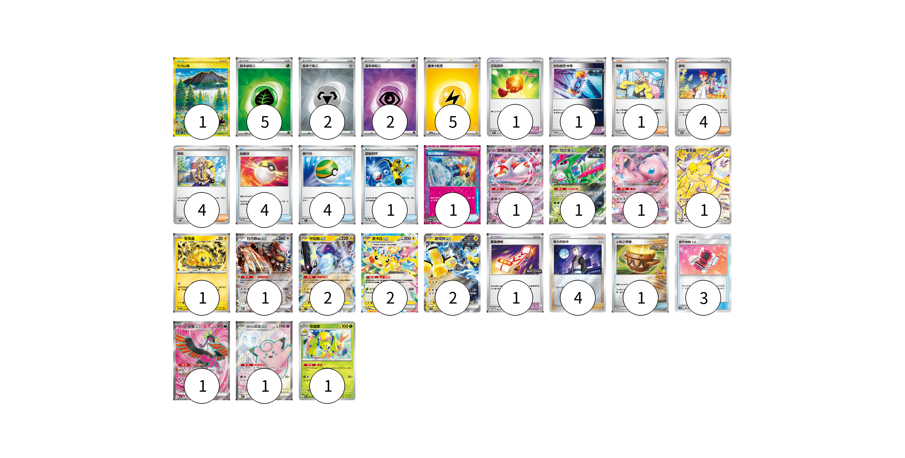 牌組構築方案 以此牌組為基礎新構築牌組 顯示卡面 顯示列表 寶可夢卡(15) 1 1 1 1 1 1 2 2 2 1 1 1 寶可夢道具(3) 1 1 1 物品卡(14) 4 4 1 1 1 3 支援者卡(13) 1 4 4 4 競技場卡(1) 1 能量卡(14) 5 2 2 5 寶可夢卡(15) 卡牌名稱 張數 卡牌名稱 張數 拉帝亞斯ex SV7a 019/064 01 鐵斑葉ex SV5M 016/071 01 夢幻ex SV2a 151/165 01 電電蟲 SV7 108/102 01 電電蟲 SV7 032/102 01 月月熊 赫月ex SV8a 134/187 01 密勒頓ex SV1V 037/078 02 皮卡丘ex SV8 033/106 02 鐵臂膀ex SV4M 027/066 02 吉雉雞ex SV6a 081/064 01 莉莉艾的皮皮ex SV9 115/100 01 電蜘蛛 SV6a 002/064 01 寶可夢道具(3) 卡牌名稱 張數 卡牌名稱 張數 勇氣護符 SV2D 067/071 01 驅勁能量 未來 SV5M 065/071 01 緊急滑板 SV-P 140/SV-P 01 物品卡(14) 卡牌名稱 張數 卡牌名稱 張數 高級球 SVOD 012/020 04 巢穴球 SVM 133/175 04 厲害釣竿 SVOD 010/020 01 頂尖捕捉器 SV8a 148/187 01 大地之容器 SV-P 084/SV-P 01 寶可齒輪3.0 AS6b 190/194 03 支援者卡(13) 卡牌名稱 張數 卡牌名稱 張數 奇樹 SVOM 018/021 01 赤松 SV8a 163/187 04 派帕 SVD 137/139 04 老大的指令(赤日) SPZ 020/020 04 競技場卡(1) 卡牌名稱 張數 卡牌名稱 張數 引力山岳 SV8 138/106 01 能量卡(14) 卡牌名稱 張數 卡牌名稱 張數 基本【草】能量 SVK GRA 05 基本【鋼】能量 SVOD MET 02 基本【超】能量 SVOD PSY 02 基本【雷】能量 SVI LIG 05 以此牌組為基礎新構築牌組 牌組編碼 Wepcwd-jpQWRe-YMYMyp copy 列印牌組單 牌組編碼已複製 分享至SNS
