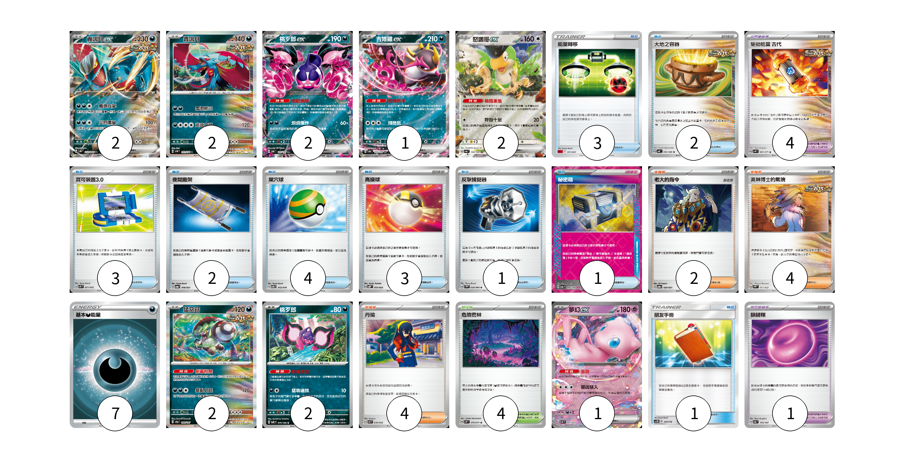 牌組構築方案 以此牌組為基礎新構築牌組 顯示卡面 顯示列表 寶可夢卡(14) 2 2 2 1 2 2 2 1 寶可夢道具(5) 4 1 物品卡(20) 3 2 3 2 4 3 1 1 1 支援者卡(10) 2 4 4 競技場卡(4) 4 能量卡(7) 7 寶可夢卡(14) 卡牌名稱 張數 卡牌名稱 張數 轟鳴月ex SV4K 054/066 02 轟鳴月 SV5K 051/071 02 桃歹郎ex SV8a 105/187 02 吉雉雞ex SV8a 104/187 01 怒鸚哥ex SV4a 154/190 02 猛惡菇 SV8a 099/187 02 桃歹郎 SV8 075/106 02 夢幻ex SVK 001/042 01 寶可夢道具(5) 卡牌名稱 張數 卡牌名稱 張數 驅勁能量 古代 SV5K 065/071 04 鎖鏈糬 SV8a 154/187 01 物品卡(20) 卡牌名稱 張數 卡牌名稱 張數 能量轉移 SDL 011/021 03 大地之容器 SV4K 060/066 02 寶可裝置3.0 SVK 021/042 03 夜間擔架 SVOM 016/021 02 巢穴球 SVTG 012/019 04 高級球 SVQP 015/023 03 反擊捕捉器 SV4M 059/066 01 秘密箱 SV6 092/101 01 朋友手冊 AC2D 145/176 01 支援者卡(10) 卡牌名稱 張數 卡牌名稱 張數 老大的指令 SVOM 020/021 02 奧琳博士的氣魄 SVHK 017/022 04 丹瑜 SVK 030/042 04 競技場卡(4) 卡牌名稱 張數 卡牌名稱 張數 危險密林 SV5K 070/071 04 能量卡(7) 卡牌名稱 張數 卡牌名稱 張數 基本【惡】能量 SI DAR 07 以此牌組為基礎新構築牌組 牌組編碼 WfZucu-rGqgcs-VwzNJk copy 列印牌組單 牌組編碼已複製 分享至SNS