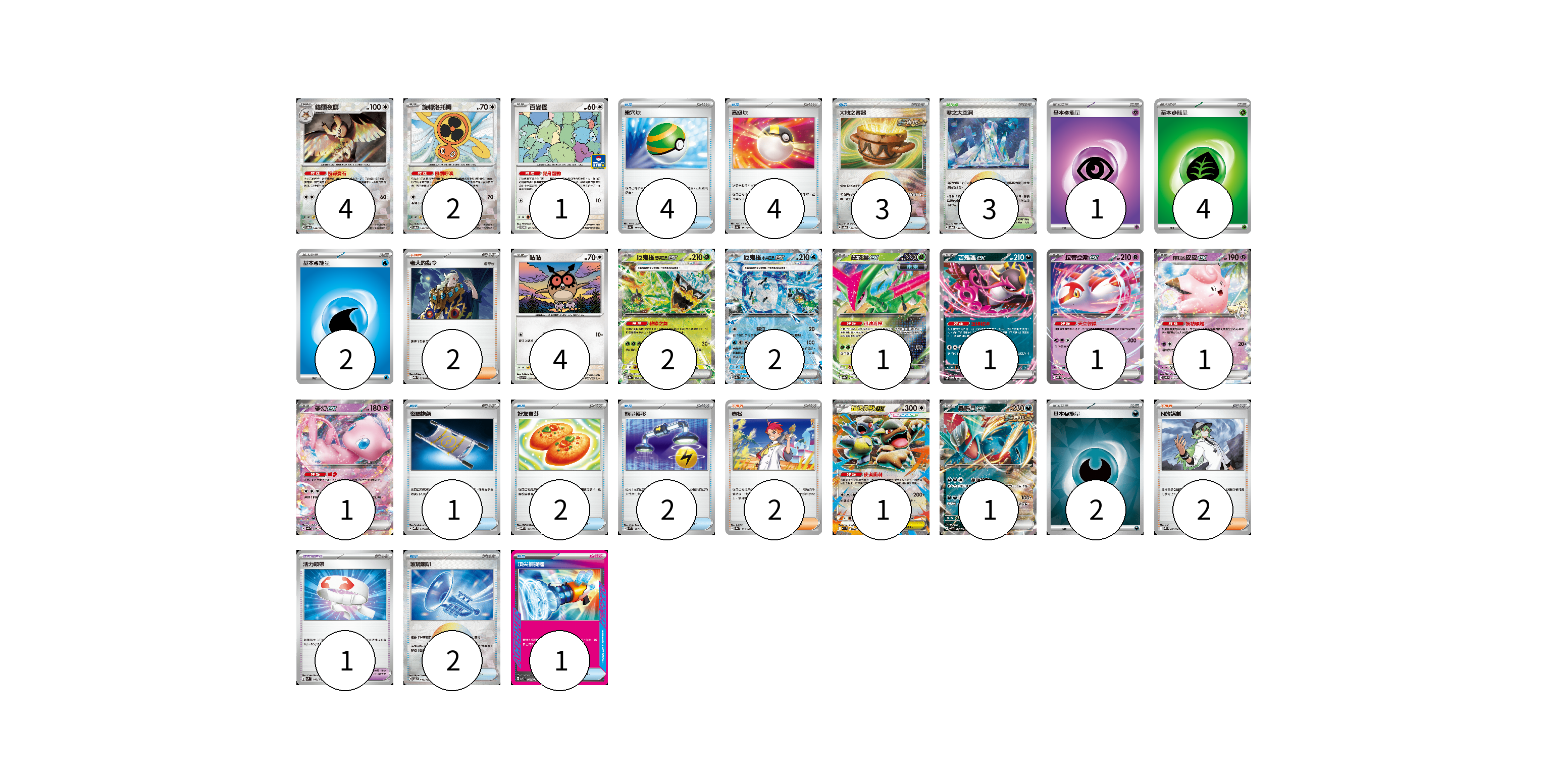牌組構築方案 以此牌組為基礎新構築牌組 顯示卡面 顯示列表 寶可夢卡(22) 4 2 1 4 2 2 1 1 1 1 1 1 1 寶可夢道具(1) 1 物品卡(19) 4 4 3 1 2 2 2 1 支援者卡(6) 2 2 2 競技場卡(3) 3 能量卡(9) 1 4 2 2 寶可夢卡(22) 卡牌名稱 張數 卡牌名稱 張數 貓頭夜鷹 SV8a 128/187 04 旋轉洛托姆 SV8a 131/187 02 百變怪 SV-P 111/SV-P 01 咕咕 SV7 076/102 04 厄鬼椪 碧草面具ex SV8a 020/187 02 厄鬼椪 水井面具ex SV8a 050/187 02 鐵斑葉ex SV8a 016/187 01 吉雉雞ex SVOD 004/020 01 拉帝亞斯ex MBD 003/022 01 莉莉艾的皮皮ex SV9 033/100 01 夢幻ex SV4a 076/190 01 超級袋獸ex M1S 051/063 01 轟鳴月ex SV4K 054/066 01 寶可夢道具(1) 卡牌名稱 張數 卡牌名稱 張數 活力頭帶 SVM 140/175 01 物品卡(19) 卡牌名稱 張數 卡牌名稱 張數 巢穴球 SV4a 159/190 04 高級球 SV4a 161/190 04 大地之容器 SV8a 143/187 03 夜間擔架 MBD 016/022 01 好友寶芬 MBD 013/022 02 能量轉移 SVM 127/175 02 玻璃喇叭 SV8a 140/187 02 頂尖捕捉器 MBG 014/022 01 支援者卡(6) 卡牌名稱 張數 卡牌名稱 張數 老大的指令 MBG 021/022 02 赤松 SV8a 163/187 02 N的謀劃 SV11B 083/086 02 競技場卡(3) 卡牌名稱 張數 卡牌名稱 張數 零之大空洞 SV8a 182/187 03 能量卡(9) 卡牌名稱 張數 卡牌名稱 張數 基本超能量 sv-p PSY 01 基本草能量 sv-p GRA 04 基本水能量 sv-p WAT 02 基本【惡】能量 SVM DAR 02 以此牌組為基礎新構築牌組 牌組編碼 WfyPgH-ryjrCT-HyIcKX copy 列印牌組單 牌組編碼已複製 分享至SNS