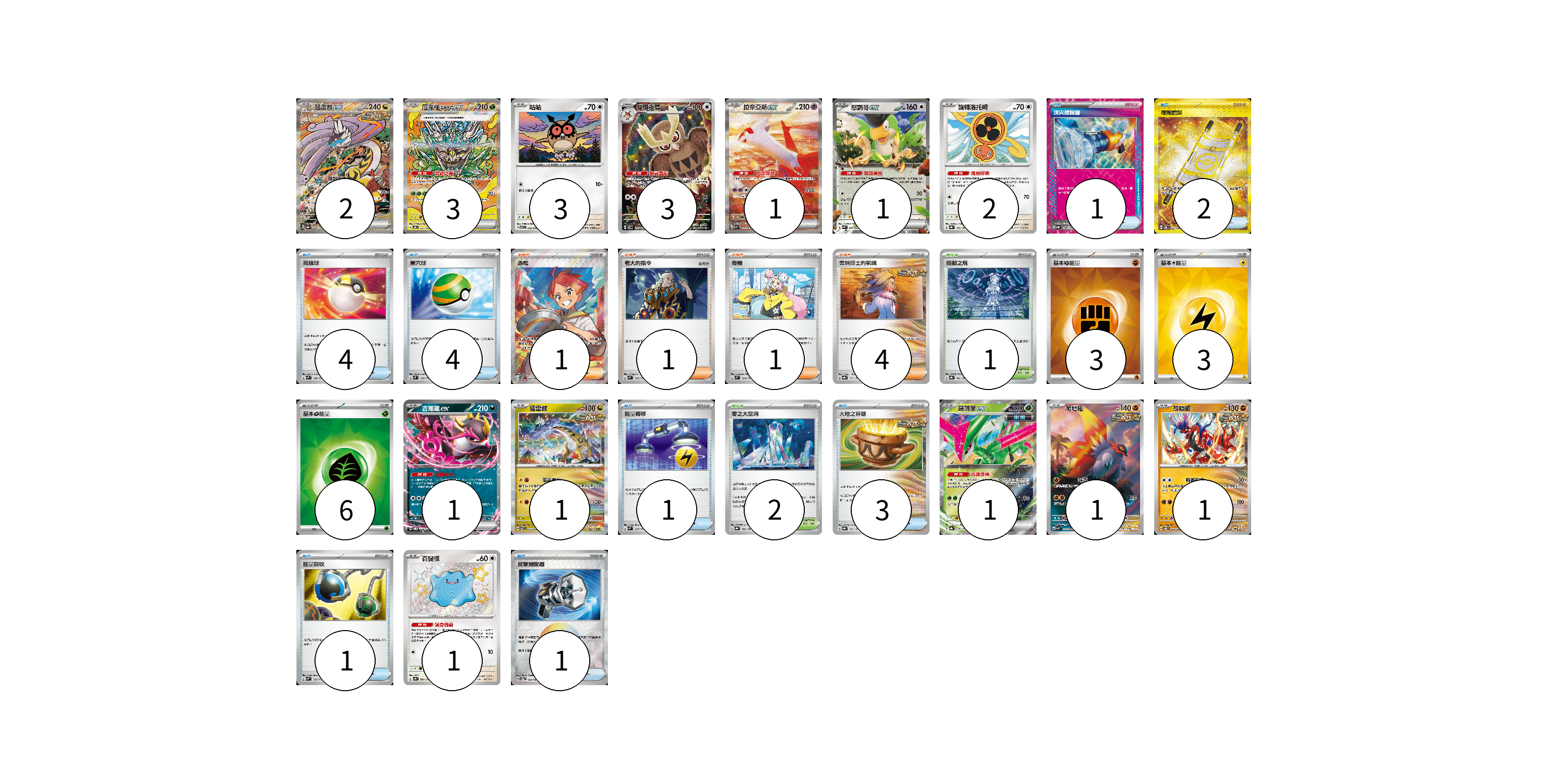 牌組構築方案 以此牌組為基礎新構築牌組 顯示卡面 顯示列表 寶可夢卡(21) 2 3 3 3 1 1 2 1 1 1 1 1 1 物品卡(17) 1 2 4 4 1 3 1 1 支援者卡(7) 1 1 1 4 競技場卡(3) 1 2 能量卡(12) 3 3 6 寶可夢卡(21) 卡牌名稱 張數 卡牌名稱 張數 猛雷鼓ex SV8a 222/187 02 厄鬼椪 碧草面具ex SV8a 201/187 03 咕咕 SV7 076/102 03 貓頭夜鷹 SV7 114/102 03 拉帝亞斯ex SV7a 087/064 01 怒鸚哥ex SVK 006/042 01 旋轉洛托姆 SV8a 131/187 02 吉雉雞ex SVOM 009/021 01 猛雷鼓 SV7 075/102 01 鐵斑葉ex SV8a 016/187 01 爬地翅 SV4K 074/066 01 故勒頓 SV8 069/106 01 百變怪 SV4a 309/190 01 物品卡(17) 卡牌名稱 張數 卡牌名稱 張數 頂尖捕捉器 SV8a 148/187 01 夜間擔架 SV8 137/106 02 高級球 SVM 134/175 04 巢穴球 SVM 133/175 04 能量轉移 SVM 127/175 01 大地之容器 SV8a 143/187 03 能量回收 SVM 125/175 01 反擊捕捉器 SV8a 139/187 01 支援者卡(7) 卡牌名稱 張數 卡牌名稱 張數 赤松 SV7 123/102 01 老大的指令 SVM 172/175 01 奇樹 SVM 160/175 01 奧琳博士的氣魄 SV8a 167/187 04 競技場卡(3) 卡牌名稱 張數 卡牌名稱 張數 阻礙之塔 SV8a 181/187 01 零之大空洞 SV8a 182/187 02 能量卡(12) 卡牌名稱 張數 卡牌名稱 張數 基本【鬥】能量 SVK FIG 03 基本【雷】能量 SVK LIG 03 基本【草】能量 SVK GRA 06 以此牌組為基礎新構築牌組 牌組編碼 WgVWfW-gQnAPz-xgOiLZ copy 列印牌組單 牌組編碼已複製 分享至SNS