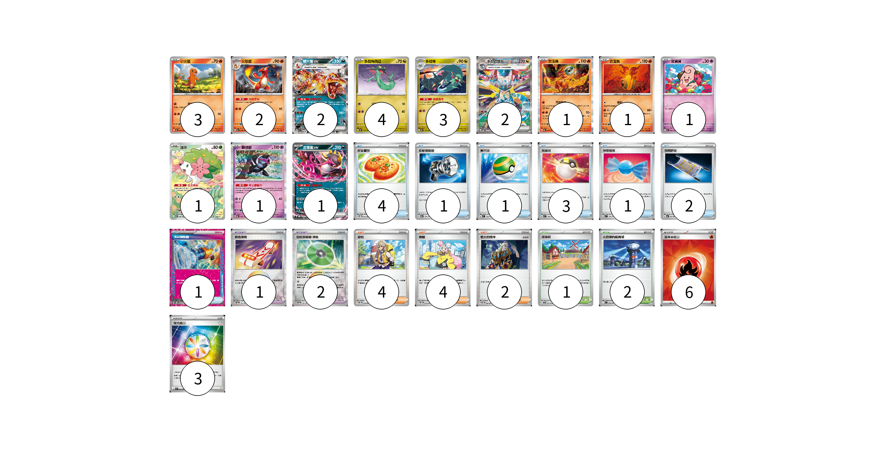 牌組構築方案 以此牌組為基礎新構築牌組 顯示卡面 顯示列表 寶可夢卡(22) 3 2 2 4 3 2 1 1 1 1 1 1 寶可夢道具(3) 1 2 物品卡(13) 4 1 1 3 1 2 1 支援者卡(10) 4 4 2 競技場卡(3) 1 2 能量卡(9) 6 3 寶可夢卡(22) 卡牌名稱 張數 卡牌名稱 張數 小火龍 SV4a 025/190 03 火恐龍 SV4a 026/190 02 噴火龍ex SV4a 115/190 02 多龍梅西亞 SV8a 118/187 04 多龍奇 SV8a 119/187 03 多龍巴魯托ex SV8a 221/187 02 古玉魚 SV8a 025/187 01 古玉魚 SV5a 018/066 01 皮寶寶 SV3 042/108 01 謝米 SV9a 066/063 01 願增猿 SV8a 075/187 01 吉雉雞ex SVOD 004/020 01 寶可夢道具(3) 卡牌名稱 張數 卡牌名稱 張數 緊急滑板 SV8a 153/187 01 招式學習器 演進 SV8a 160/187 02 物品卡(13) 卡牌名稱 張數 卡牌名稱 張數 好友寶芬 SVOD 011/020 04 反擊捕捉器 SV8a 139/187 01 巢穴球 SVM 133/175 01 高級球 SVM 134/175 03 神奇糖果 SVM 135/175 01 夜間擔架 SV6a 056/064 02 頂尖捕捉器 SV5M 062/071 01 支援者卡(10) 卡牌名稱 張數 卡牌名稱 張數 派帕 SVOD 018/020 04 奇樹 SVOD 016/020 04 老大的指令 SVOM 020/021 02 競技場卡(3) 卡牌名稱 張數 卡牌名稱 張數 深缽鎮 SVF 036/038 01 火箭隊的監視塔 SV10 096/098 02 能量卡(9) 卡牌名稱 張數 卡牌名稱 張數 基本【火】能量 SVK FIR 06 夜光能量 SVK 042/042 03 以此牌組為基礎新構築牌組 牌組編碼 WmGBxz-NelhGZ-evpAQJ copy 列印牌組單 牌組編碼已複製 分享至SNS