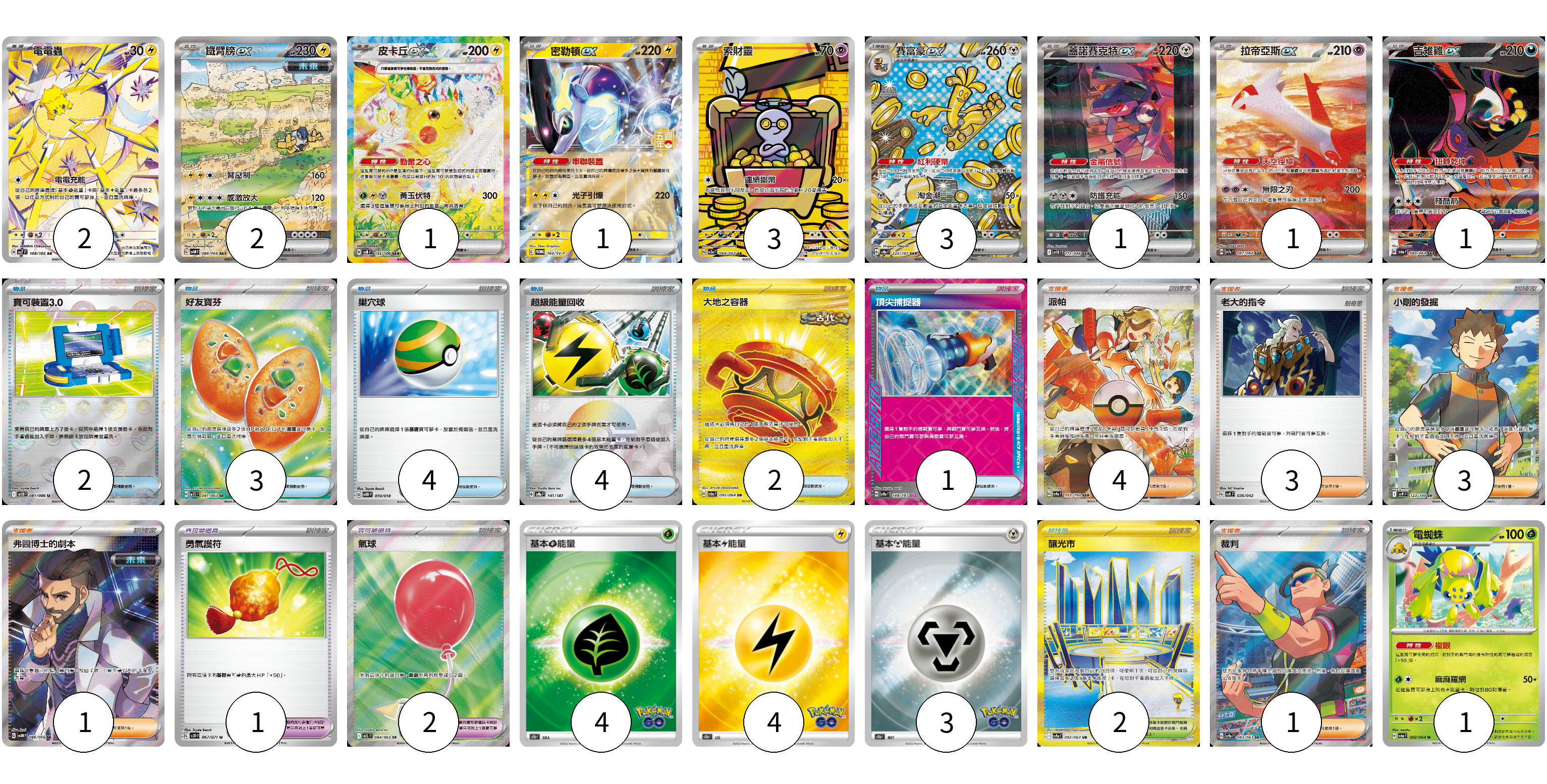 牌組構築方案 以此牌組為基礎新構築牌組 顯示卡面 顯示列表 寶可夢卡(16) 2 2 1 1 3 3 1 1 1 1 寶可夢道具(3) 1 2 物品卡(16) 2 3 4 4 2 1 支援者卡(12) 4 3 3 1 1 競技場卡(2) 2 能量卡(11) 4 4 3 寶可夢卡(16) 卡牌名稱 張數 卡牌名稱 張數 電電蟲 SV7 108/102 02 鐵臂膀ex SV4M 088/066 02 皮卡丘ex SV8 132/106 01 密勒頓ex SV-P 164/SV-P 01 索財靈 SV3a 068/062 03 賽富豪ex SV8a 220/187 03 蓋諾賽克特ex SV11B 172/086 01 拉帝亞斯ex SV7a 087/064 01 吉雉雞ex SV6a 089/064 01 電蜘蛛 SV6a 002/064 01 寶可夢道具(3) 卡牌名稱 張數 卡牌名稱 張數 勇氣護符 SV2D 067/071 01 氣球 M1L 084/063 02 物品卡(16) 卡牌名稱 張數 卡牌名稱 張數 寶可裝置3.0 SV11B 081/086 02 好友寶芬 M1S 081/063 03 巢穴球 SVTH 010/018 04 超級能量回收 SV8a 141/187 04 大地之容器 SV6a 093/064 02 頂尖捕捉器 SV8a 148/187 01 支援者卡(12) 卡牌名稱 張數 卡牌名稱 張數 派帕 SV4a 353/190 04 老大的指令 SVK 036/042 03 小剛的發掘 SV9 123/100 03 弗圖博士的劇本 SV4M 086/066 01 裁判 SV9a 083/063 01 競技場卡(2) 卡牌名稱 張數 卡牌名稱 張數 釀光市 SV9a 092/063 02 能量卡(11) 卡牌名稱 張數 卡牌名稱 張數 基本草能量 S10b GRA 04 基本雷能量 S10b LIG 04 基本鋼能量 S10b MET 03 以此牌組為基礎新構築牌組 牌組編碼 WmHqkw-CEyqIY-CHNBek copy 列印牌組單 牌組編碼已複製 分享至SNS