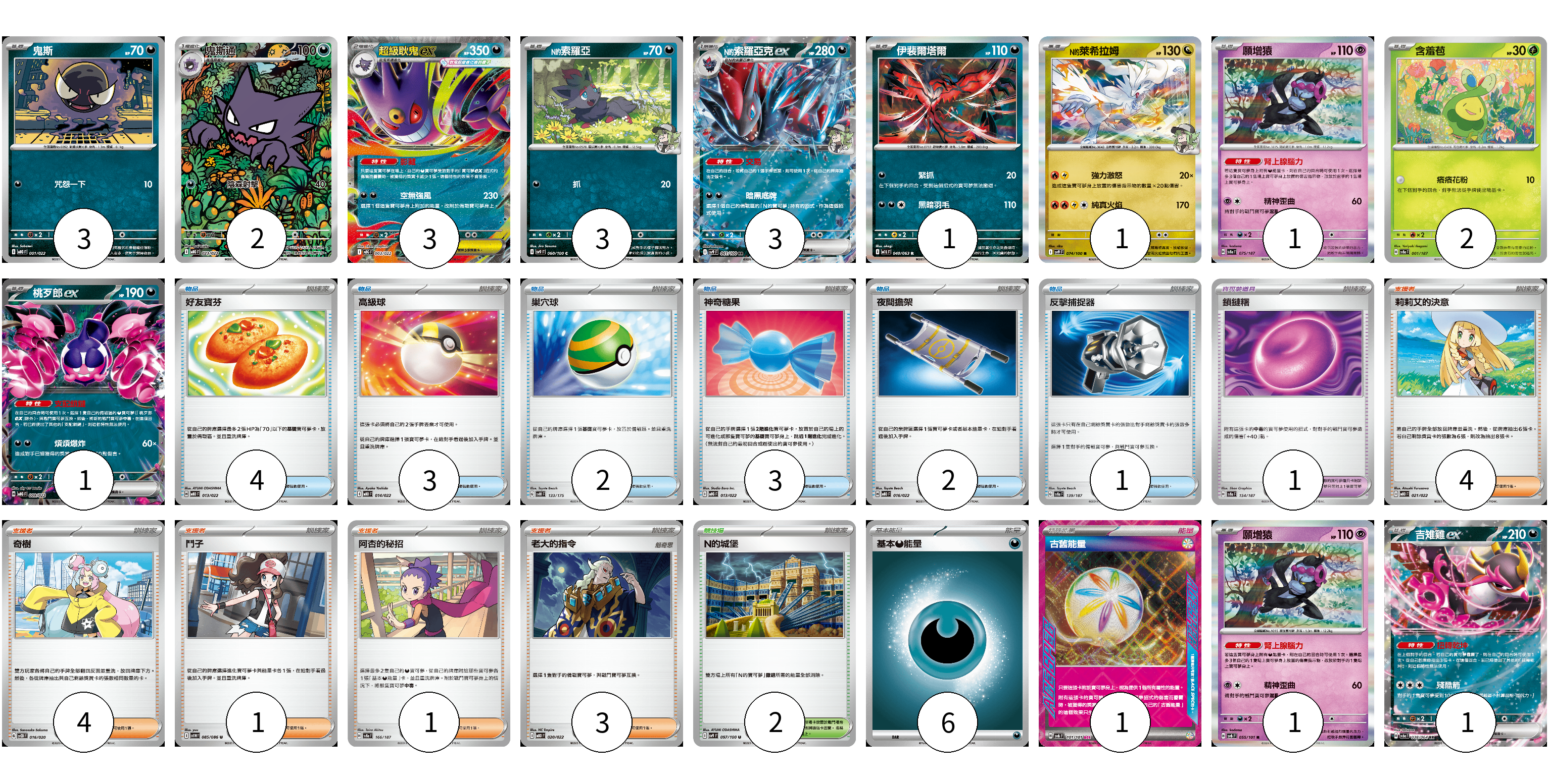 牌組構築方案 以此牌組為基礎新構築牌組 顯示卡面 顯示列表 寶可夢卡(22) 3 2 3 3 3 1 1 1 2 1 1 1 寶可夢道具(1) 1 物品卡(15) 4 3 2 3 2 1 支援者卡(13) 4 4 1 1 3 競技場卡(2) 2 能量卡(7) 6 1 寶可夢卡(22) 卡牌名稱 張數 卡牌名稱 張數 鬼斯 MBG 001/022 03 鬼斯通 MBG 023/022 02 超級耿鬼ex MBG 003/022 03 N的索羅亞 SV9 060/100 03 N的索羅亞克ex SV9 061/100 03 伊裴爾塔爾 M1L 040/063 01 N的萊希拉姆 SV9 074/100 01 願增猿 SV8a 075/187 01 含羞苞 SV8a 001/187 02 桃歹郎ex MBG 009/022 01 願增猿 SV6 055/101 01 吉雉雞ex SV6a 038/064 01 寶可夢道具(1) 卡牌名稱 張數 卡牌名稱 張數 鎖鏈糬 SV8a 154/187 01 物品卡(15) 卡牌名稱 張數 卡牌名稱 張數 好友寶芬 MBD 013/022 04 高級球 MBD 014/022 03 巢穴球 SVM 133/175 02 神奇糖果 MBG 013/022 03 夜間擔架 MBD 016/022 02 反擊捕捉器 SV8a 139/187 01 支援者卡(13) 卡牌名稱 張數 卡牌名稱 張數 莉莉艾的決意 MBD 021/022 04 奇樹 SVOD 016/020 04 鬥子 SV11W 085/086 01 阿杏的秘招 SV8a 166/187 01 老大的指令 MBD 020/022 03 競技場卡(2) 卡牌名稱 張數 卡牌名稱 張數 N的城堡 SV9 097/100 02 能量卡(7) 卡牌名稱 張數 卡牌名稱 張數 基本【惡】能量 MBG DAR 06 古舊能量 SV6 101/101 01 以此牌組為基礎新構築牌組 牌組編碼 WpbGtl-zloyqF-VEUnxW copy 列印牌組單 牌組編碼已複製 分享至SNS