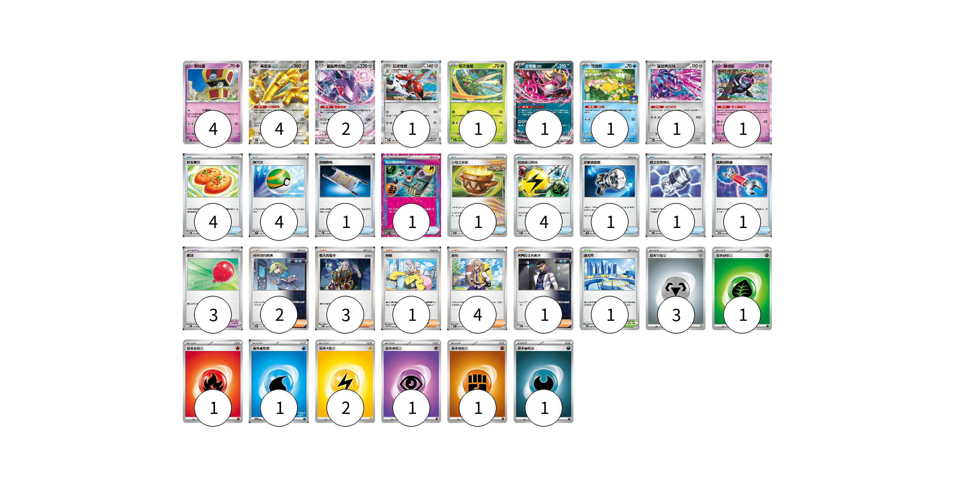 牌組構築方案 以此牌組為基礎新構築牌組 顯示卡面 顯示列表 寶可夢卡(16) 4 4 2 1 1 1 1 1 1 寶可夢道具(3) 3 物品卡(18) 4 4 1 1 1 4 1 1 1 支援者卡(11) 2 3 1 4 1 競技場卡(1) 1 能量卡(11) 3 1 1 1 2 1 1 1 寶可夢卡(16) 卡牌名稱 張數 卡牌名稱 張數 索財靈 SV7a 024/064 04 賽富豪ex SV8a 117/187 04 蓋諾賽克特ex SV11B 069/086 02 巨鉗螳螂 SV4a 129/190 01 飛天螳螂 SV2a 123/165 01 吉雉雞ex SVOM 009/021 01 可達鴨 SV-P 220/SV-P 01 蓋諾賽克特 SV6a 040/064 01 願增猿 SV8a 075/187 01 寶可夢道具(3) 卡牌名稱 張數 卡牌名稱 張數 氣球 MBG 019/022 03 物品卡(18) 卡牌名稱 張數 卡牌名稱 張數 好友寶芬 MBD 013/022 04 巢穴球 SVM 133/175 04 夜間擔架 MBG 017/022 01 能量輸送PRO SV7a 052/064 01 大地之容器 SV8a 143/187 01 超級能量回收 SV8a 141/187 04 反擊捕捉器 SV4M 059/066 01 鐵之防禦強化 M1L 057/063 01 道具拆除器 SV11W 080/086 01 支援者卡(11) 卡牌名稱 張數 卡牌名稱 張數 暗碼迷的解讀 SV8a 165/187 02 老大的指令 MBD 020/022 03 奇樹 SVOD 016/020 01 派帕 SVK 035/042 04 弗圖博士的劇本 SVHM 021/022 01 競技場卡(1) 卡牌名稱 張數 卡牌名稱 張數 釀光市 SV9 098/100 01 能量卡(11) 卡牌名稱 張數 卡牌名稱 張數 基本【鋼】能量 SVTH MET 03 基本【草】能量 SVTM GRA 01 基本【火】能量 SVTL FIR 01 基本【水】能量 SVI WAT 01 基本【雷】能量 SVTR LIG 02 基本【超】能量 SVTS PSY 01 基本【鬥】能量 SVTG FIG 01 基本【惡】能量 SVF DAR 01 以此牌組為基礎新構築牌組 牌組編碼 WtZwJW-RDgaHd-CnnxQO copy 列印牌組單 牌組編碼已複製 分享至SNS