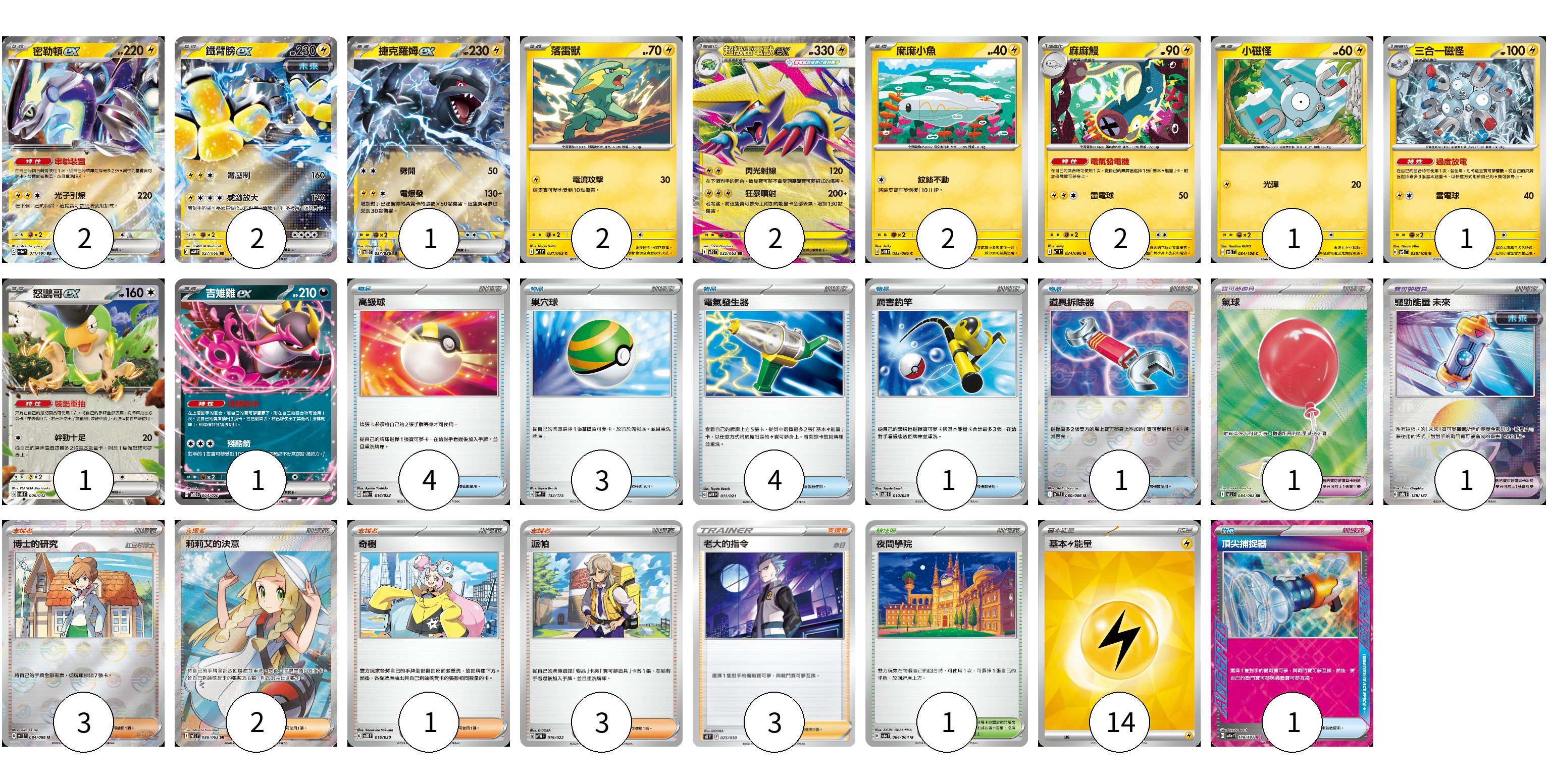 牌組構築方案 以此牌組為基礎新構築牌組 顯示卡面 顯示列表 寶可夢卡(17) 2 2 1 2 2 2 2 1 1 1 1 寶可夢道具(2) 1 1 物品卡(14) 4 3 4 1 1 1 支援者卡(12) 3 2 1 3 3 競技場卡(1) 1 能量卡(14) 14 寶可夢卡(17) 卡牌名稱 張數 卡牌名稱 張數 密勒頓ex SV4a 071/190 02 鐵臂膀ex SV4M 027/066 02 捷克羅姆ex SV11B 037/086 01 落雷獸 M1S 031/063 02 超級雷電獸ex M1S 032/063 02 麻麻小魚 SV11B 033/086 02 麻麻鰻 SV11B 034/086 02 小磁怪 SV8 034/106 01 三合一磁怪 SV8 035/106 01 怒鸚哥ex SVK 006/042 01 吉雉雞ex SVOD 004/020 01 寶可夢道具(2) 卡牌名稱 張數 卡牌名稱 張數 氣球 M1L 084/063 01 驅勁能量 未來 SV8a 158/187 01 物品卡(14) 卡牌名稱 張數 卡牌名稱 張數 高級球 MBD 014/022 04 巢穴球 SVM 133/175 03 電氣發生器 SVTR 011/021 04 厲害釣竿 SVOD 010/020 01 道具拆除器 SV11W 080/086 01 頂尖捕捉器 SV8a 148/187 01 支援者卡(12) 卡牌名稱 張數 卡牌名稱 張數 博士的研究 SV11B 084/086 03 莉莉艾的決意 M1L 086/063 02 奇樹 SVOD 016/020 01 派帕 SVTM 019/022 03 老大的指令(赤日) SK 025/030 03 競技場卡(1) 卡牌名稱 張數 卡牌名稱 張數 夜間學院 SV6a 064/064 01 能量卡(14) 卡牌名稱 張數 卡牌名稱 張數 基本【雷】能量 SVQP LIG 14 以此牌組為基礎新構築牌組 牌組編碼 WusOZa-ITLBJr-OlJYGa copy 列印牌組單 牌組編碼已複製 分享至SNS