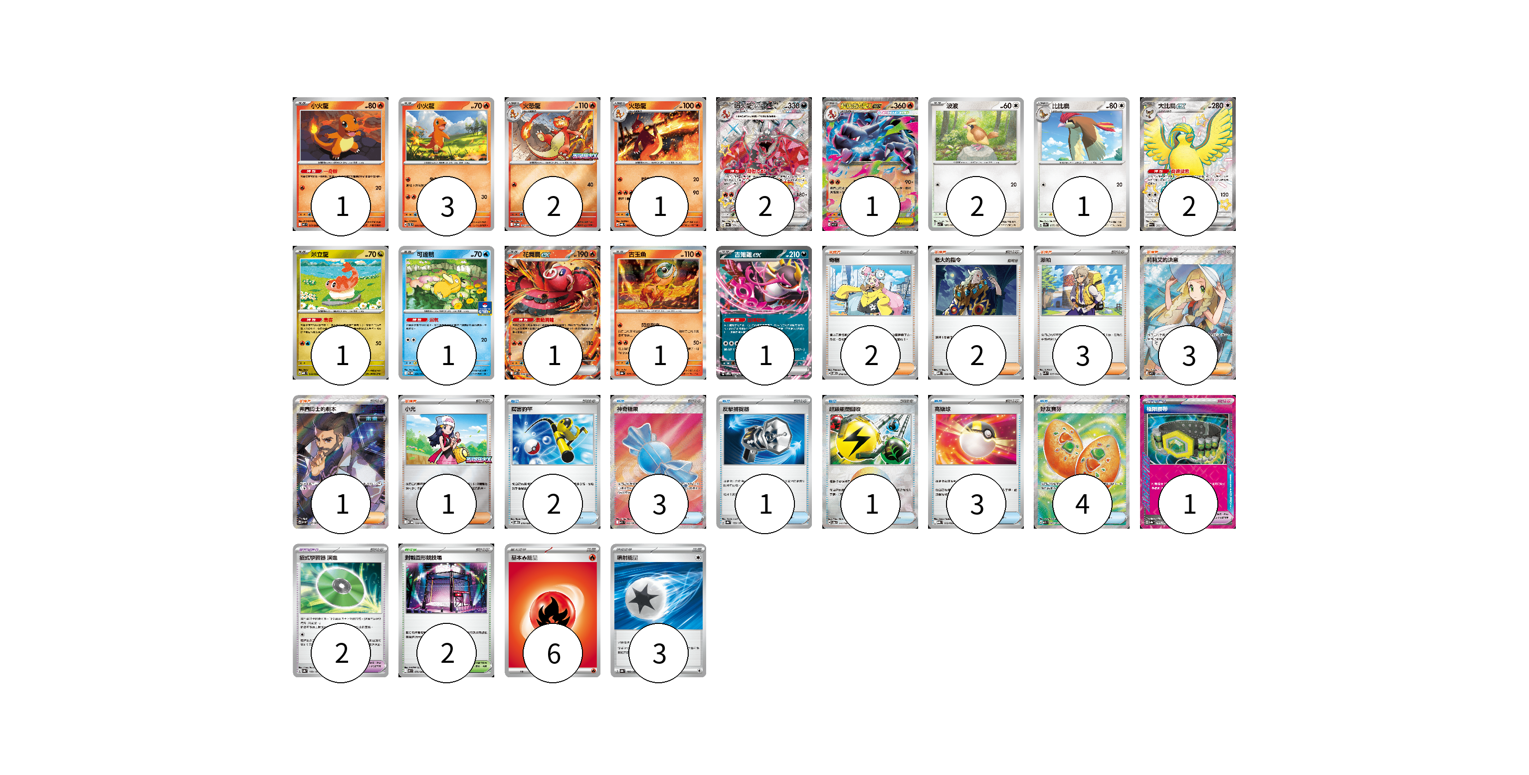 牌組構築方案 以此牌組為基礎新構築牌組 顯示卡面 顯示列表 寶可夢卡(20) 1 3 2 1 2 1 2 1 2 1 1 1 1 1 寶可夢道具(3) 1 2 物品卡(14) 2 3 1 1 3 4 支援者卡(12) 2 2 3 3 1 1 競技場卡(2) 2 能量卡(9) 6 3 寶可夢卡(20) 卡牌名稱 張數 卡牌名稱 張數 小火龍 M2 011/080 01 小火龍 SVTL 001/021 03 火恐龍 M-P 021/M-P 02 火恐龍 SVQL 002/022 01 噴火龍ex SV4a 331/190 02 超級噴火龍Xex M2 013/080 01 波波 SV3 087/108 02 比比鳥 SV2a 017/165 01 大比鳥ex SV4a 335/190 02 米立龍 MBD 010/022 01 可達鴨 SV-P 220/SV-P 01 花舞鳥ex M2 018/080 01 古玉魚 SV8a 025/187 01 吉雉雞ex SVOM 009/021 01 寶可夢道具(3) 卡牌名稱 張數 卡牌名稱 張數 極限腰帶 SV8a 159/187 01 招式學習器 演進 SV8a 160/187 02 物品卡(14) 卡牌名稱 張數 卡牌名稱 張數 厲害釣竿 SVOD 010/020 02 神奇糖果 M1S 082/063 03 反擊捕捉器 SV8a 139/187 01 超級能量回收 SV8a 141/187 01 高級球 MBG 012/022 03 好友寶芬 M1S 081/063 04 支援者卡(12) 卡牌名稱 張數 卡牌名稱 張數 奇樹 SVOM 018/021 02 老大的指令 MBD 020/022 02 派帕 SVK 035/042 03 莉莉艾的決意 M1L 086/063 03 弗圖博士的劇本 SV4M 086/066 01 小光 M-P 028/M-P 01 競技場卡(2) 卡牌名稱 張數 卡牌名稱 張數 對戰圓形競技場 M2 079/080 02 能量卡(9) 卡牌名稱 張數 卡牌名稱 張數 基本火能量 sv-p FIR 06 噴射能量 SV8a 185/187 03 以此牌組為基礎新構築牌組 牌組編碼 WvHucV-FoXMFI-EvwvpL copy 列印牌組單 牌組編碼已複製 分享至SNS