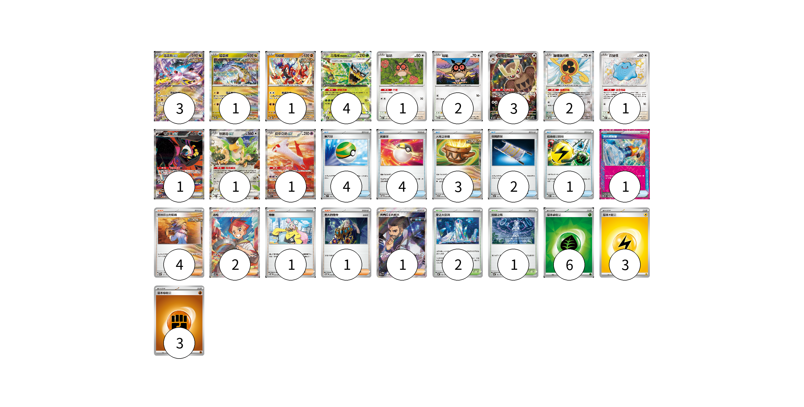 牌組構築方案 以此牌組為基礎新構築牌組 顯示卡面 顯示列表 寶可夢卡(21) 3 1 1 4 1 2 3 2 1 1 1 1 物品卡(15) 4 4 3 2 1 1 支援者卡(9) 4 2 1 1 1 競技場卡(3) 2 1 能量卡(12) 6 3 3 寶可夢卡(21) 卡牌名稱 張數 卡牌名稱 張數 猛雷鼓ex SV8a 124/187 03 猛雷鼓 SV7 075/102 01 故勒頓 SV8 069/106 01 厄鬼椪 碧草面具ex SV8a 020/187 04 咕咕 SV8a 127/187 01 咕咕 SV7 076/102 02 貓頭夜鷹 SV7 114/102 03 旋轉洛托姆 SV8a 131/187 02 百變怪 SV4a 309/190 01 吉雉雞ex SV6a 089/064 01 怒鸚哥ex SV4a 154/190 01 拉帝亞斯ex SV7a 087/064 01 物品卡(15) 卡牌名稱 張數 卡牌名稱 張數 巢穴球 SVM 133/175 04 高級球 SVOD 012/020 04 大地之容器 SVTG 010/019 03 夜間擔架 SV8a 151/187 02 超級能量回收 SV8a 141/187 01 頂尖捕捉器 SV8a 148/187 01 支援者卡(9) 卡牌名稱 張數 卡牌名稱 張數 奧琳博士的氣魄 SV8a 167/187 04 赤松 SV7 123/102 02 奇樹 SVOD 016/020 01 老大的指令 SVOD 019/020 01 弗圖博士的劇本 SV4M 086/066 01 競技場卡(3) 卡牌名稱 張數 卡牌名稱 張數 零之大空洞 SV8a 182/187 02 阻礙之塔 SV8a 181/187 01 能量卡(12) 卡牌名稱 張數 卡牌名稱 張數 基本【草】能量 SVK GRA 06 基本【雷】能量 SVHM LIG 03 基本【鬥】能量 SVHK FIG 03 以此牌組為基礎新構築牌組 牌組編碼 WwVmkp-AvQTUa-kOsPaS copy 列印牌組單 牌組編碼已複製 分享至SNS